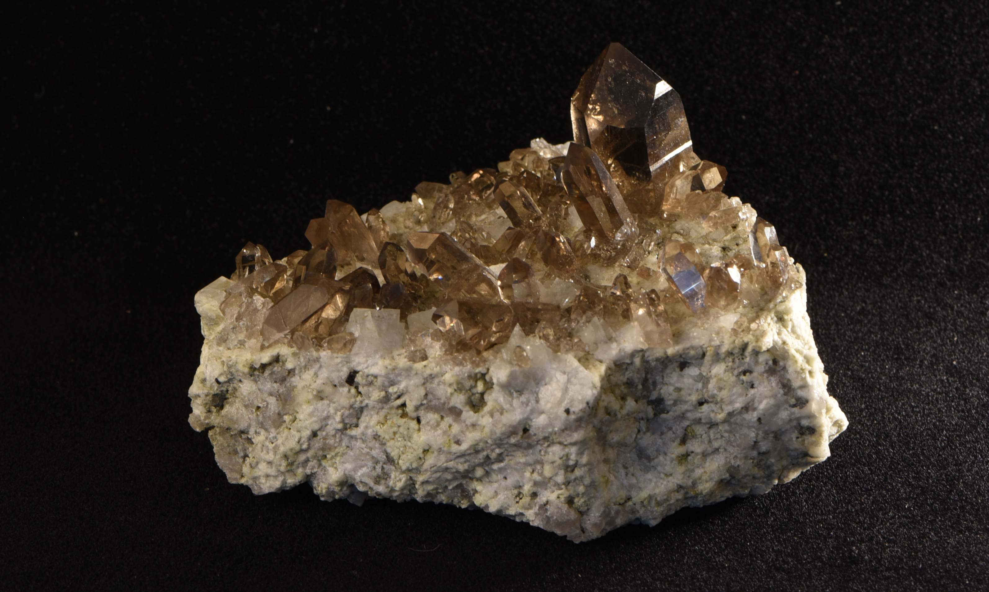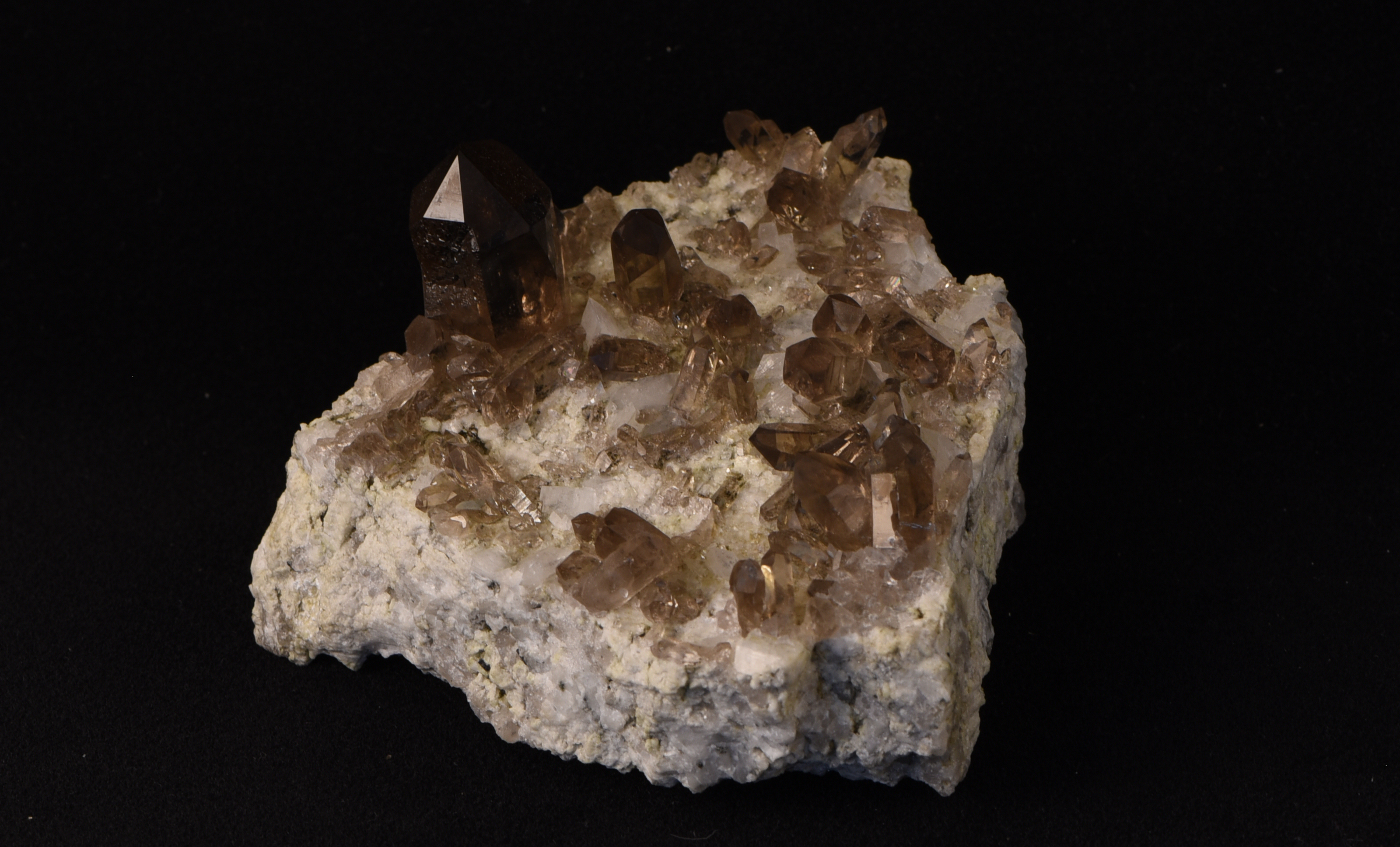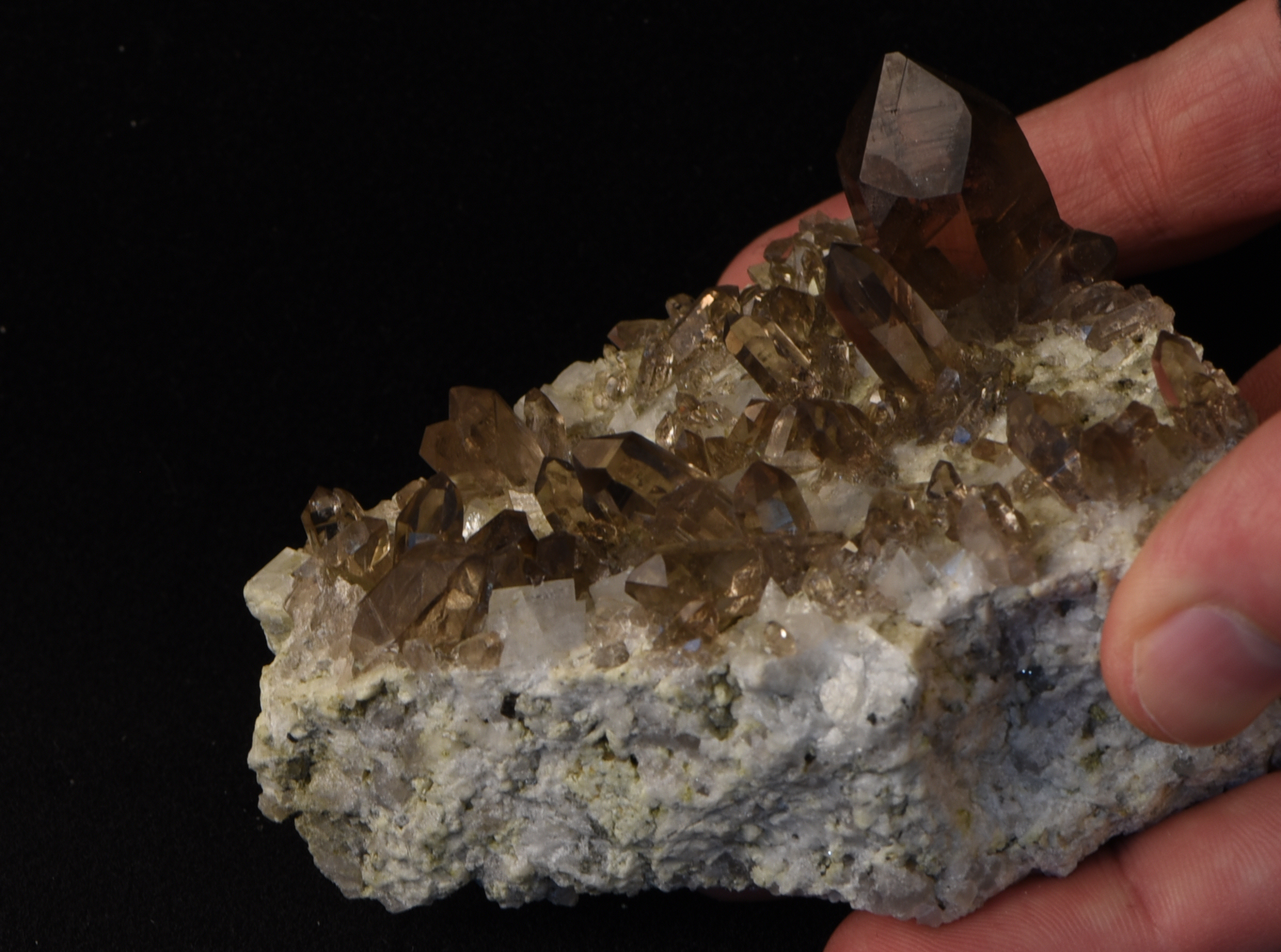Auf dieser Stufe befinden sich sehr viele kleinere Rauchquarz-Spitzen und eine etwas größere Spitze mit einer Länge von 2,5 cm.