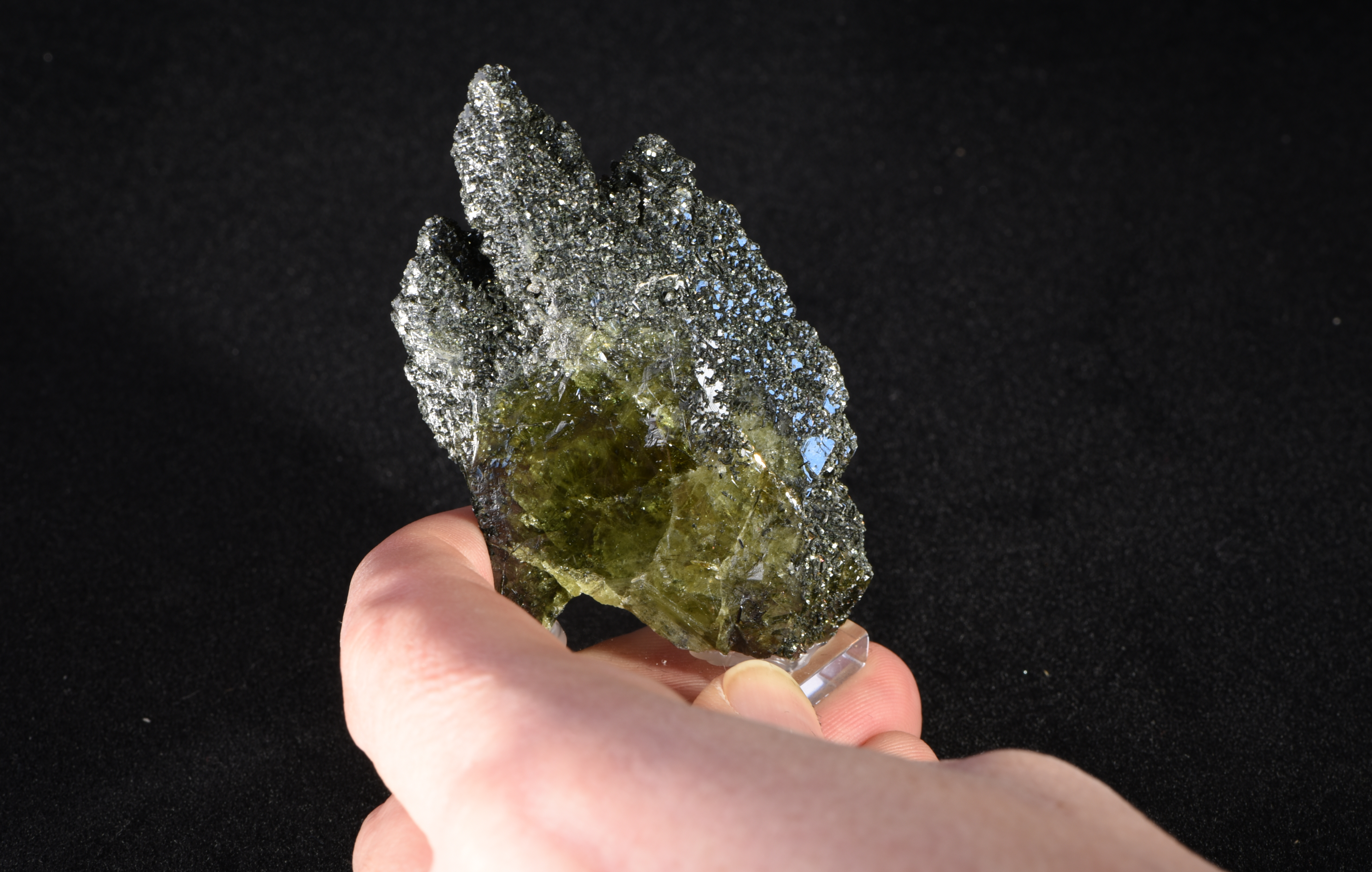 Der 7 cm x 4 cm große Titanit hat ein grasgrünes Fenster und ist an den Spitzen mit Chlorit bedeckt.