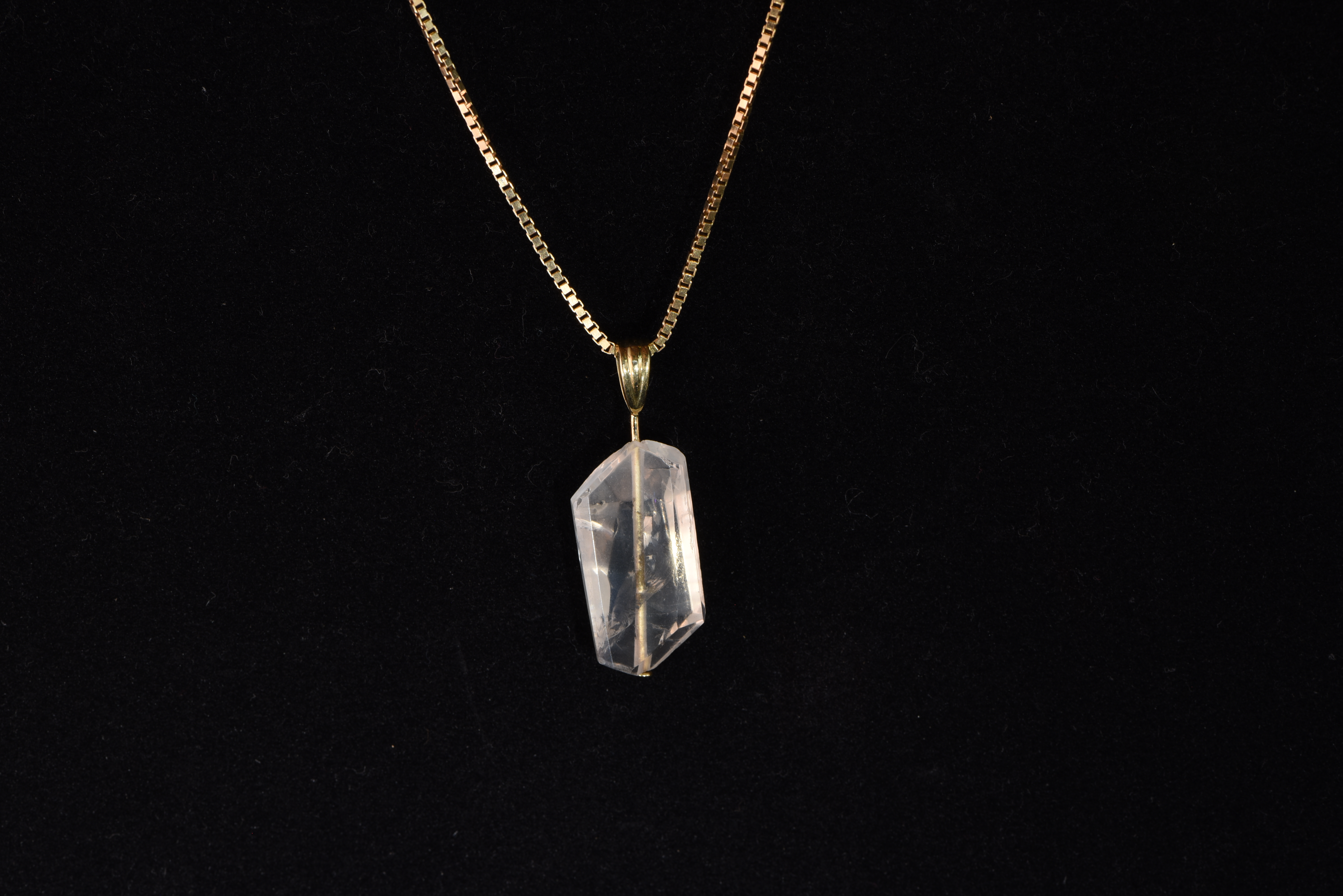 Eine Seltenheit aus dem Zillertal: Der Mondstein-Adular. Der 2,9 cm lange Mondstein wurde mit Facetten versehen und durchbohrt - ein Goldstift befestigt den Stein an der Öse. Der Fundort ist der Mörchnerkar.