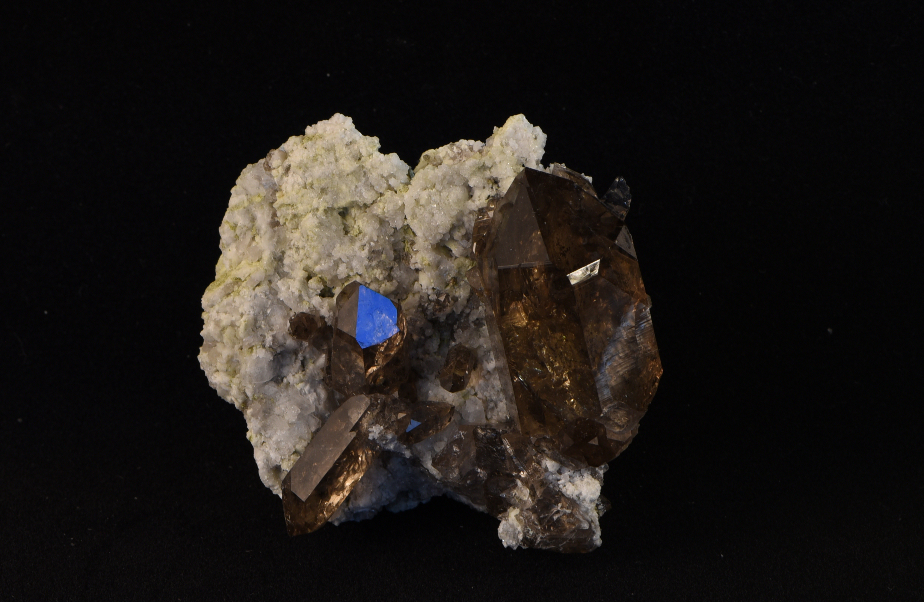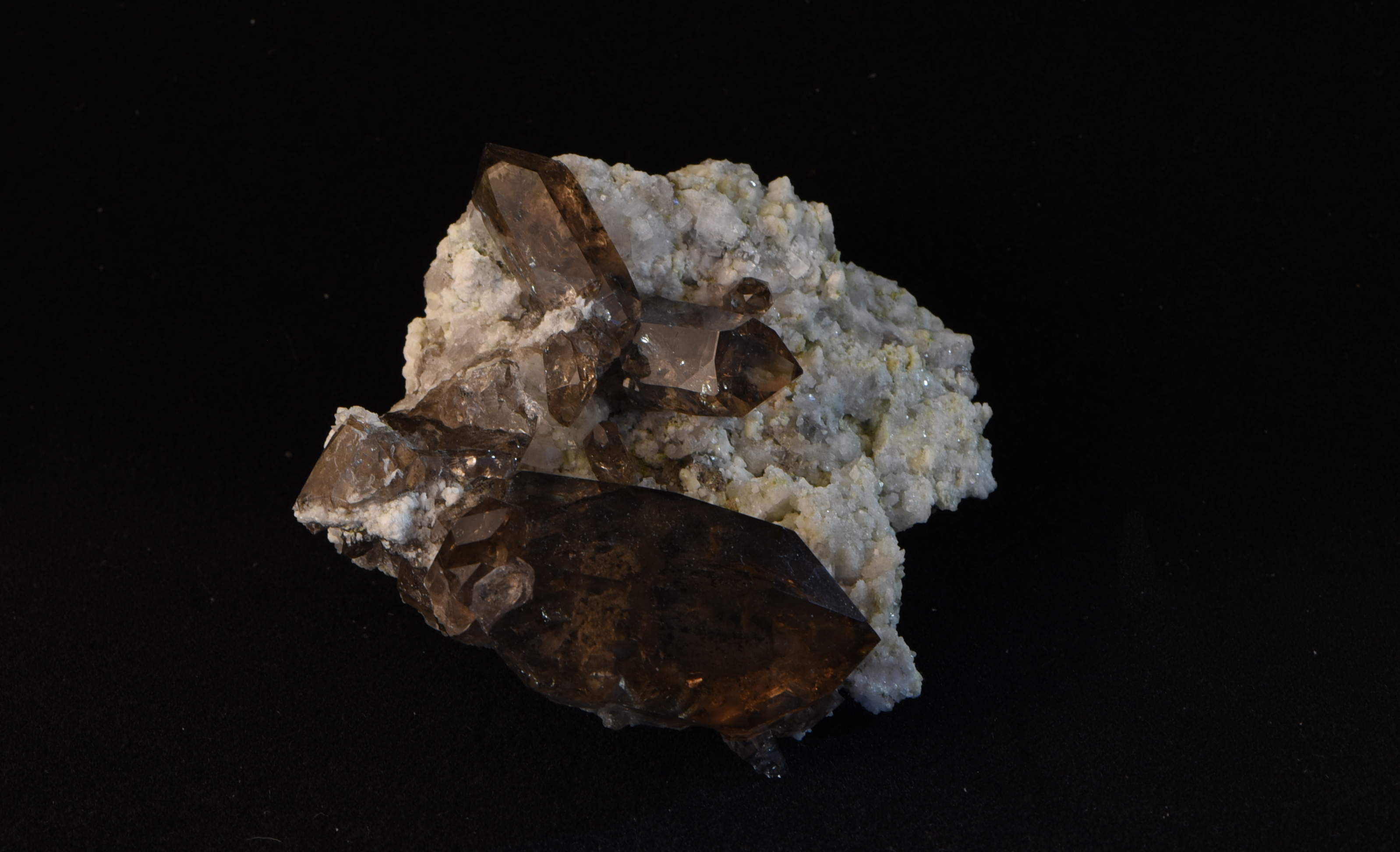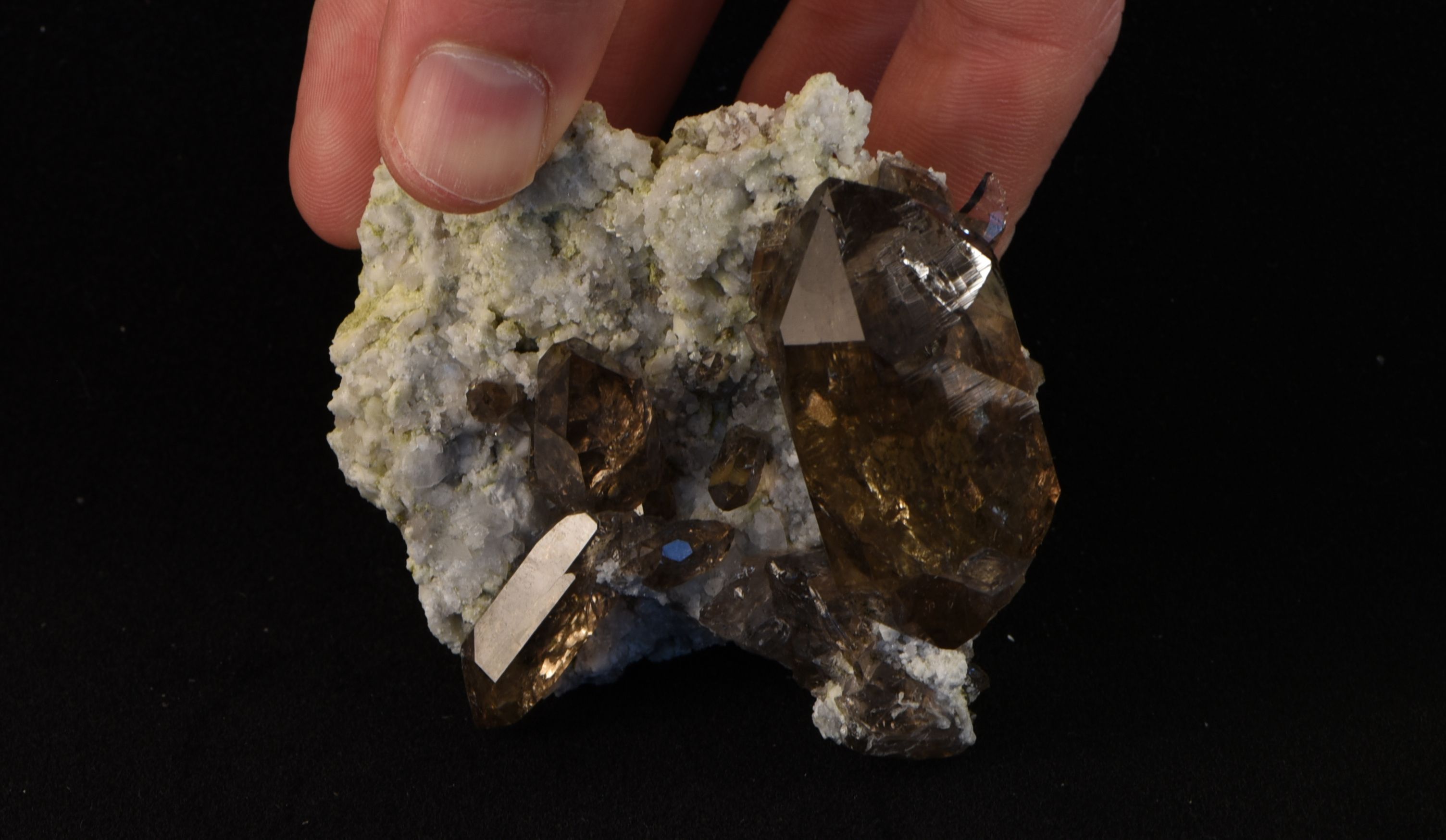 Auf dieser Stufe sitzen 3 relativ große Rauchquarzkristalle - der größte Kristall misst 4,5 cm und ist 2,3 cm dick. Das Grundgestein ist mit weißem Adular bedeckt und sorgt so für einen guten Kontrast zum dunklen Rauchquarz.