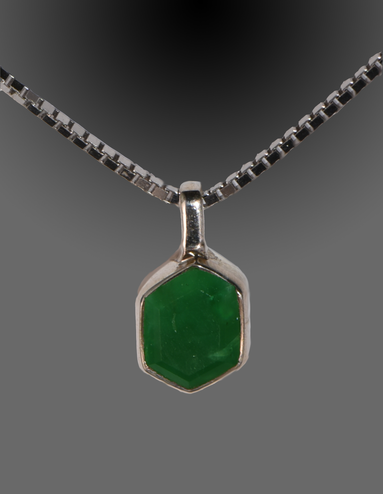 Der Smaragd hat eine Top-Qualität und eine leuchtende, tiefgrüne Farbe, ist an facettiert und in Silber eingefasst (Randfassung, hinten offen). Ein weißer Einschluss auf der Vorderseite des Steines unterstreicht die Natürlichkeit des Anhängers. Der Stein wurde im Smaragdbergbau im Habachtal (Bramberg, Salzburg, Österreich) gefunden. Der Stein ist 1 cm hoch und 7 mm breit.