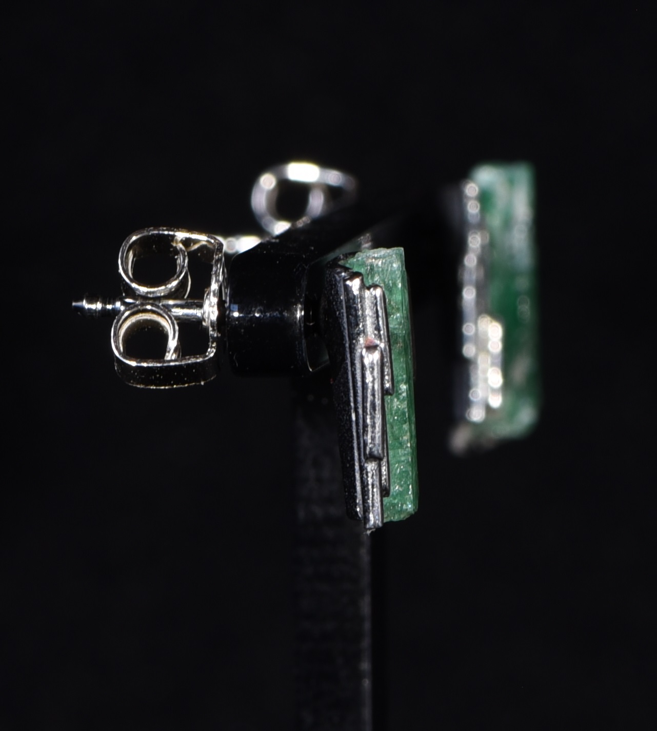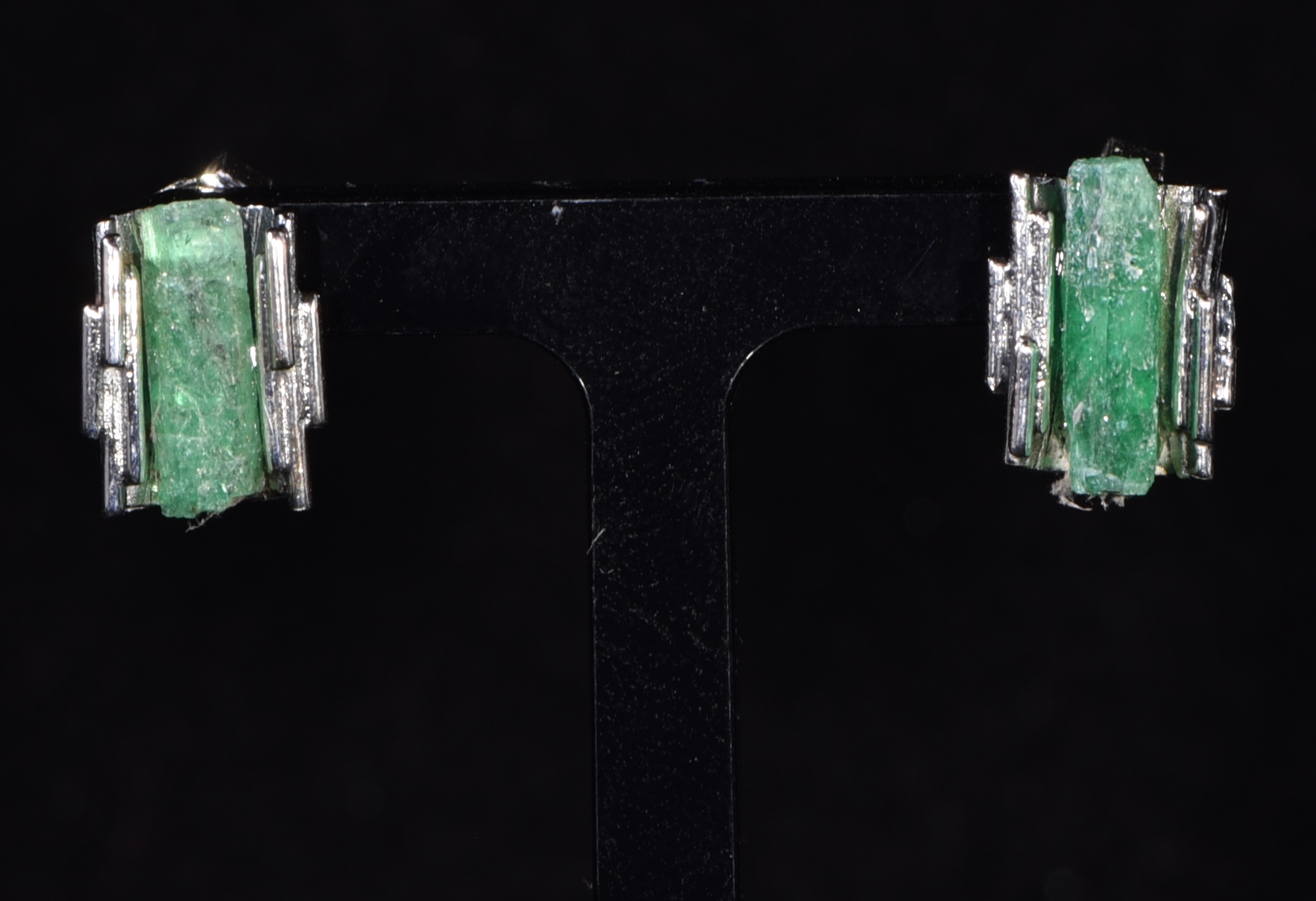 Die beiden Smaragde haben eine sehr gute Qualität, sind naturbelassen und in Silber eingefasst. Die Kristalle sind jeweils 1 cm lang und das Metall ist teilweise geschwärzt. Die Steine wurden im Smaragdbergbau im Habachtal (Bramberg, Salzburg, Österreich) gefunden.
