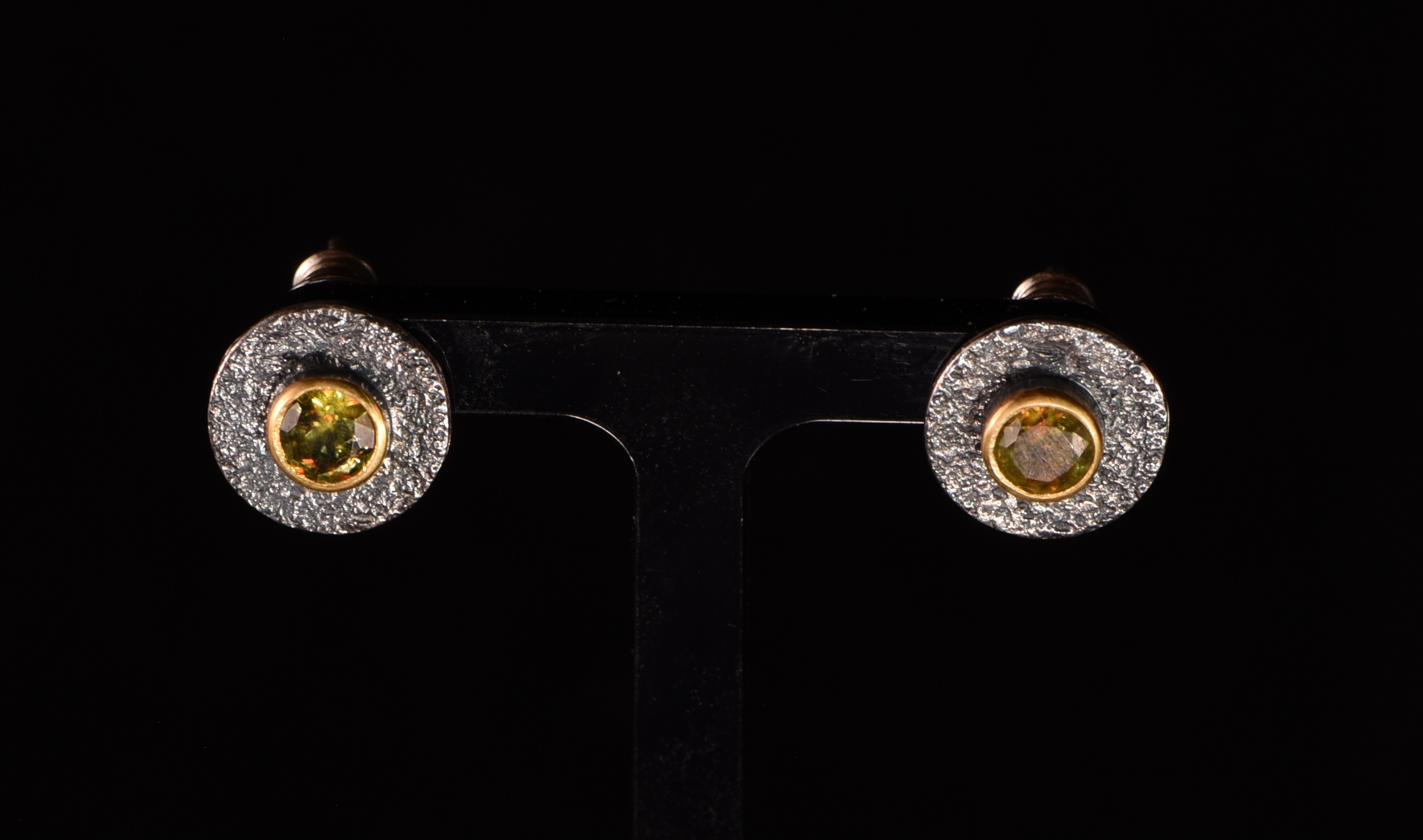 Diese beiden 4 mm großen, facettierten Tiatnit-Kristalle (Sphen) haben eine olivgrün leuchtende Farbe und eine sehr gute Transparenz. Die Ohrstecker sind teilweise geschwärzt und vergoldet. Der Sphen ist aufgrund seiner Doppellichtbrechung und Farbvielfalt auch als Turmalin der Alpen bekannt - seine Brillanz ist unglaublich. Die Steine wurde im Felbertal in Mittersill gefunden.