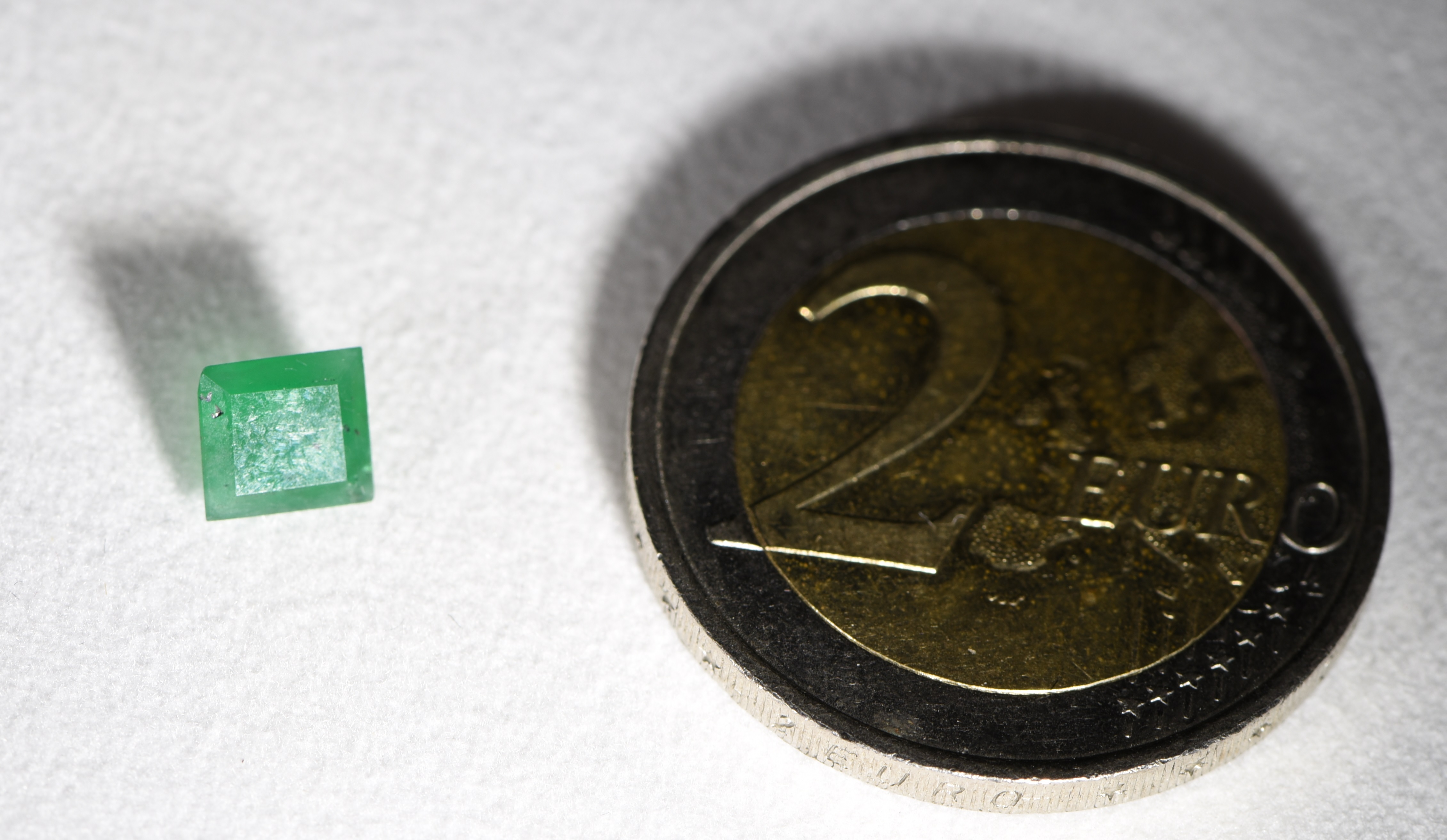 Dieser Smaragd ist viereckig geschliffen und hat eine gute leuchtend grüne Farbe. Im Stein sind einige, kleine Biotit-Einschlüsse zu sehen. Der Smaragd wurde im Smaragdbergwerk im Habachtal (Bramberg, Salzburg, Österreich) gefunden.