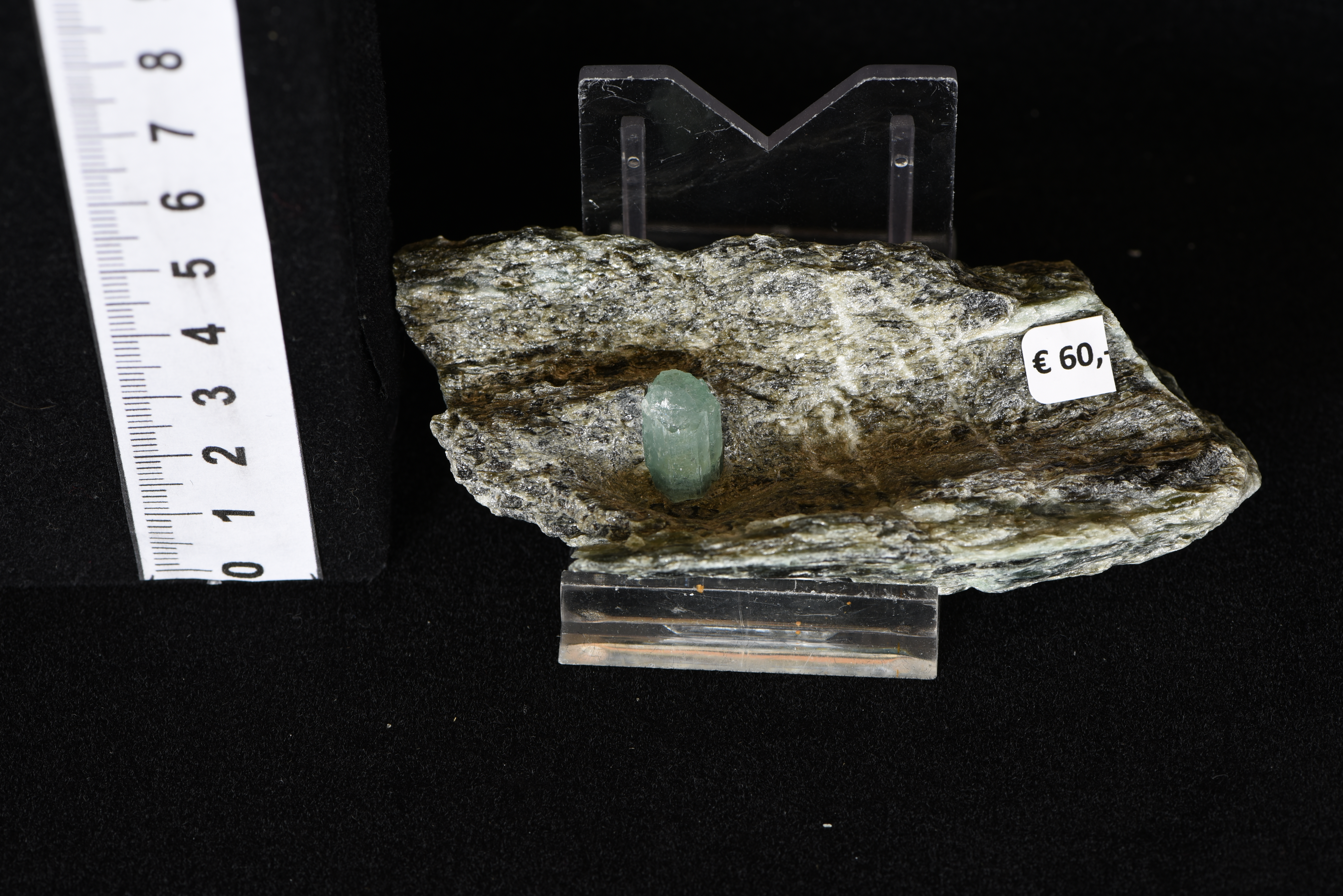 Ein 1,3 cm langer und 1 cm breiter Aquamarinkristall sitzt perfekt im Biotit-Glimmergestein.