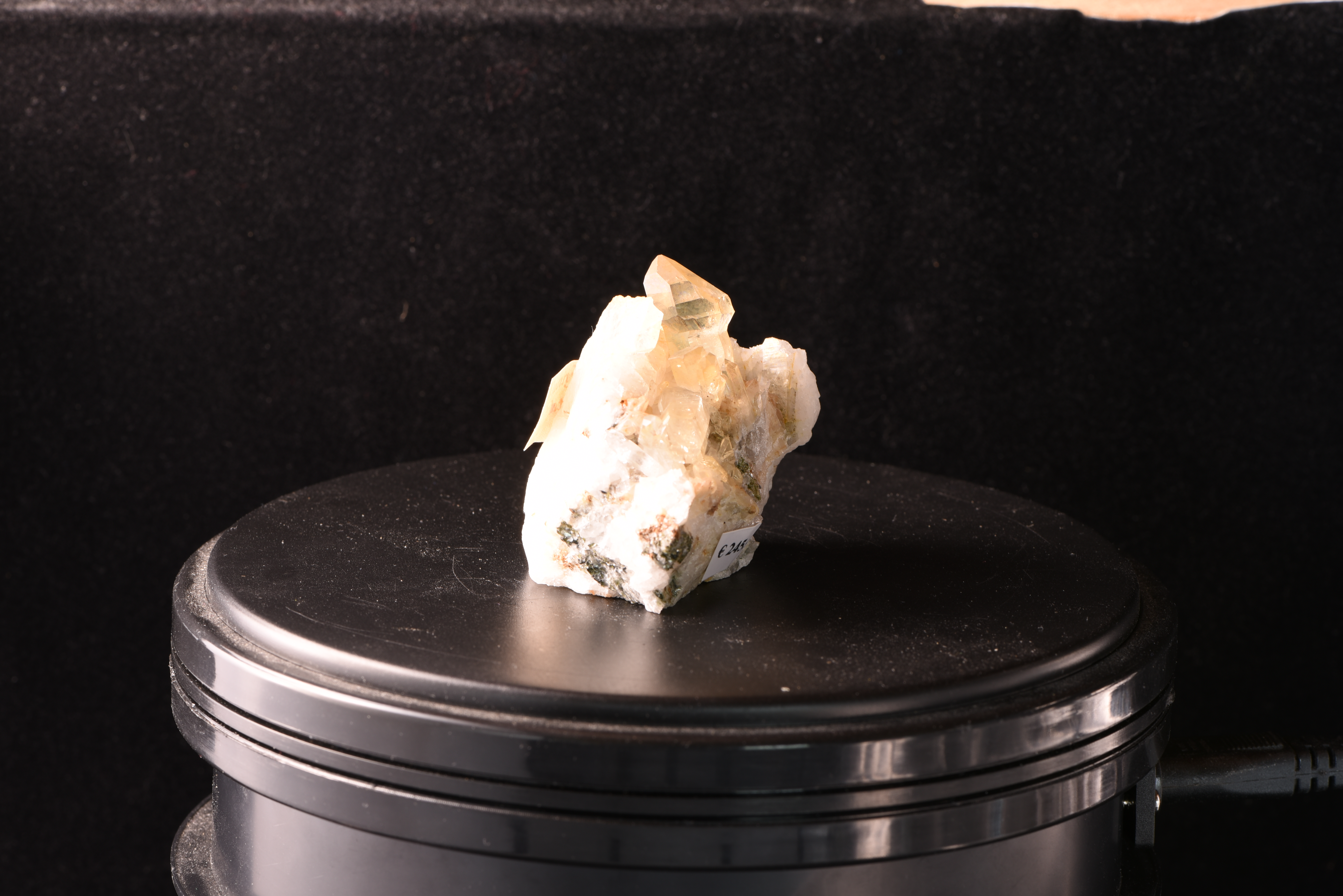 Eine wahre Seltenheit: Diese 6 cm breite und 5 cm hohe Bergkristall-Szepter-Stufe wurde in der Rauris gefunden. Der Zepter ist ca. 2,4 cm hoch - der Szepterkopf ist ca. 1,3 cm dick und perfekt ausgebildet. Neben dem Szepter sind noch weitere Bergkristallspitzen zu sehen. Die Stufe wurde im Juni 1980 gefunden. Durch Eisenoxyd-Einschlüsse wirken die Kristalle gelblich und sehen aus wie Citrin.