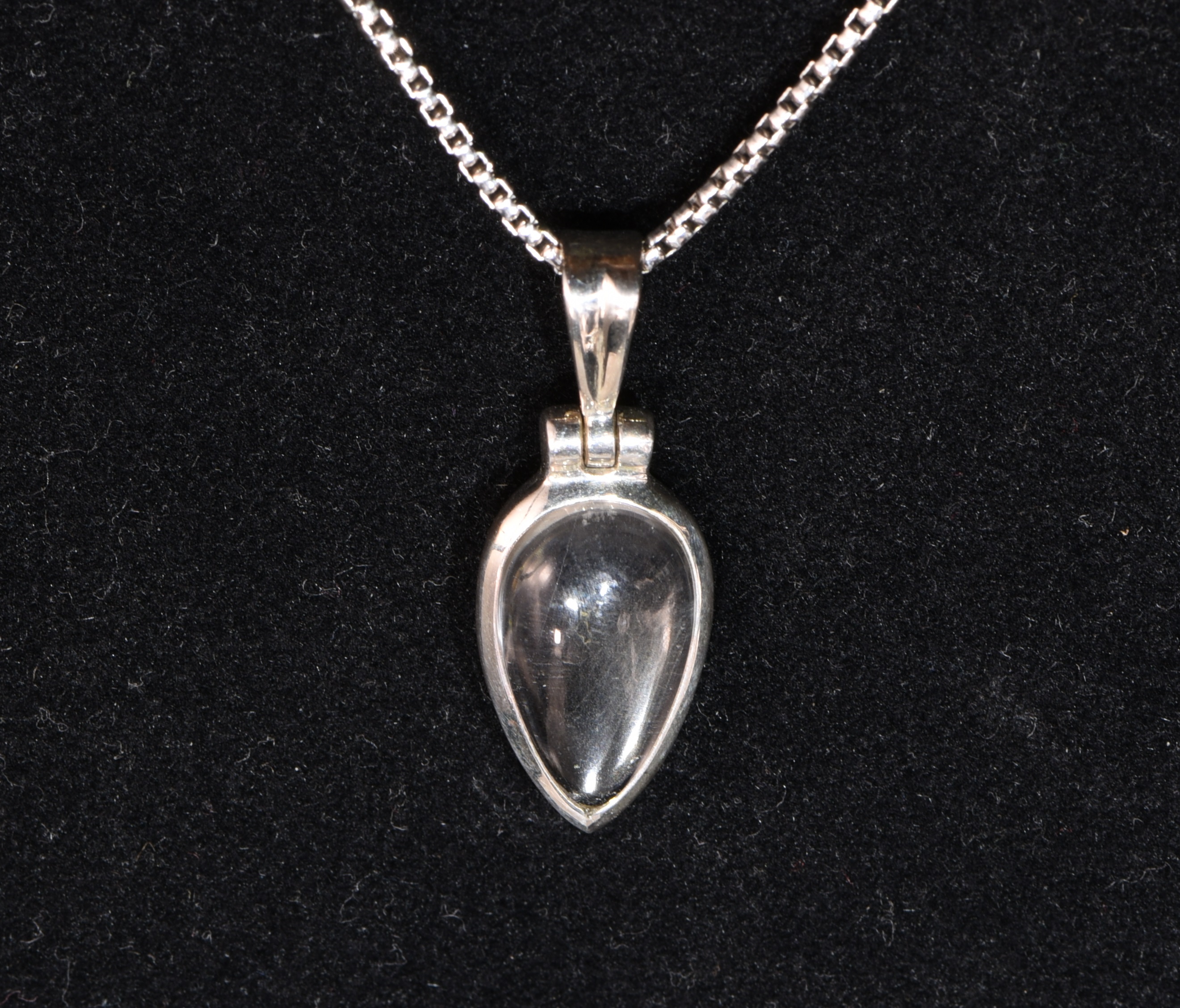 Dieser glasklare Habachtal-Bergkristall wurde Cabochon geschliffen und in Silber eingefasst. Die Silberfassung ist hinten offen.