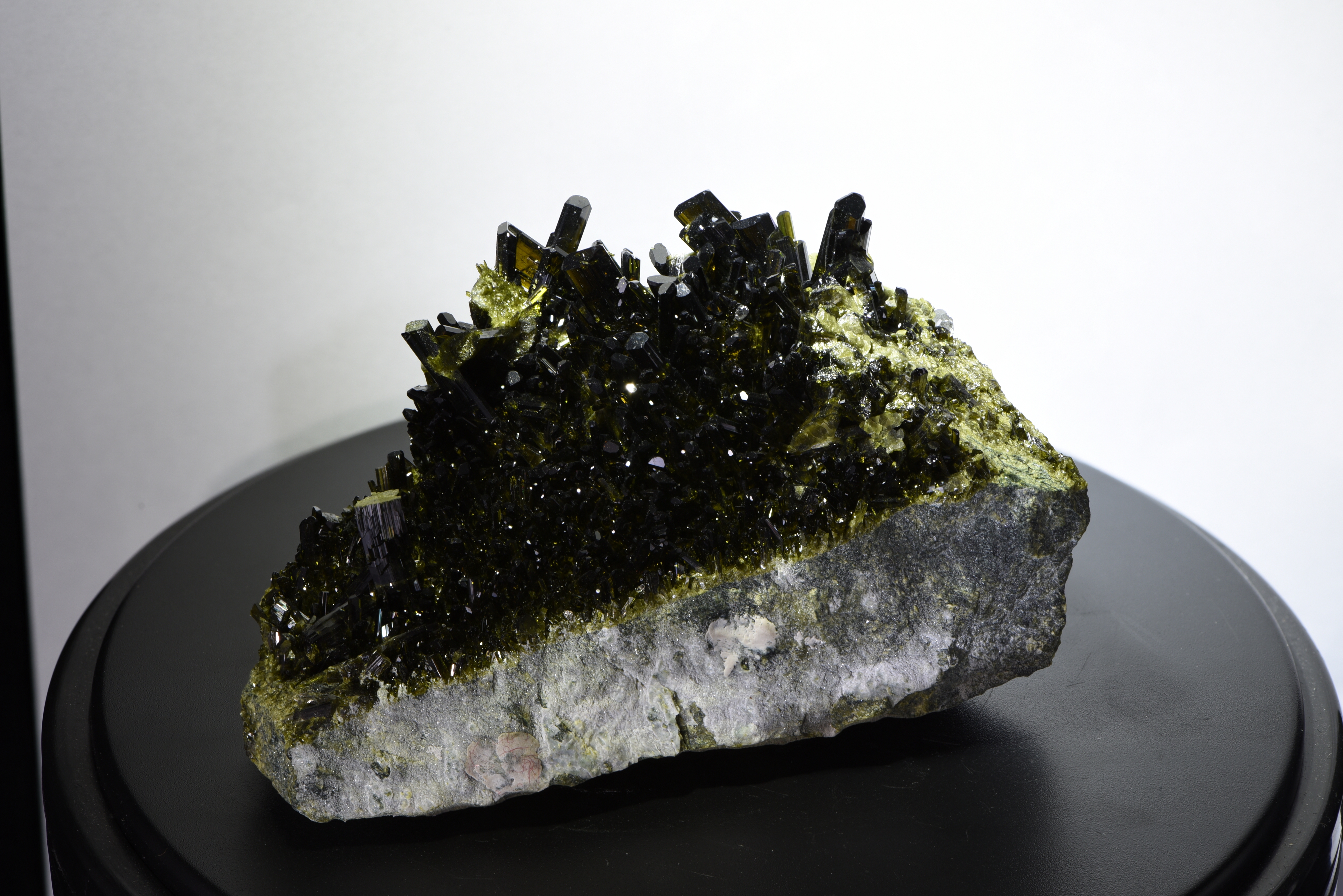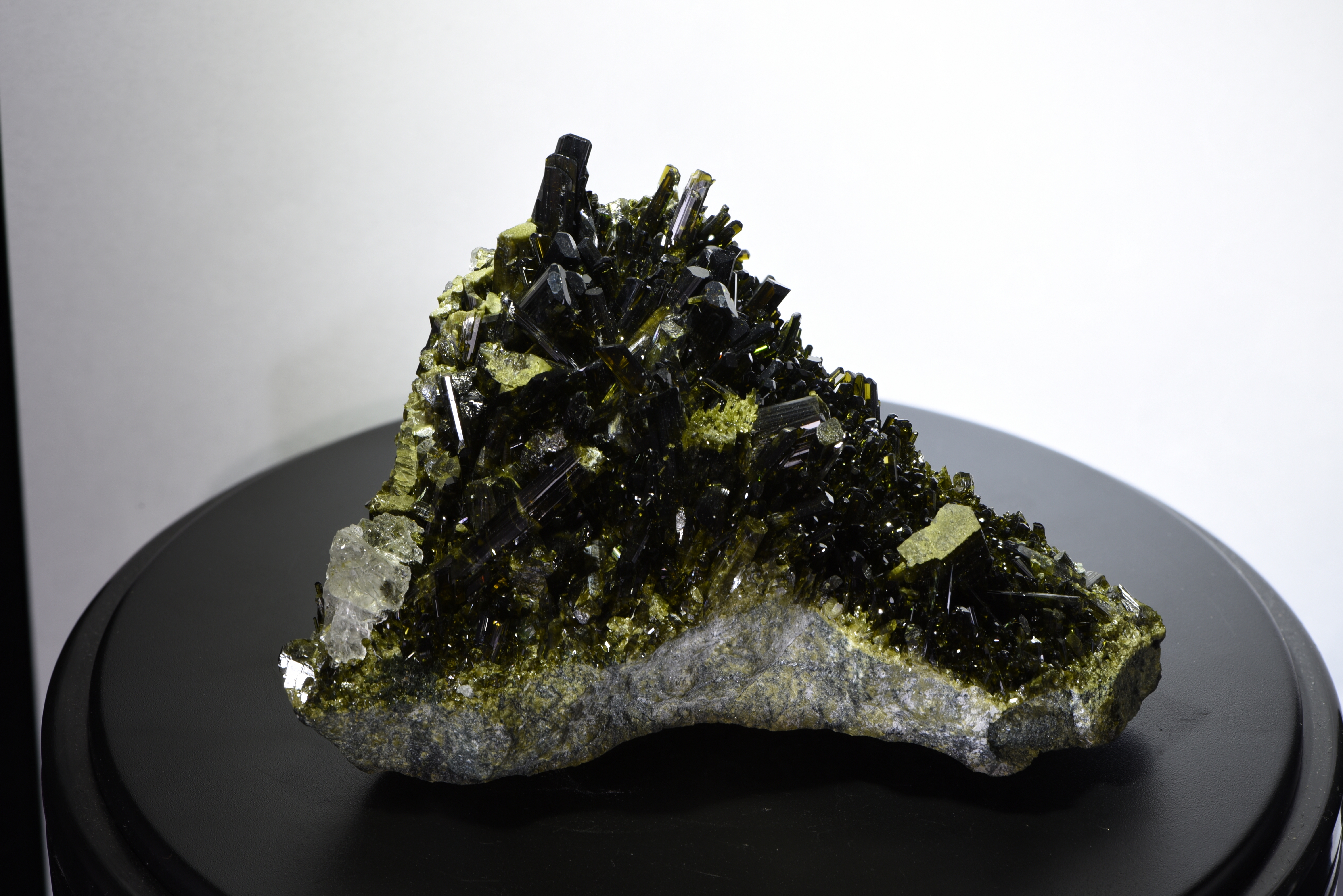 Auf dieser Stufe befindne sich unzählige Epidot-Kristalle mit hochglanz. Der größte Einzelkristall ist ca. 3 cm lang. Der Stein wurde bei der Knappenwand im Untersulzbachtal (in Neukirchen am Großvenediger) gefunden.