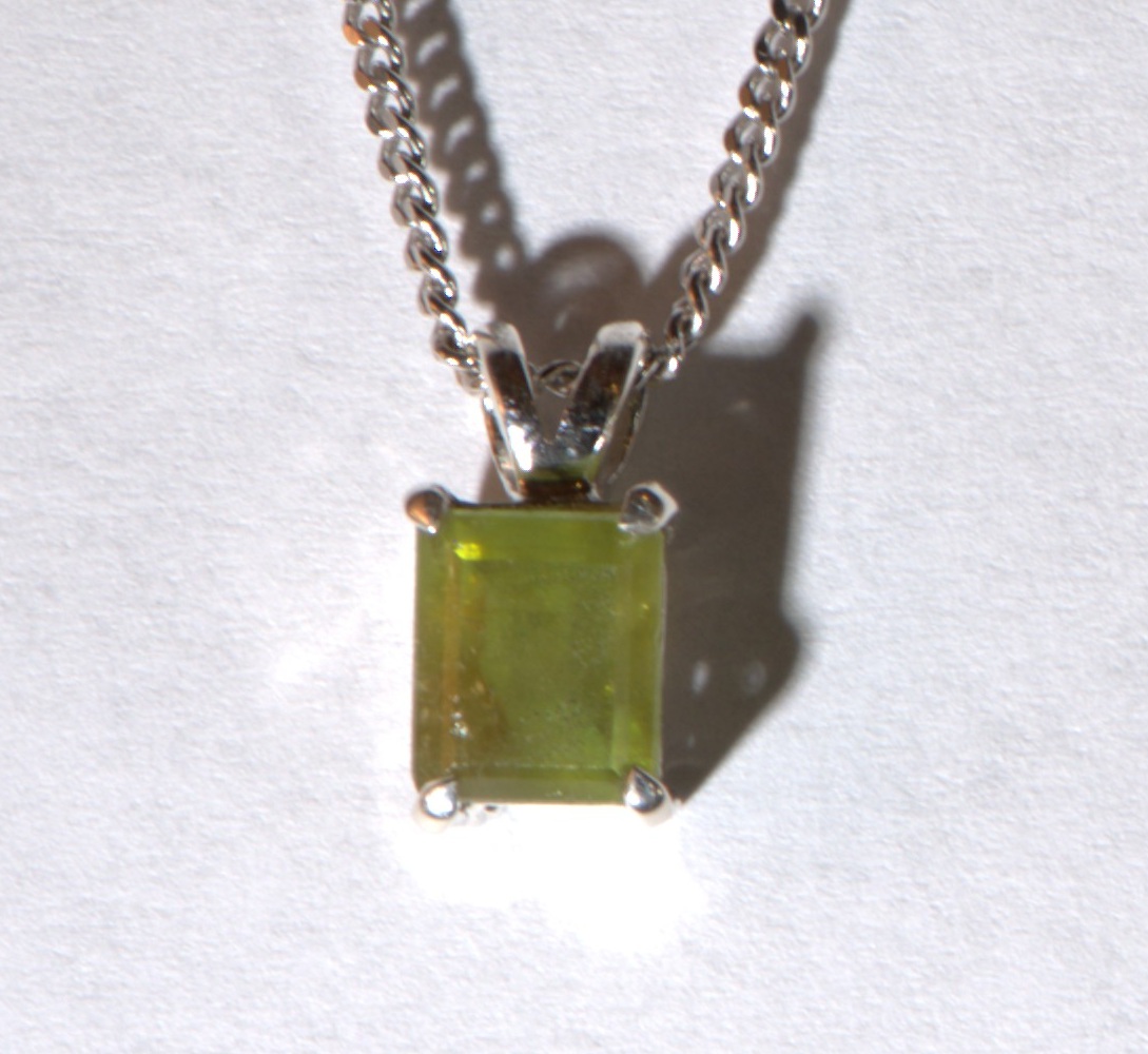 Dieser facettierte Titanit-Kristall (Titanit ist unter anderem auch als Sphen bekannt) misst 6,5 mm x 5,5 mm und hat eine Olivgrüne Farbe. Die feine Krappenfassung besteht aus 925-er Silber. Der Stein wurde im Felbertal (Mittersill, Salzburg, Österreich) gefunden.