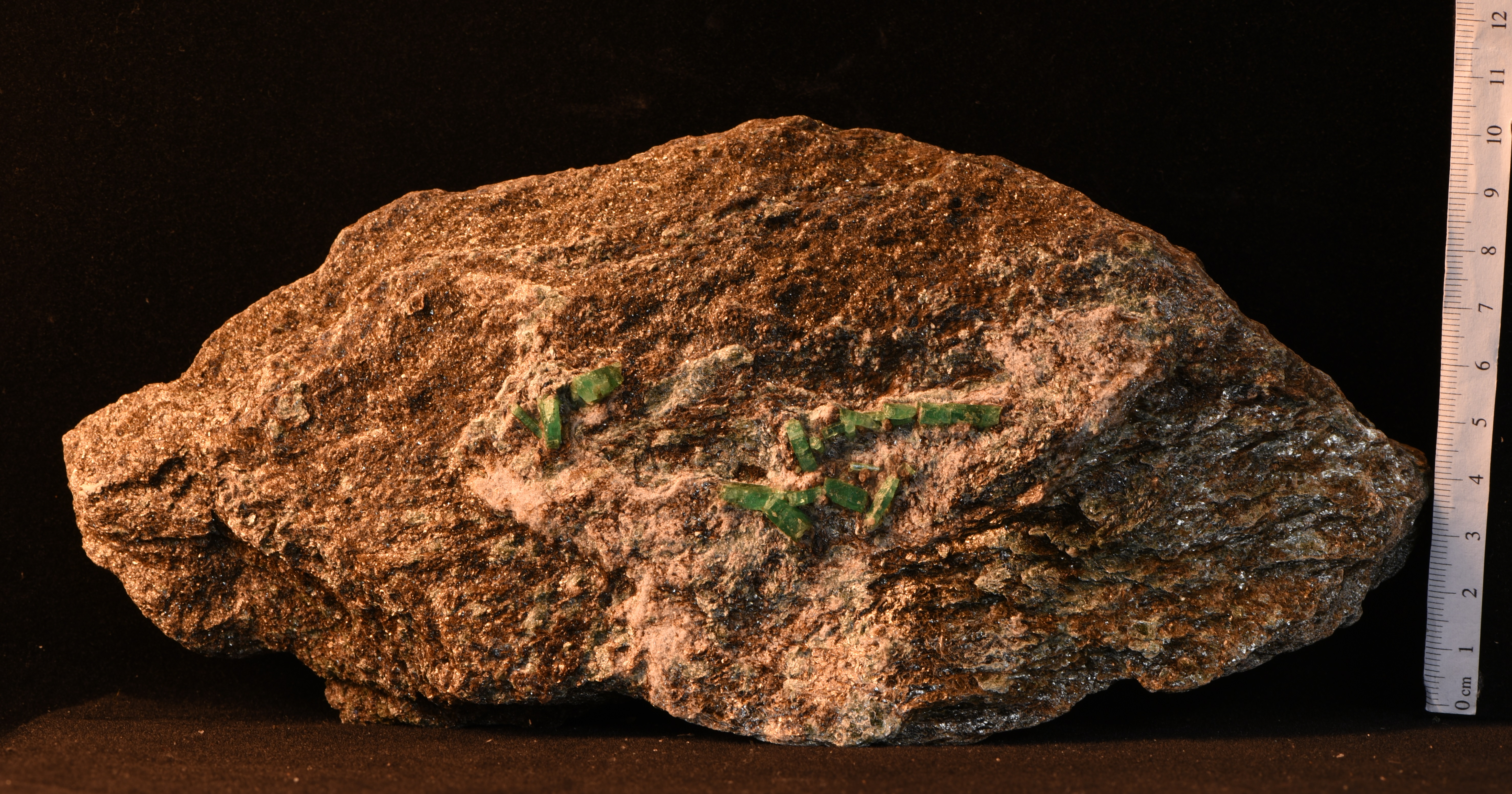 Auf dieser flachen Biotit-Glimmerschiefer-Stufe sitzen über 10 Smaragde. Der größte Smaragd misst 1,5 cm und die Steine haben eine unglaubliche Klarheit und eine schöne, tiefgrüne Farbe. Die Stufe ist 25 cm breit und 12,5 cm hoch.