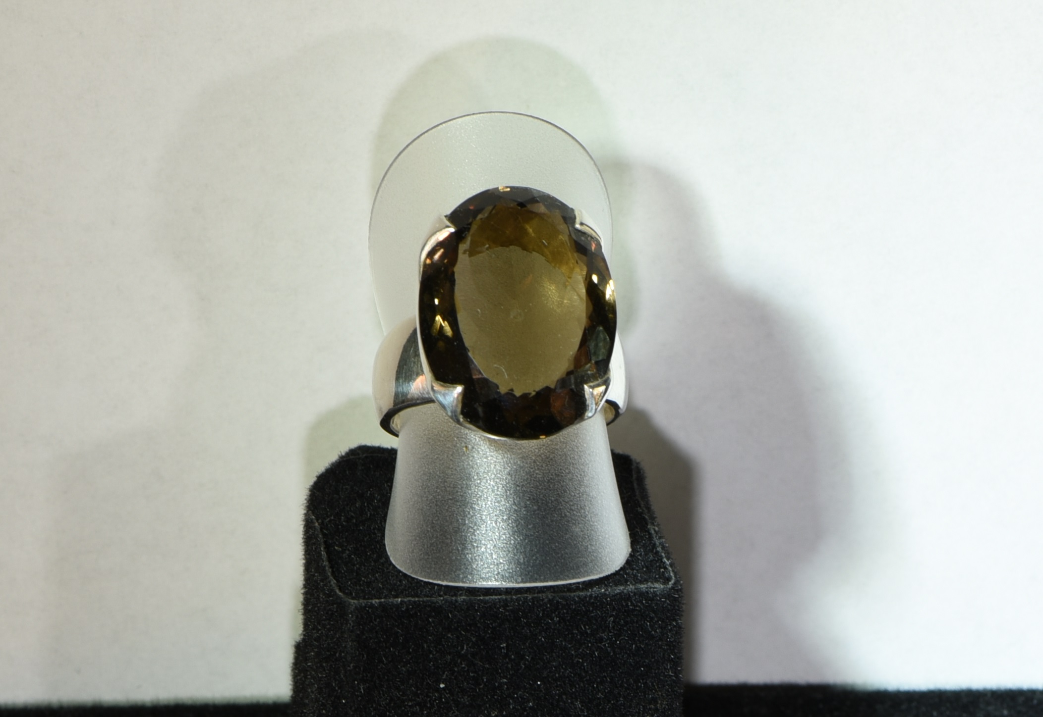 Dieser Habachtal-Rauchquarz ist einschlussfrei und hat eine sagenhafte Größe von 2,1 cm x 1,6 cm. Der Stein ist in einen Silberring eingefasst und der Ring hat die Größe 56. Damit der Stein so brillant wie möglich ist, wurde er tief geschliffen - daher hat der Ring auch einen relativ hohen Aufbau - ein wahrer Klunker. Der Stein wurde in der Wiesbachrinne im Habachtal (Bramberg, Bundesland Salzburg, Österreich) gefunden.