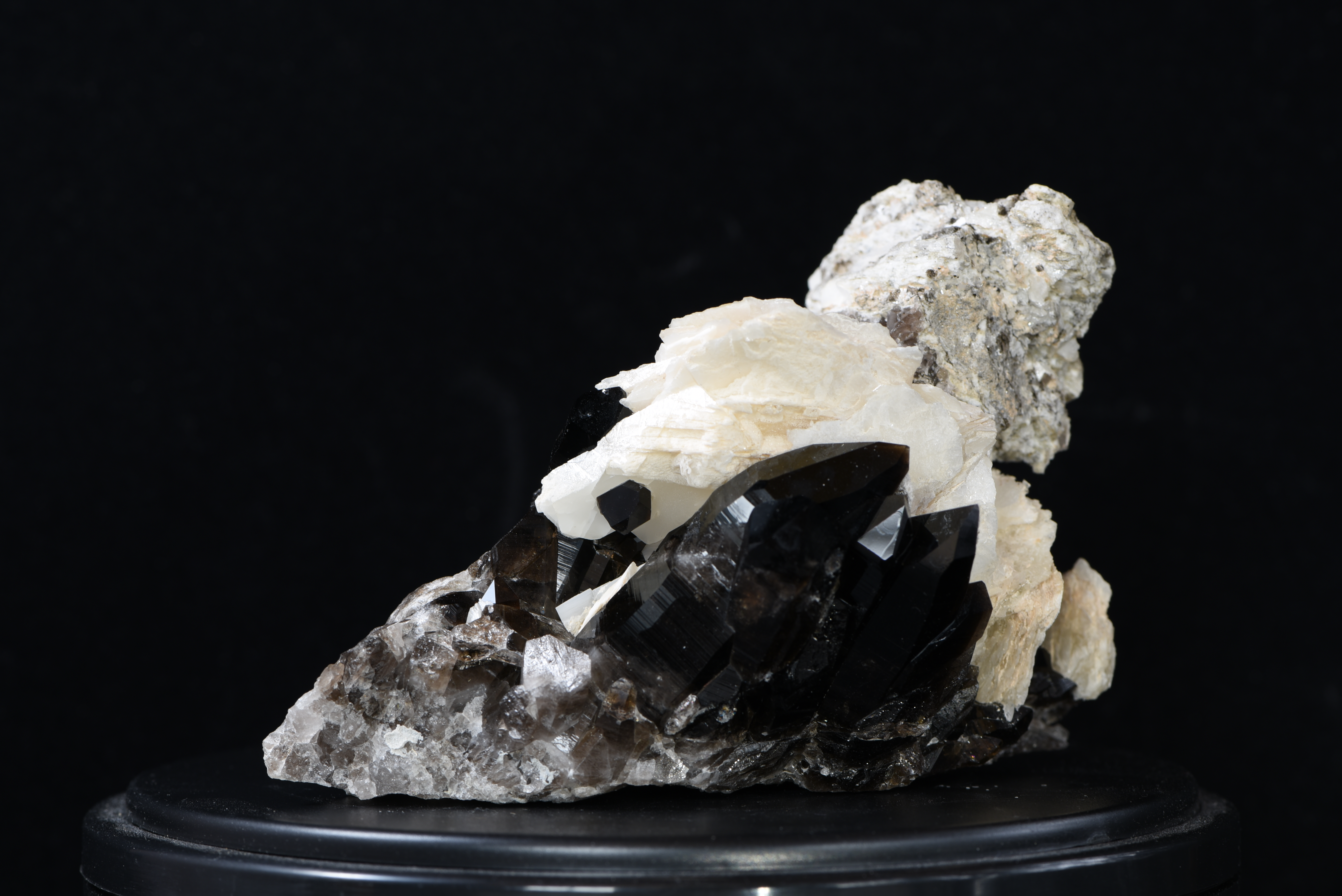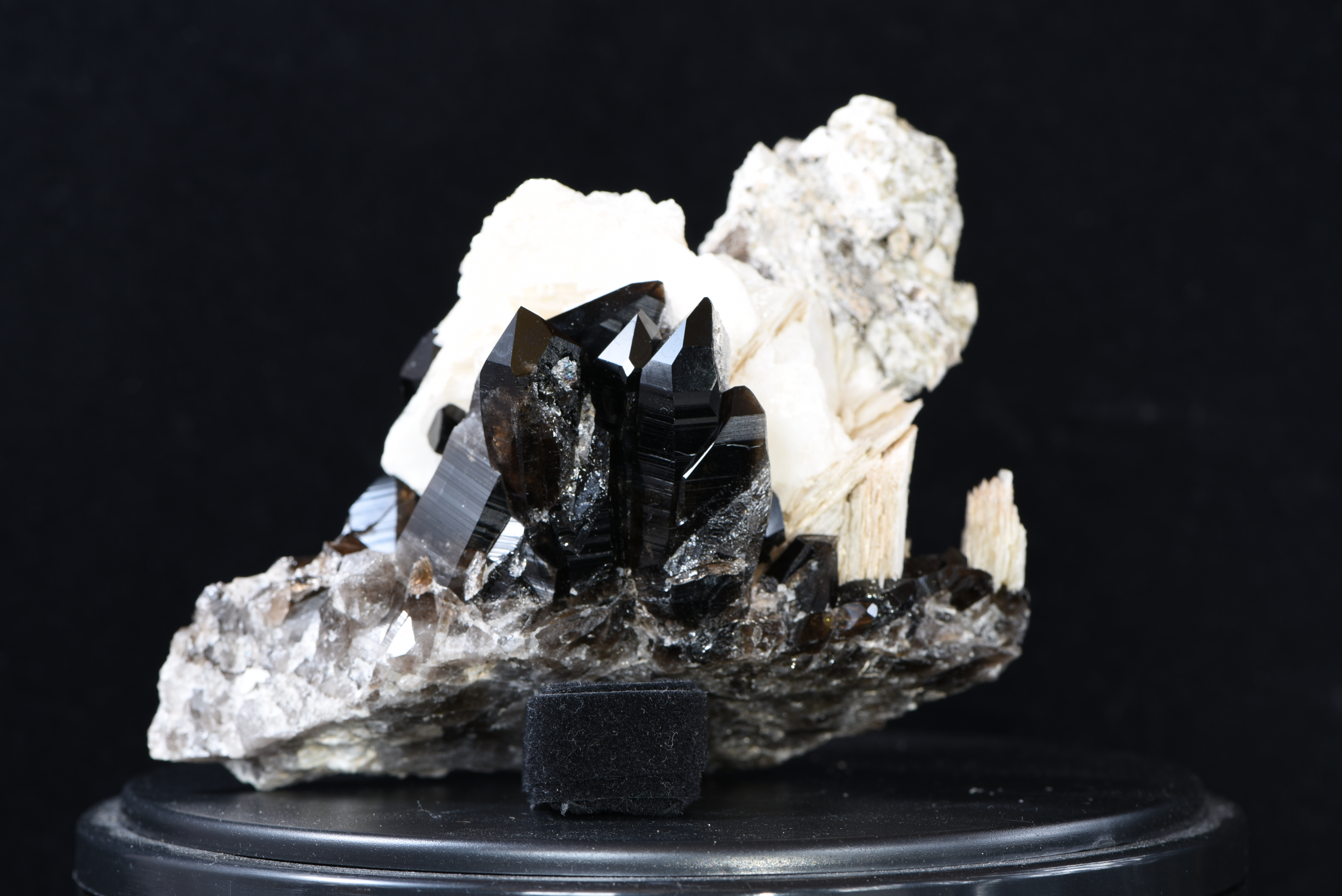 Diese Stufe besticht mit einer sehr dunklen Farbe, die einen einmaligen Kontrast zu den dahinterliegenden Blätterspat-Calzit-Kristallen ergibt. Außerdem befindet sich oberhalb vom Blätterspat-Calzit das Gegenstück bzw. die andere Seite der Kluft - dadurch kann man gut erkennen, wie breit der Hohlraum war, indem der Rauchquarz entstanden ist - eine wahre Seltenheit!. Der größte Kristall der Stufe misst ca. 4,5 cm. Der Stein wurde beim Scharrn im Hollersbachtal gefunden.