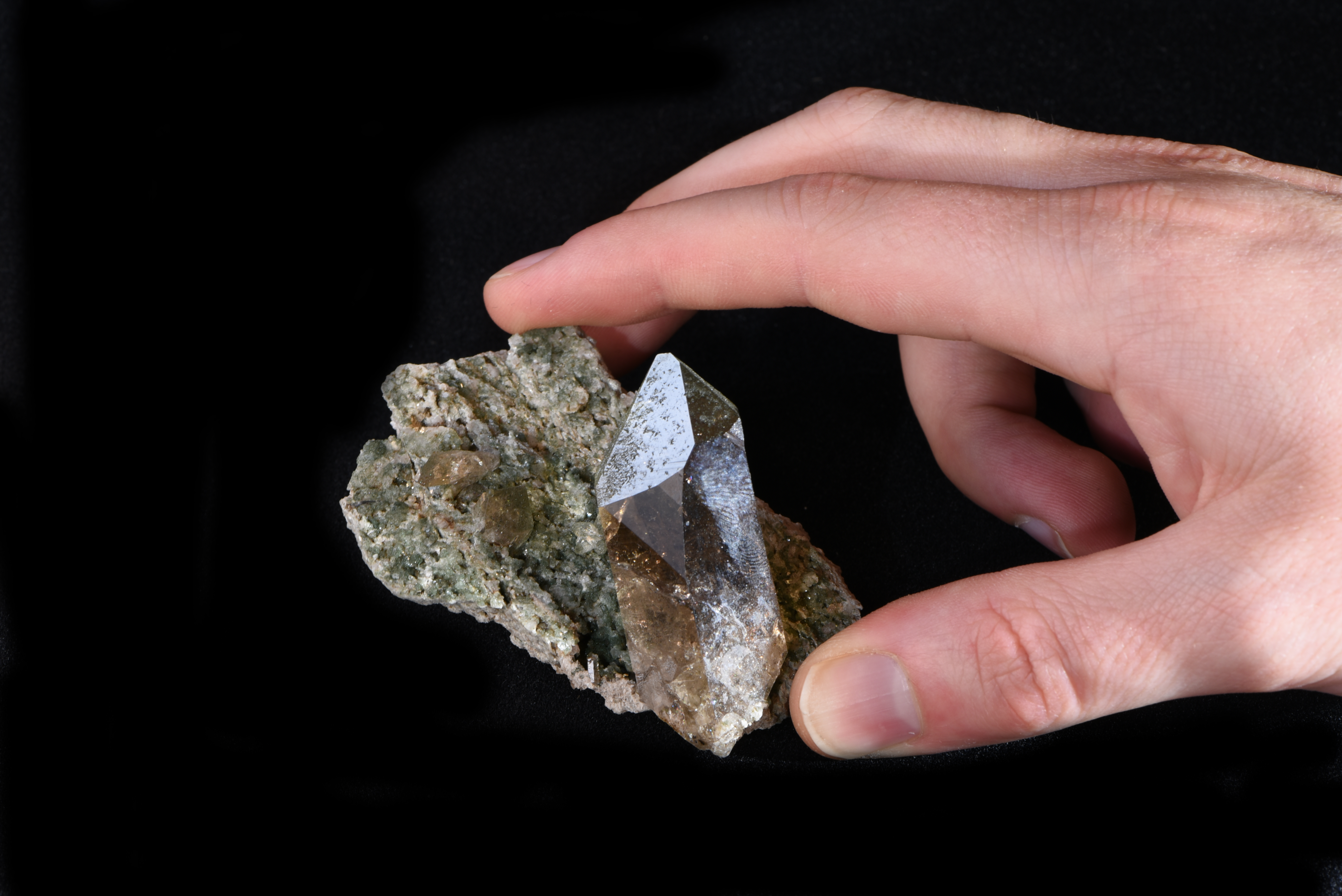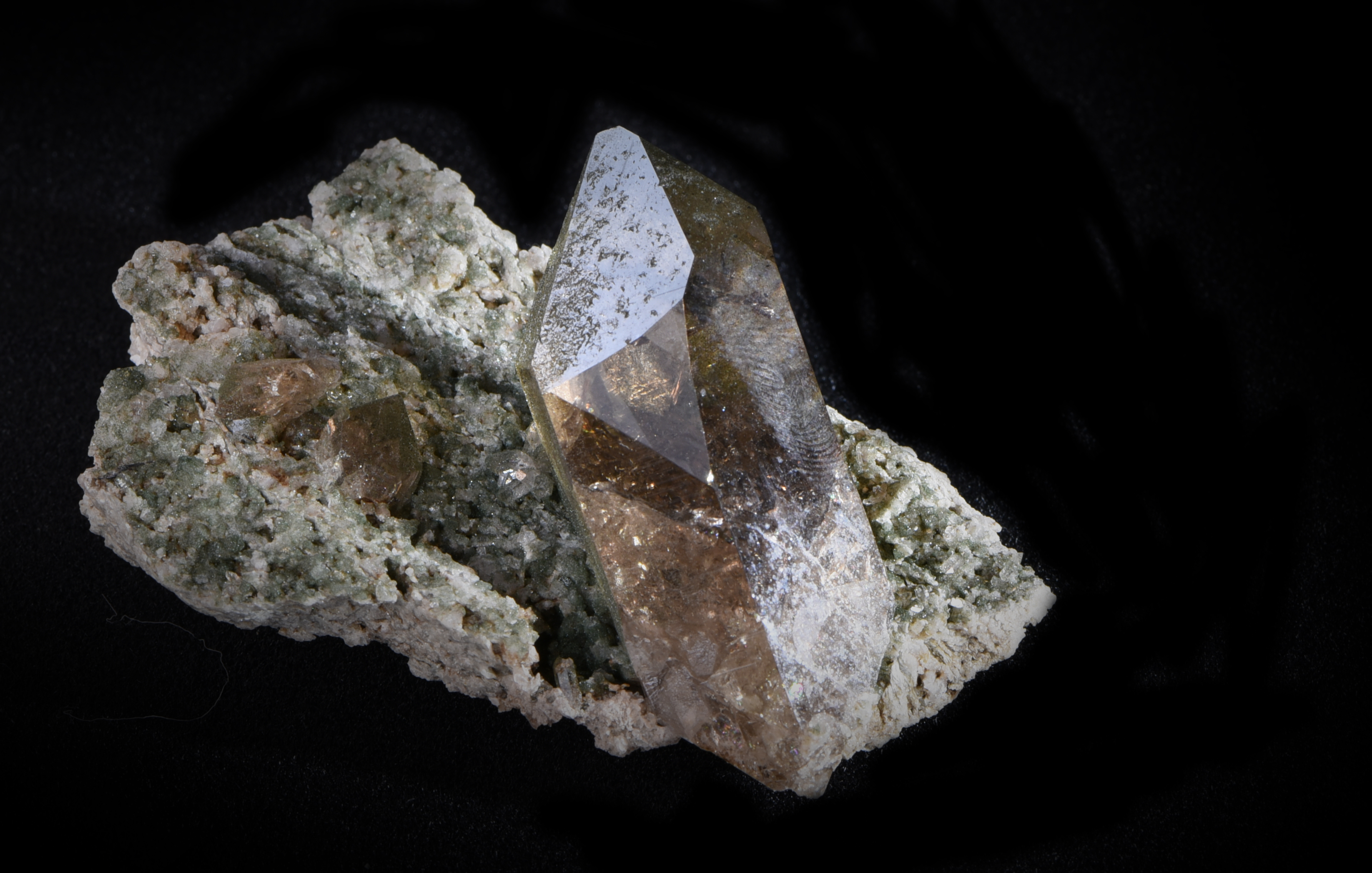 Diese Stufe hat einen idealen Aufbau - sie lässt sich gut hinstellen und die Kristalle sind schön klar. Das Stück ist leicht mit Chlorit bedeckt, was aber auf keinem Fall störend ist, da die seitenflächen des Kristalls einen schönen Glanz aufweisen.