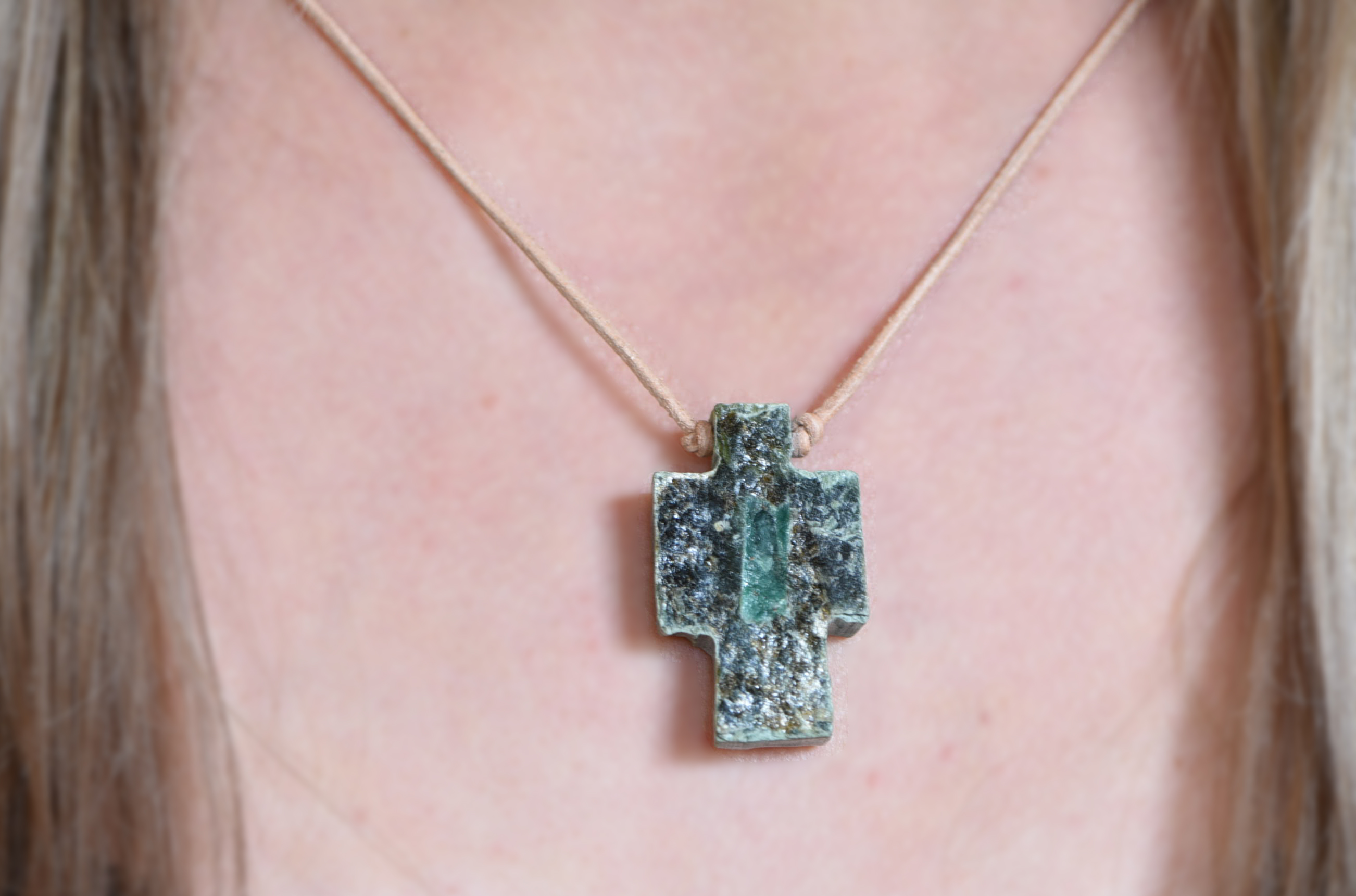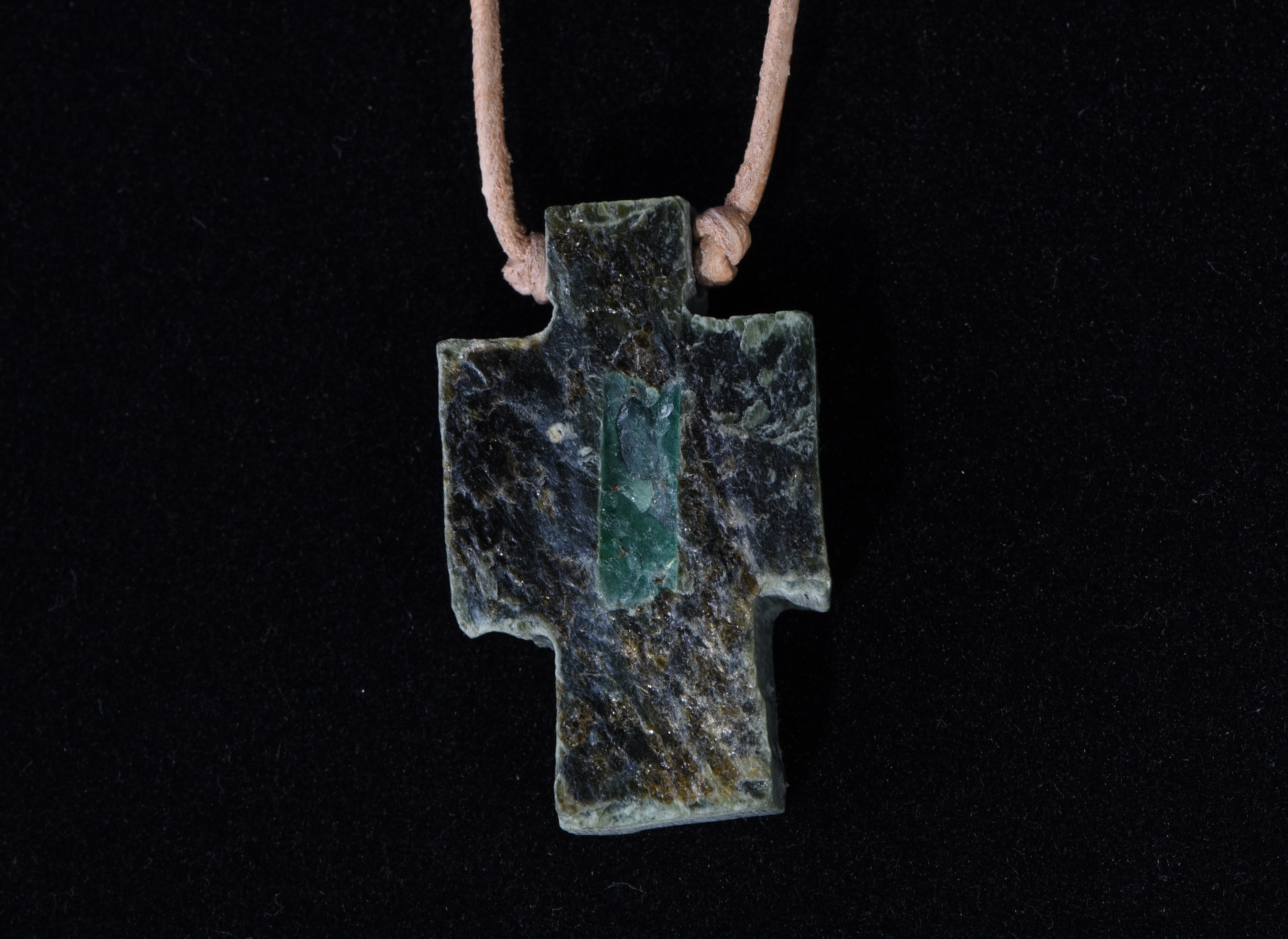 Mitten im kreuzförmigen Muttergestein sizt ein 1,3 cm großer Smaragd. Der Stein wurde bei der Smaragdmine im Habachtal in Bramberg (Salzburg, Österreich) gefunden. Der Anhänger ist an einem größenverstellbarem Lederband befestigt.