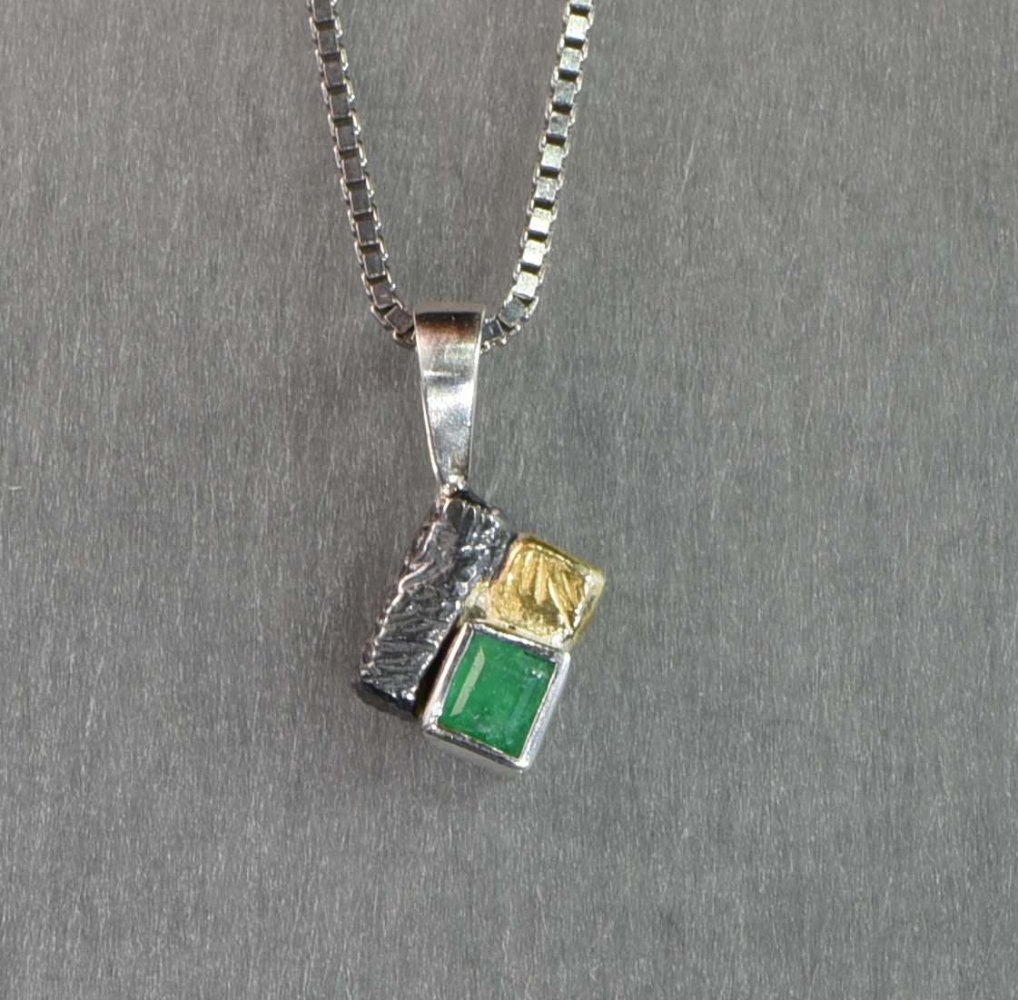 Ein wunderschöner, 0,4 mm x 0,4 mm großer, facettierter Habachtal-Smaragd wurde in einen Silberanhänger eingearbeitet. Der Silberanhänger ist teilweise geschwärzt und teilweise vergoldet und ist ein richtiger Hingucker. Der Stein wurde beim Smaragdbergbau im Habachtal (Bramberg, Salzburg, Österreich) gefunden.