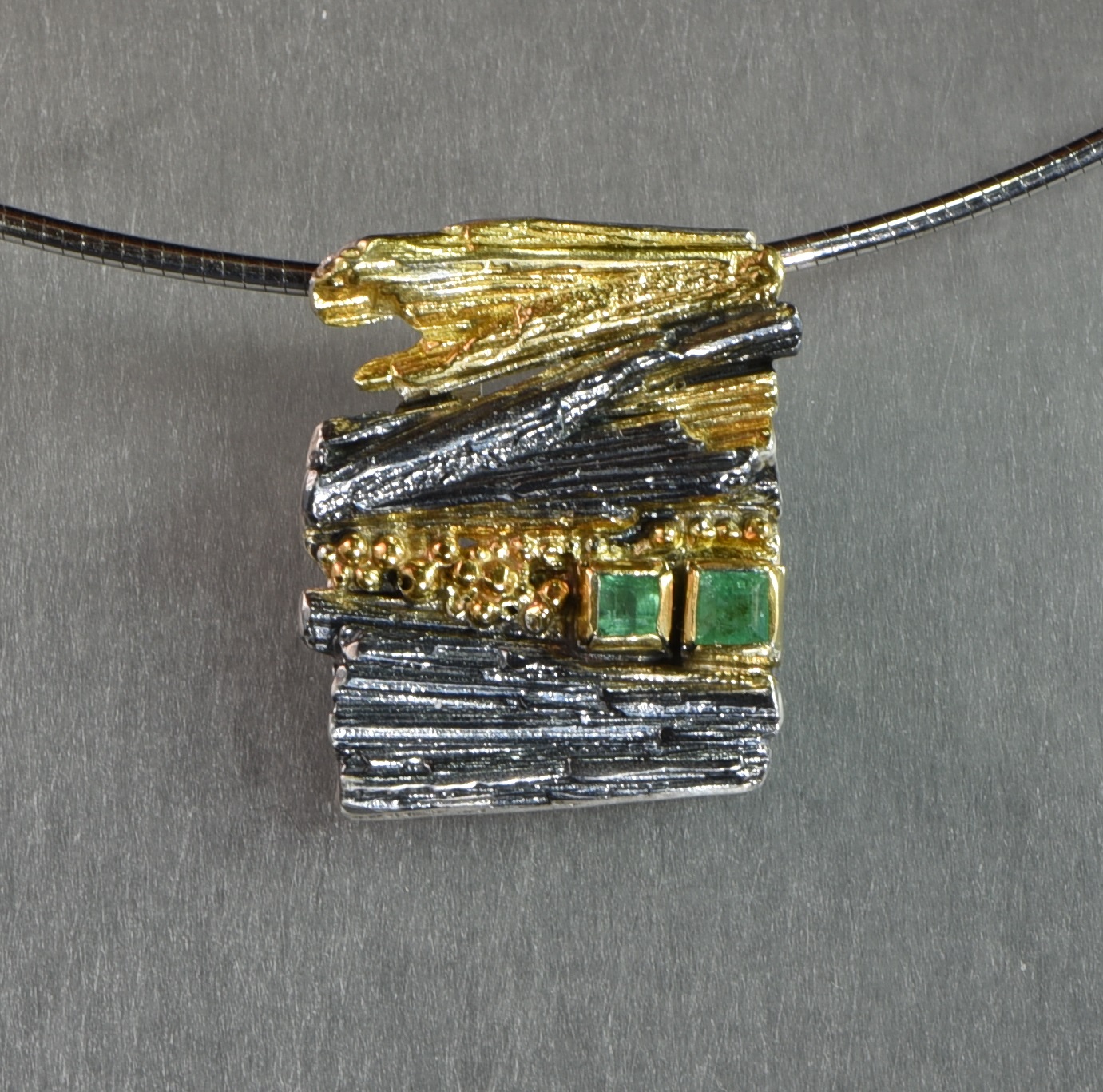 Zwei wunderschöne Smaragde aus dem Habachtal wurden in einen Silberanhänger eingearbeitet. Der erste Smaragd hat eine Größe von 0,4 mm x 0,4 mm und der zweite 0,5 mm x 0,4 mm. Der Silberanhänger ist teilweise geschwärzt und teilweise vergoldet und ist ein richtiger Hingucker. Der Stein wurde beim Smaragdbergbau im Habachtal (Bramberg, Salzburg, Österreich) gefunden.
