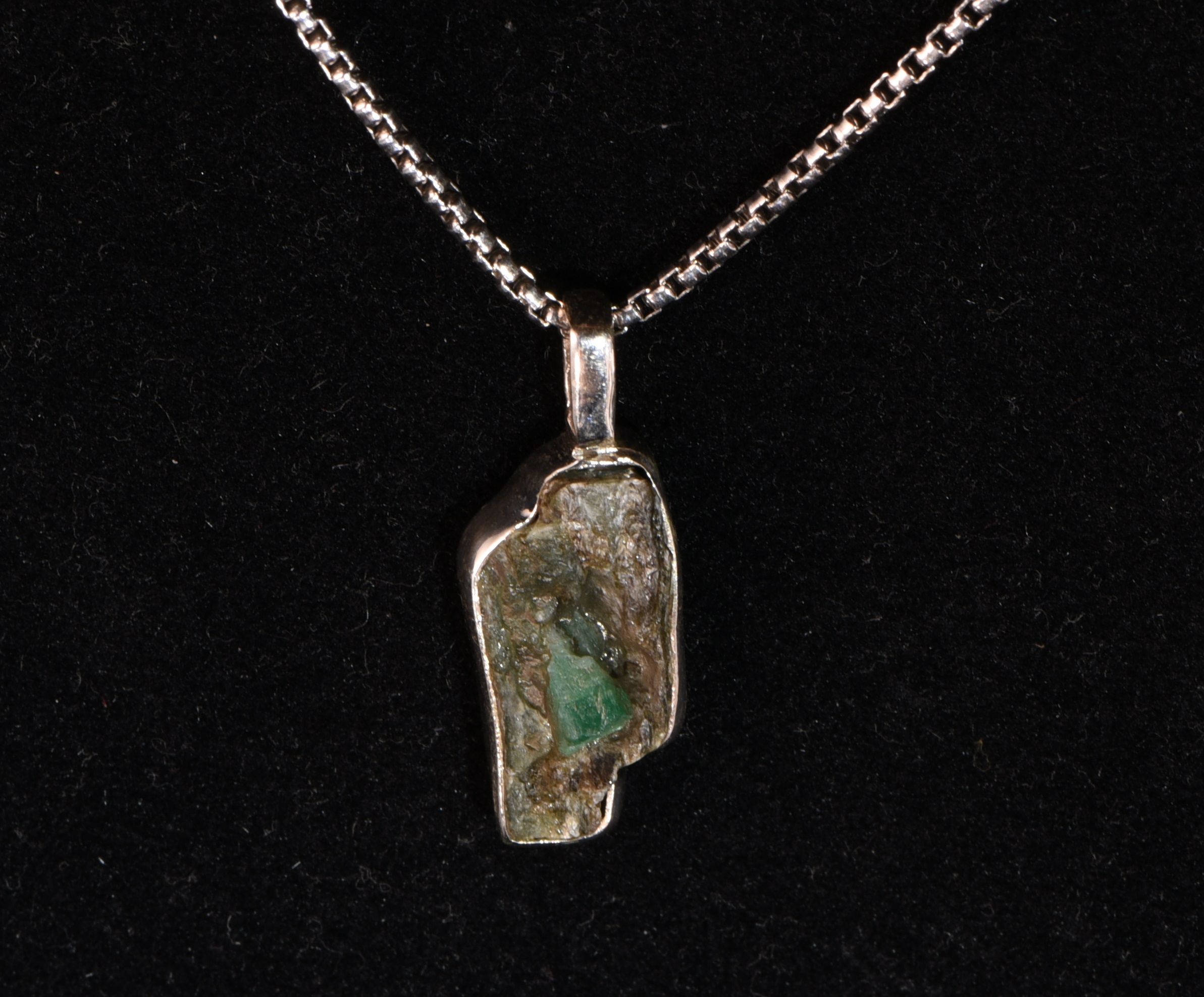 Auf dieser kleinen, 2 cm hohen Smaragd-Stufe sitzt ein 4 mm langer Smaragd mit einer sehr schönen, hellgrünen Farbe. Das umliegende Gestein ist das Muttergestein vom Smaragd - der Biotit-Glimmerschiefer. Der Smaragd wurde im Smaragdbergbau im Habachtal (Bramberg, Salzburg, Österreich) gefunden und in Silber eingefasst (Randfassung mit einer hinten geschlossenen Silberplatte).
