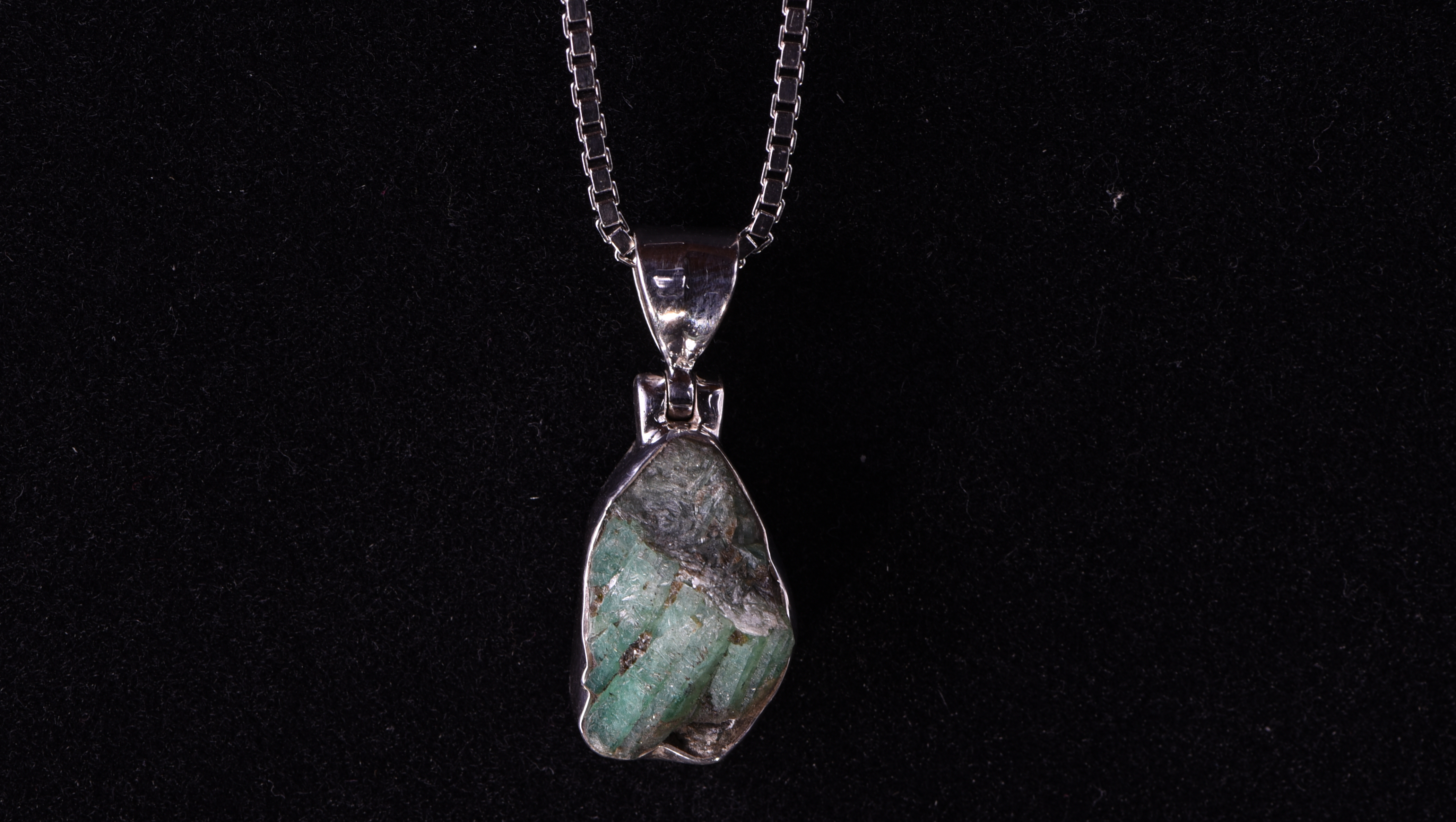 Hier sind einige Smaragdkristalle in einen Kristall verwachsen. Die Verwachsung nimmt eine Fläche von 1,3 cm x 1,4 cm ein. Die Kristalle sitzen in Talk-Schiefer Gestein. Der Smaragd wurde im Smaragdbergbau im Habachtal (Bramberg, Salzburg, Österreich) gefunden und in Silber eingefasst (Randfassung mit einer hinten geschlossenen Silberplatte).