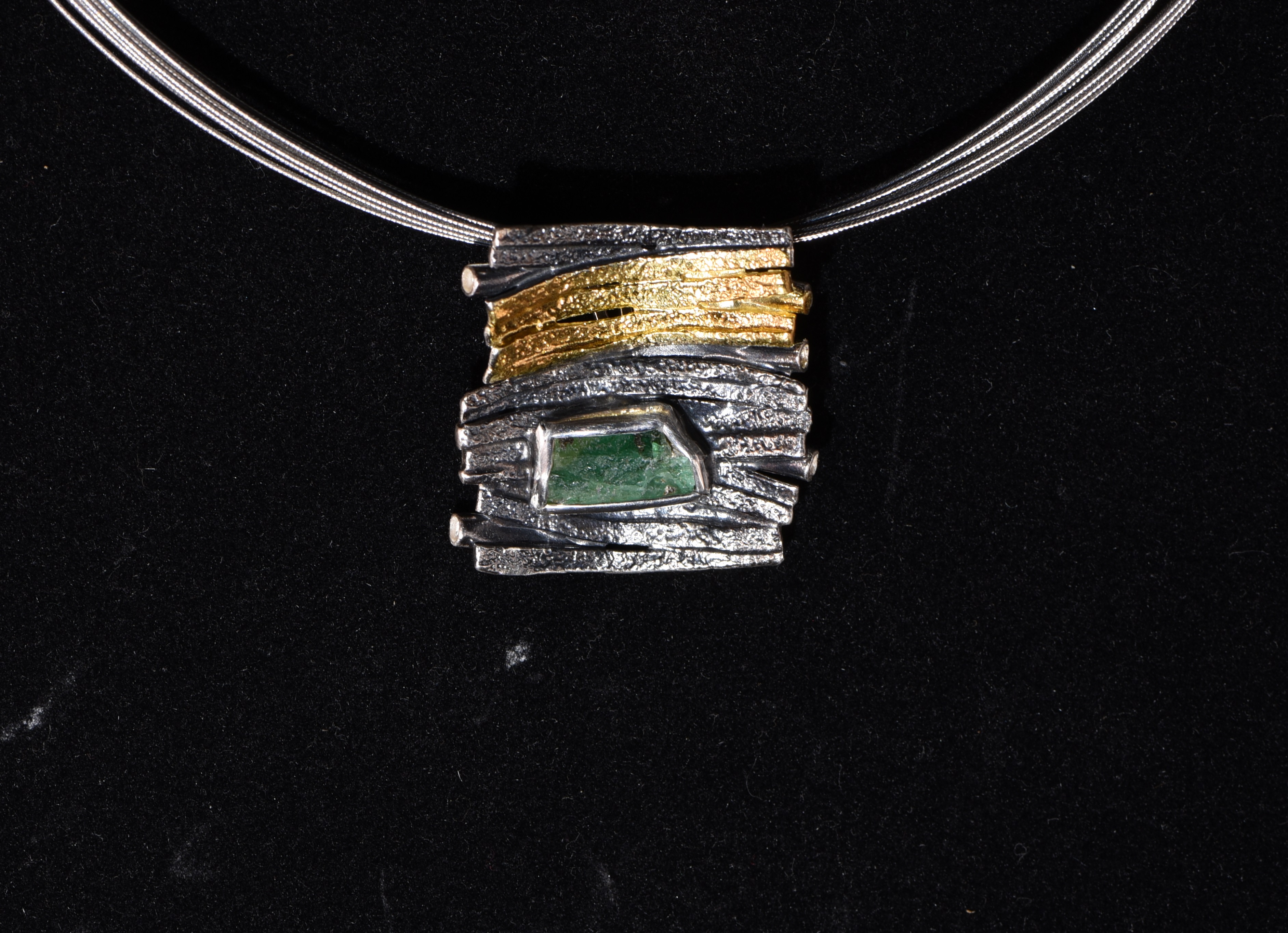 Ein wunderschöner 11 mm x 5mm großer, facettierter Habachtal- Smaragd wurde in einem Silberanhänger eingearbeitet. Der Silberanhänger ist teilweise geschwärzt und teilweise vergoldet und gibt dem Anhänger einen einzigartigen Look. Der Stein wurde beim Smaragdbergbau im Habachtal (Bramberg, Salzburg, Österreich) gefunden.