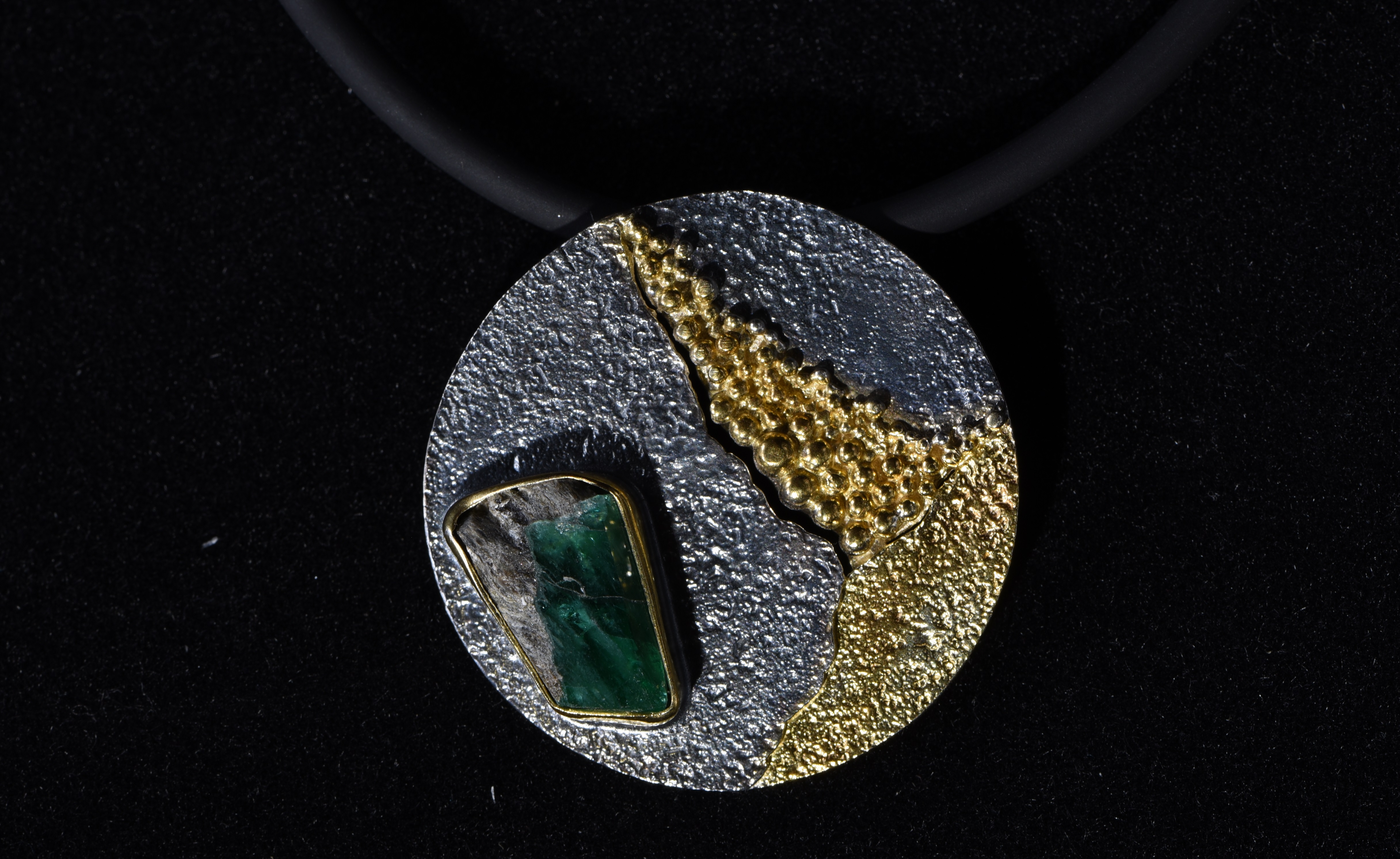 Ein 1,2 cm langer Smaragd sitzt noch im Talk-Schiefer-Gestein. Der Anhänger ist in Silber eingefasst - teilweise ist das Silber vergoldet und geschwärzt. Der Stein wurde im Smaragdbergbau im Habachtal (Bramberg, Salzburg, Österreich) gefunden.