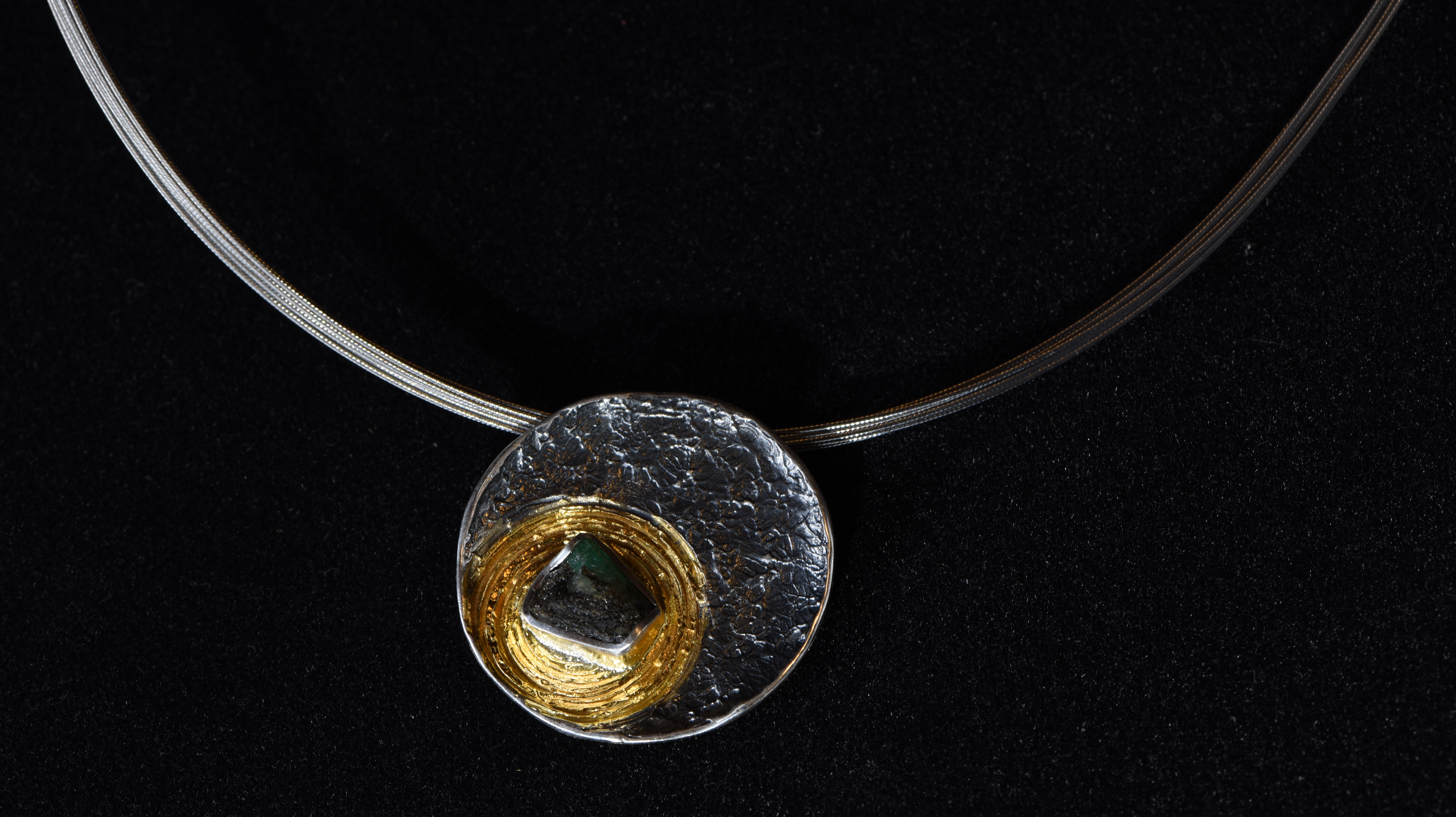 Ein 8 mm langer Smaragd sitzt noch im Talk-Schiefer-Gestein. Der Anhänger ist in Silber eingefasst - teilweise ist das Silber vergoldet und geschwärzt. Der Stein wurde im Smaragdbergbau im Habachtal (Bramberg, Salzburg, Österreich) gefunden.