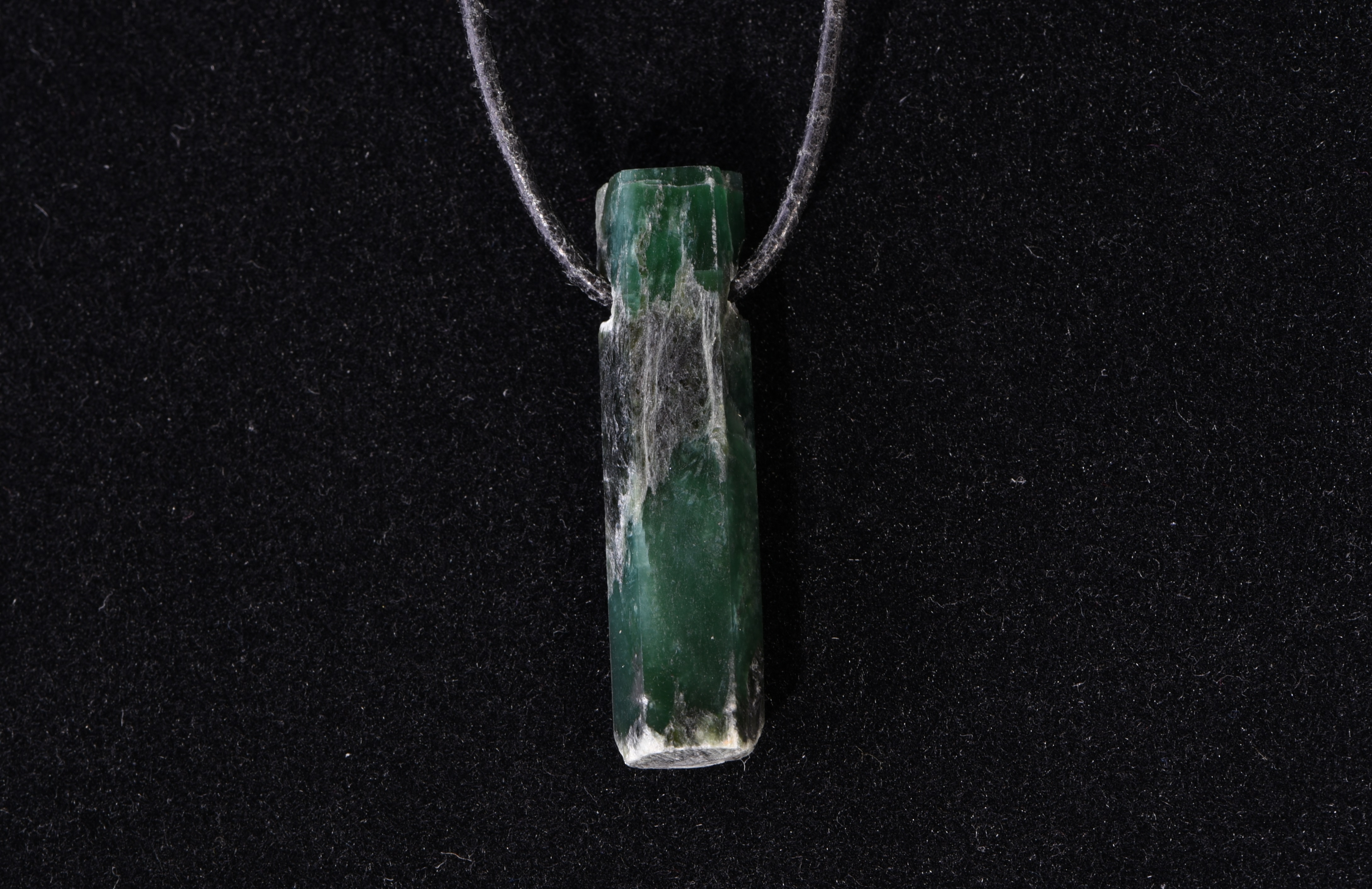 Ein 3,6 cm x 0,9 cm großer Smaragd wurde an den Naturflächen nachgeschliffen. Der Stein wurde bei der Smaragdmine im Habachtal in Bramberg (Salzburg, Österreich) gefunden. Der Anhänger ist an einem größenverstellbarem Lederband befestigt.