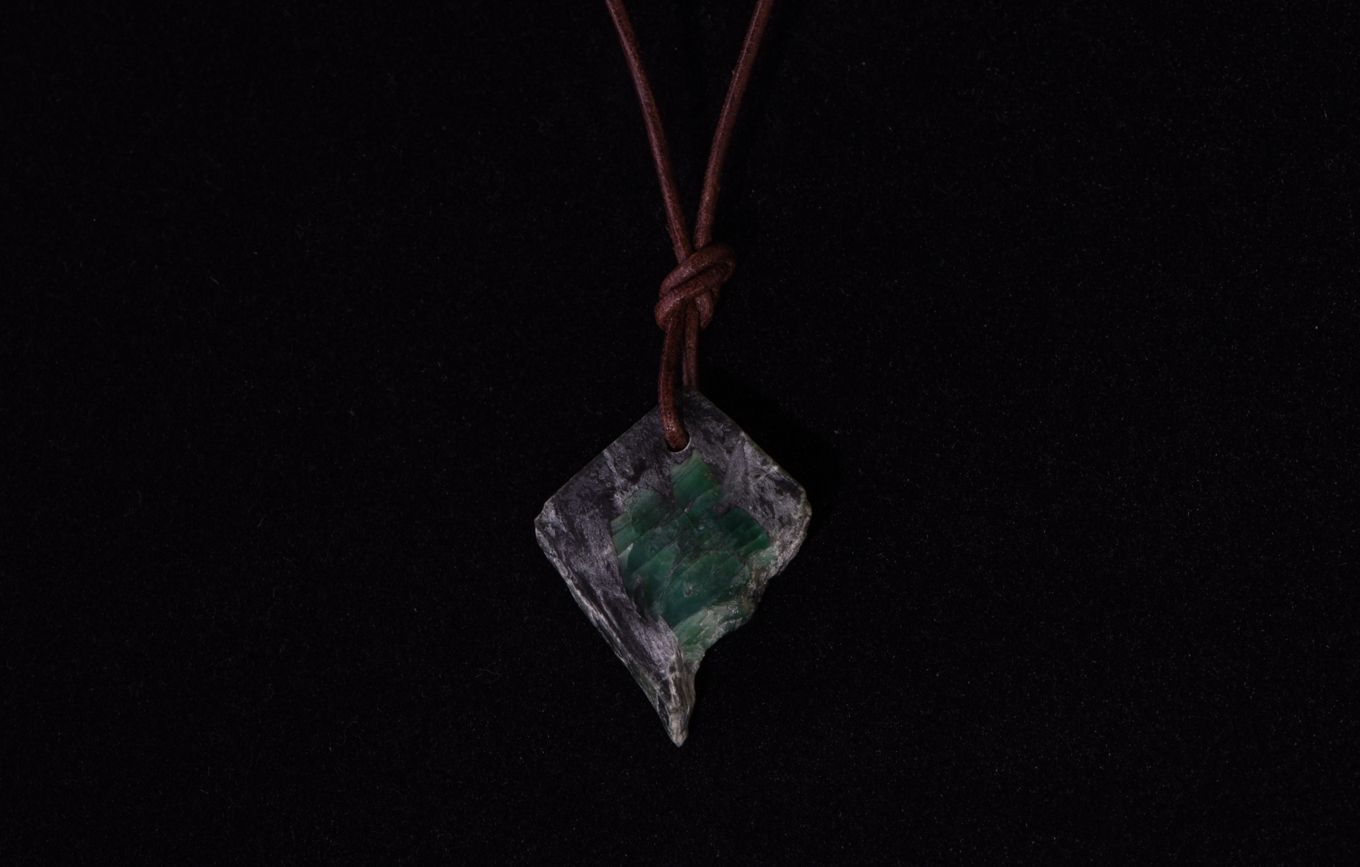 Mitten im Talk-Schiefer-Gestein sitzt ein 1,5 cm x 1,4 cm großer Smaragd - das Muttergestein wurde ebenfals angeschliffen. Der Stein wurde bei der Smaragdmine im Habachtal in Bramberg (Salzburg, Österreich) gefunden. Der Anhänger ist an einem größenverstellbarem Lederband befestigt.