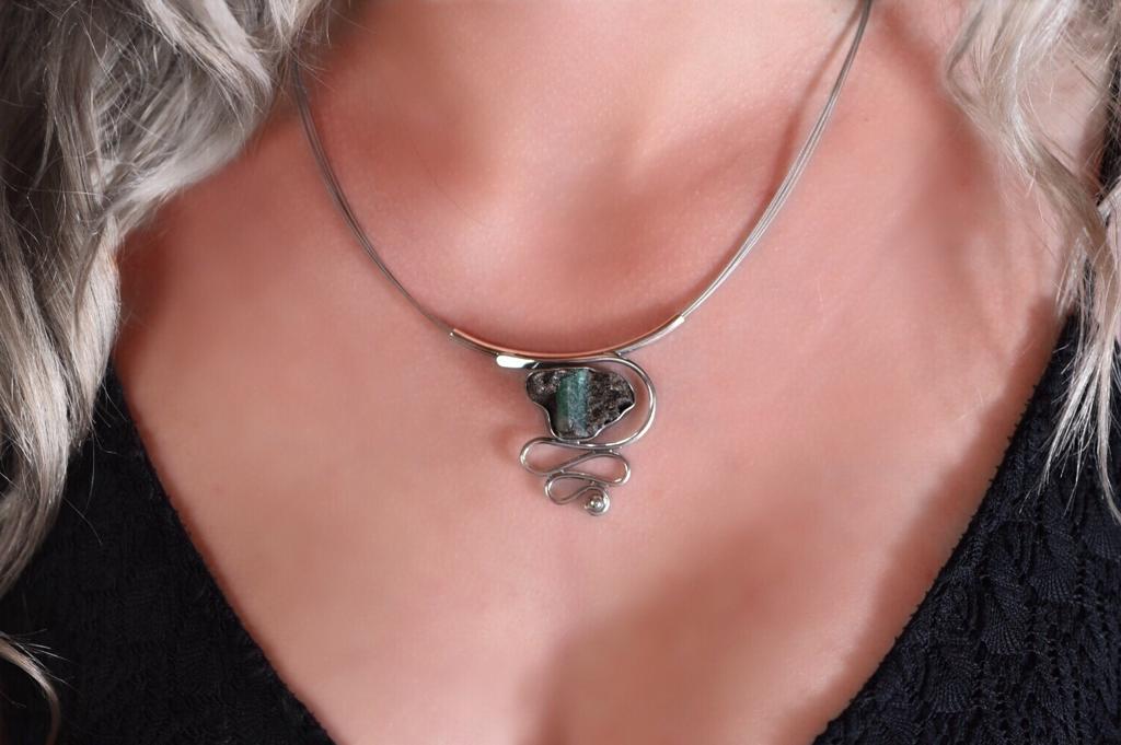 Ein großer, 1,4 cm langer Smaragd ist umgeben von Talk-Schiefer-Gestein und ist in Silber eingefasst. Das Metall ist teilweise geschwärzt. Der Stein wurde im Smaragdbergbau im Habachtal (Bramberg, Salzburg, Österreich) gefunden. Die Halskette besteht aus 5 Stahlseilen und ist im Preis enthalten.
