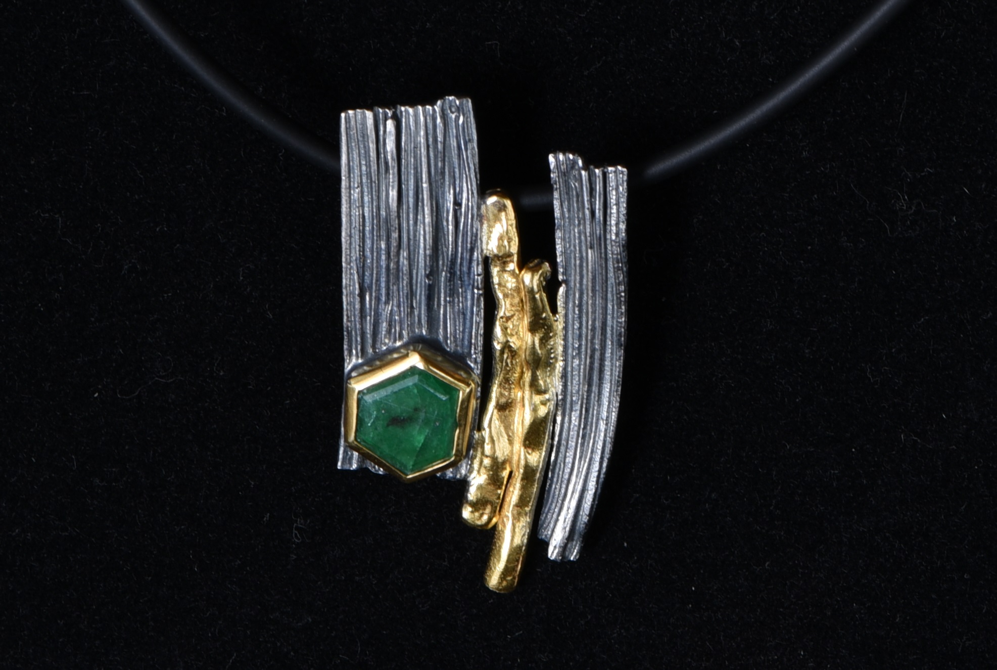 Ein 9 mm x 8 mm großer, facettierter Smaragd wurde in Silber eingefasst. Das Metall ist teilweise geschwärzt und vergoldet. Der Stein wurde im Smaragdbergbau im Habachtal (Bramberg, Salzburg, Österreich) gefunden.