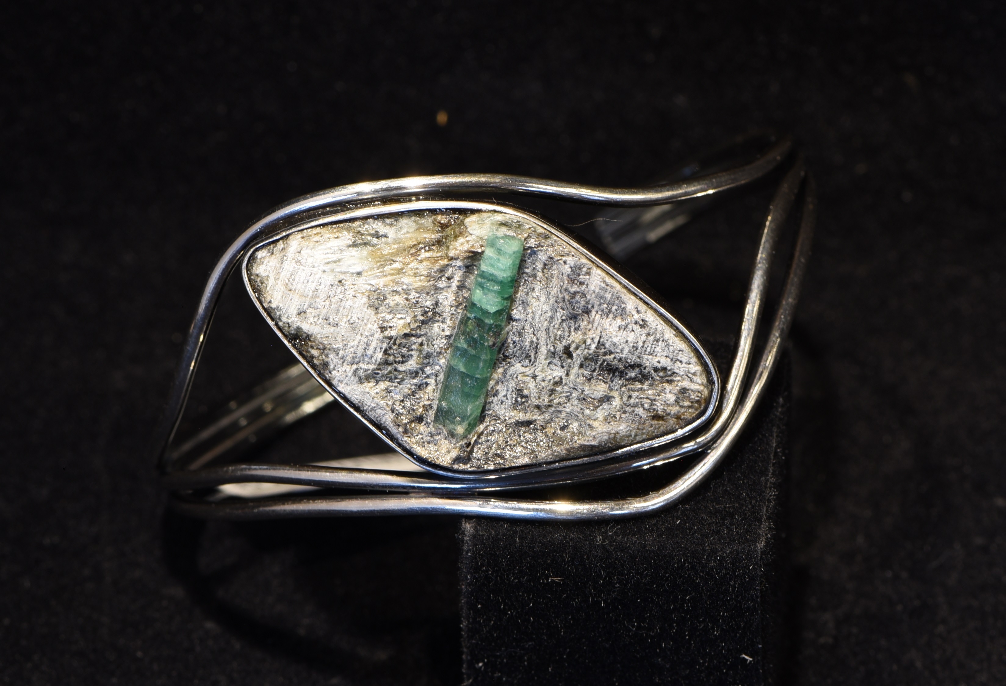 Ein 1,8 cm langer Smaragd ist umgeben von Talk-Schiefer-Gestein und ist in Silber eingefasst. Das Metall ist teilweise geschwärzt. Der Stein wurde im Smaragdbergbau im Habachtal (Bramberg, Salzburg, Österreich) gefunden. Der Armreif ist größenverstellbar (hinten offen)