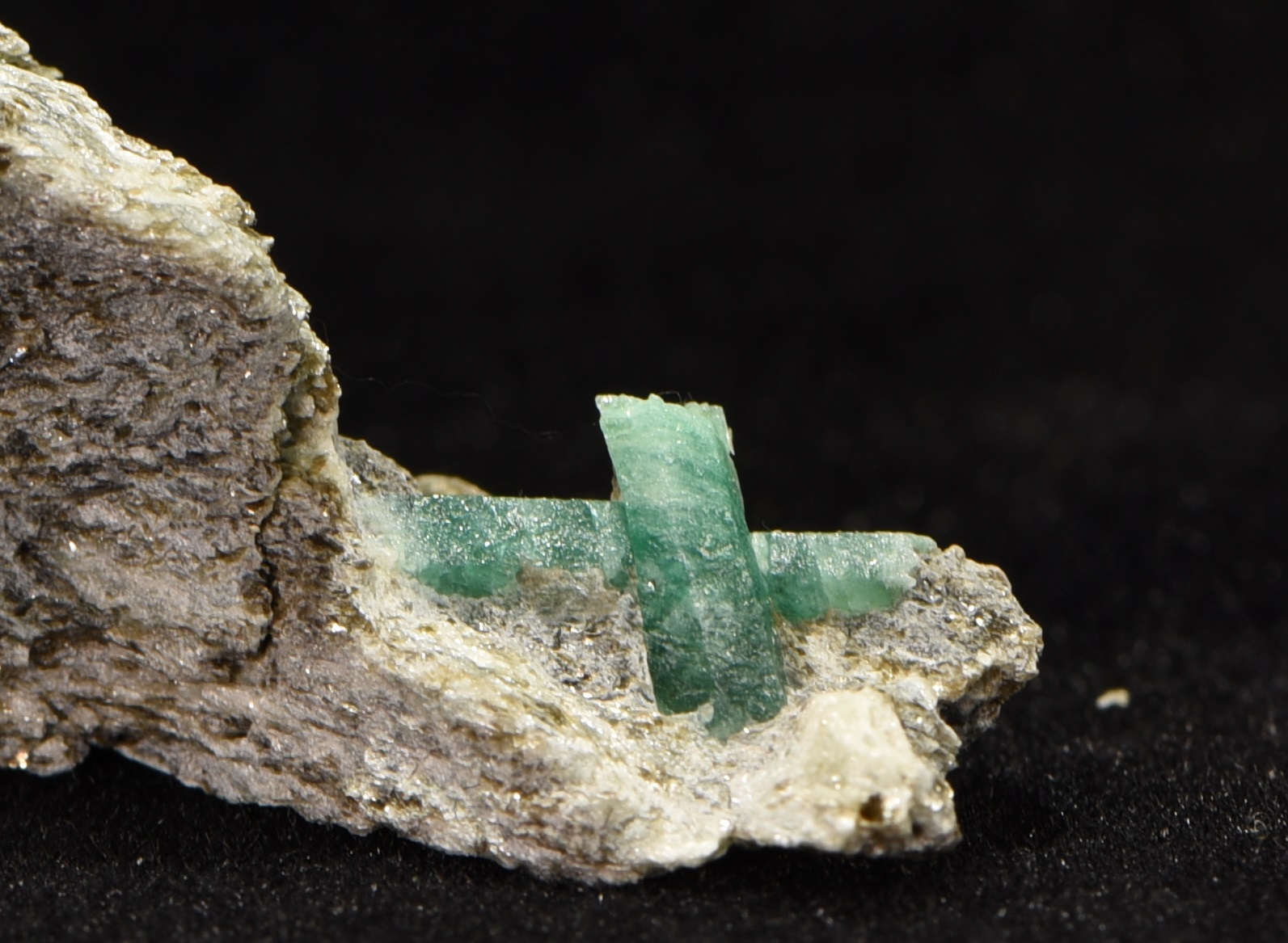 Eine wahre Seltenheit! Auf dieser Stufe sind 2 Smaragde in ein Kreuz verwachsen. Der längere Kristall misst 1,2 cm - der kürzere 0,9 cm.