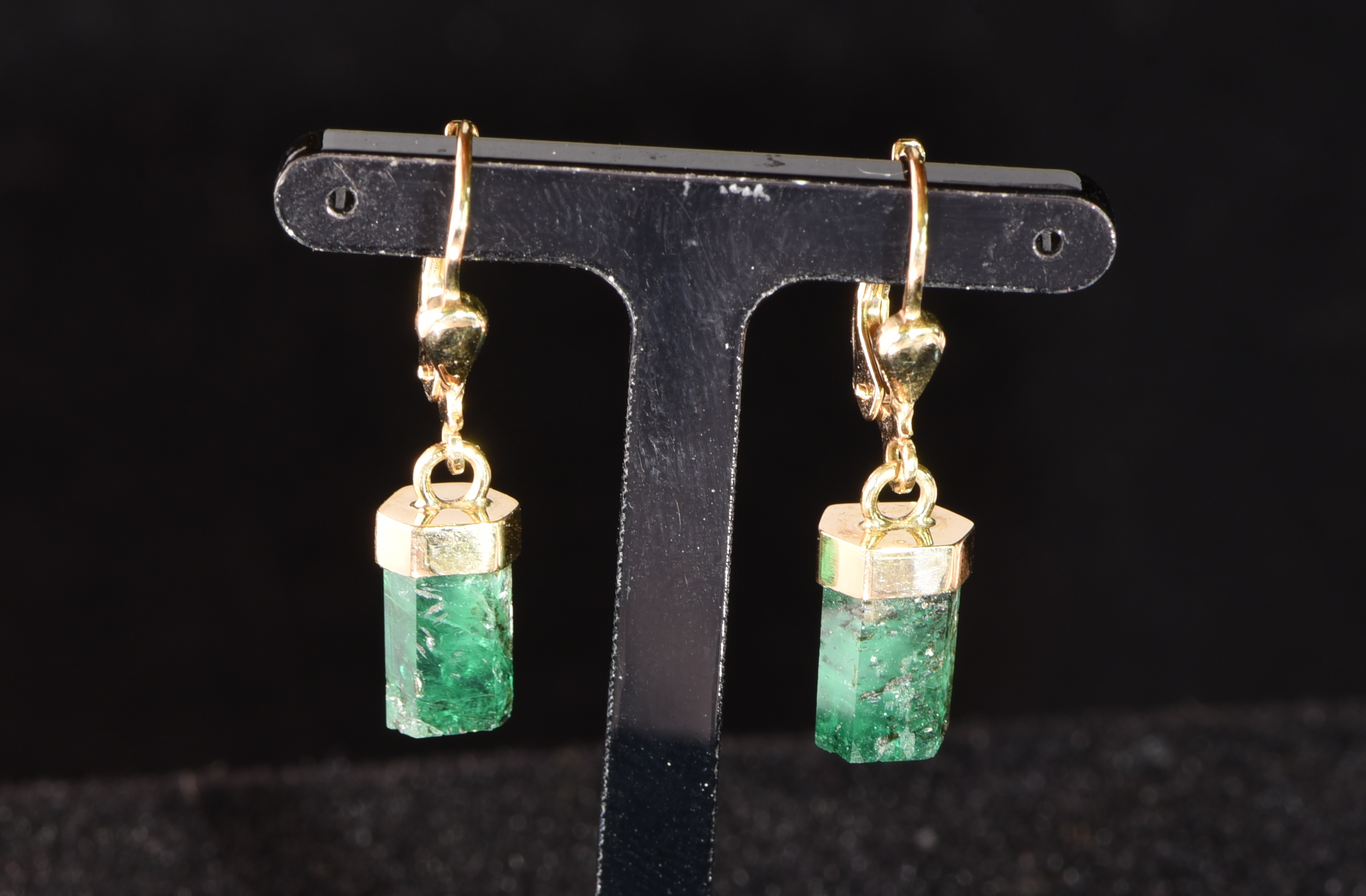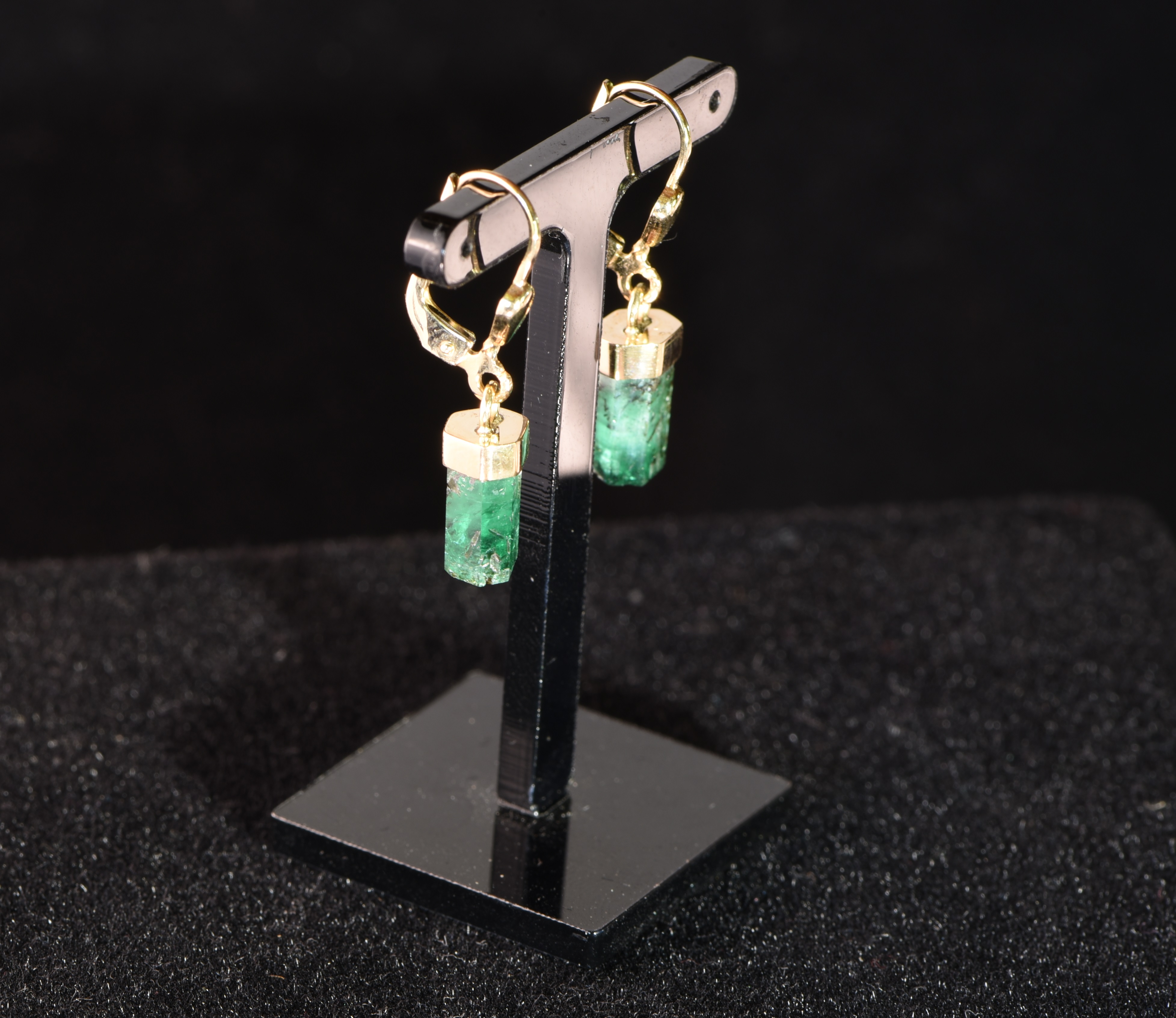 Die beiden Smaragde sind an den Naturflächen nachgeschliffen und in 585-er Gold eingefasst. Der sichtbare Teil der Kristalle ist jeweils 8 mm lang. Die Smaragde haben Top-Qualität: eine tiefgrüne, wunderschöne Farbe gepaart mit einer atemberaubendende Klarheit - diese Klarheits- und Farbkombination ergibt ein grasgrünes Smaragdfeuer, was im Habachtal eine wahre Seltenheit ist. Einige Biotit-Glimmerschiefer-Einschlüsse sind zu sehen. Die Steine wurden im Smaragdbergbau im Habachtal (Bramberg, Salzburg, Österreich) gefunden.