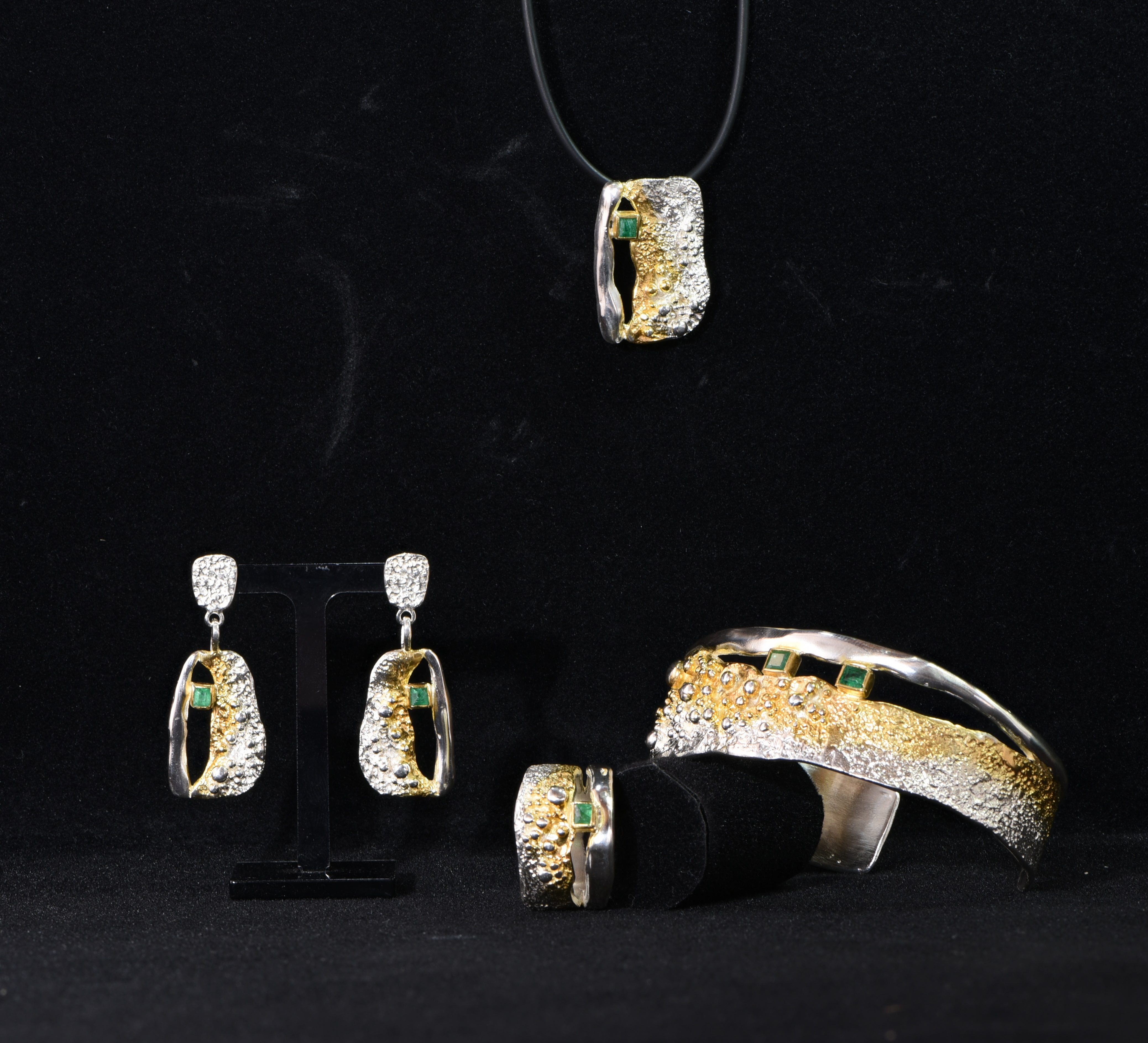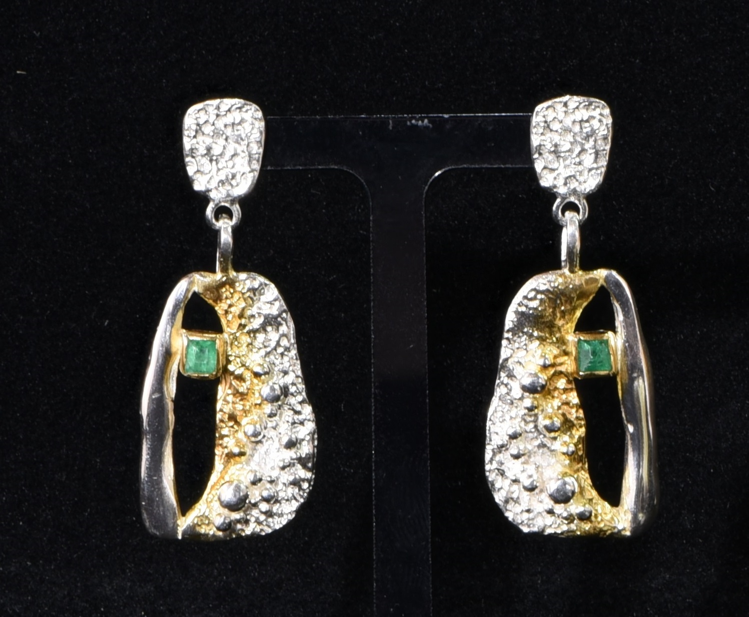 Zwei Smaragde wurden facettiert und in Silber eingefasst. Beide Kristalle sind 3 mm x 3 mm groß. Die Ohrhänger sind teilweise vergoldet. Die Steine wurden im Smaragdbergbau im Habachtal (Bramberg, Salzburg, Österreich) gefunden.
