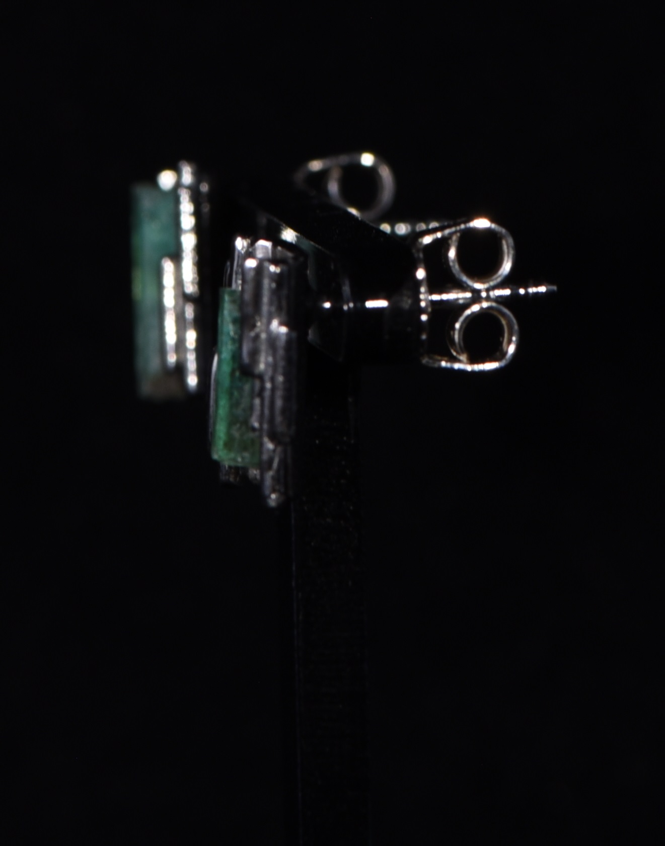 Die beiden Smaragde haben eine sehr gute Qualität, sind naturbelassen und in Silber eingefasst. Die Kristalle sind jeweils 0,8 cm lang und das Metall ist teilweise geschwärzt. Die Steine wurden im Smaragdbergbau im Habachtal (Bramberg, Salzburg, Österreich) gefunden.