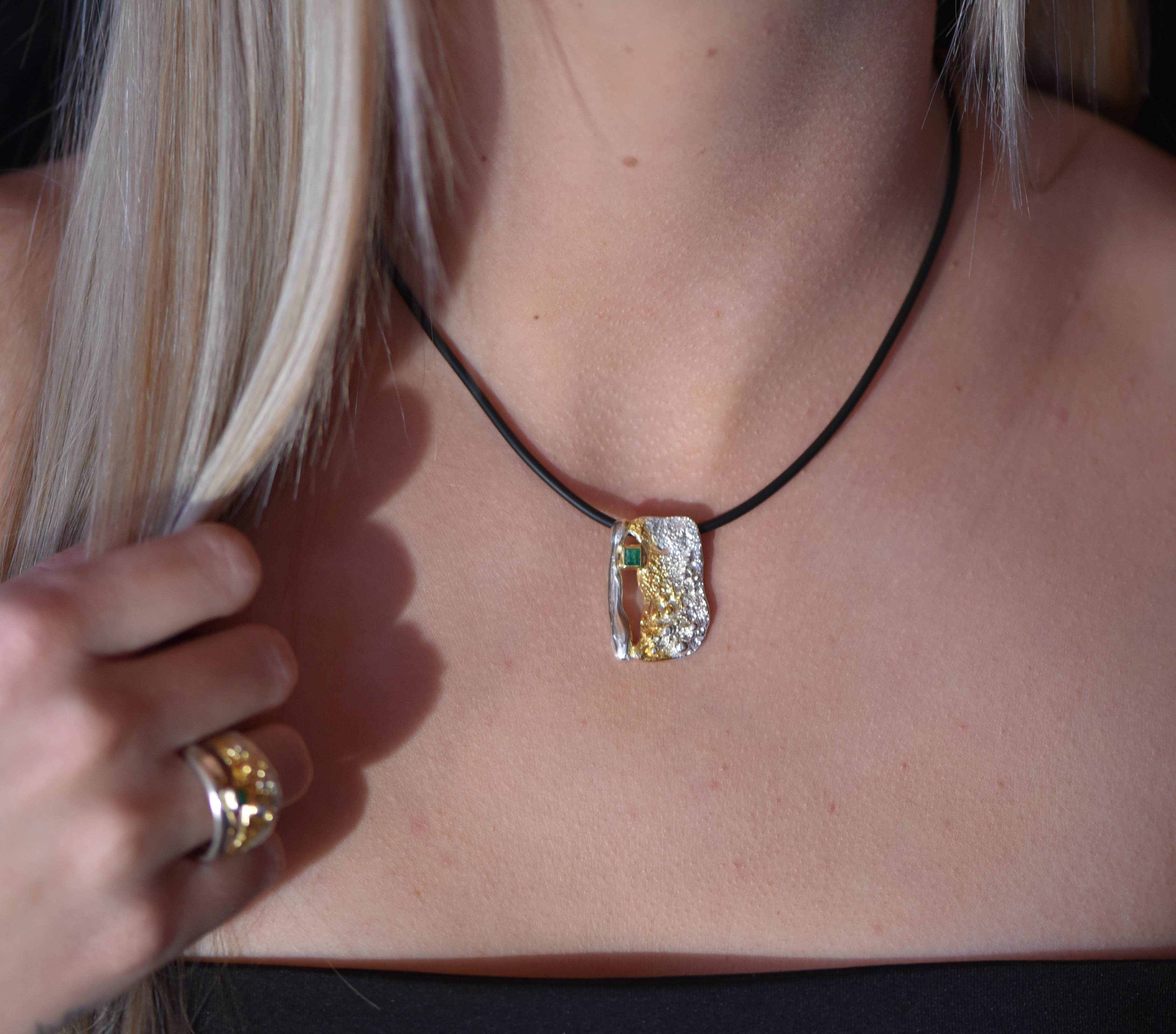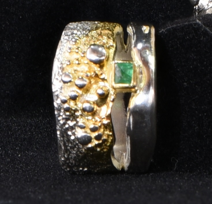 Ein facettierter Smaragd mit einer Größe von 3,5 mm x 3,5 mm wurde in einen Silberring eingefasst. Das Silber ist teilweise vergoldet. Der Smaragd wurde im Smaragdbergbau im Habachtal (Bramberg, Salzburg, Österreich) gefunden.