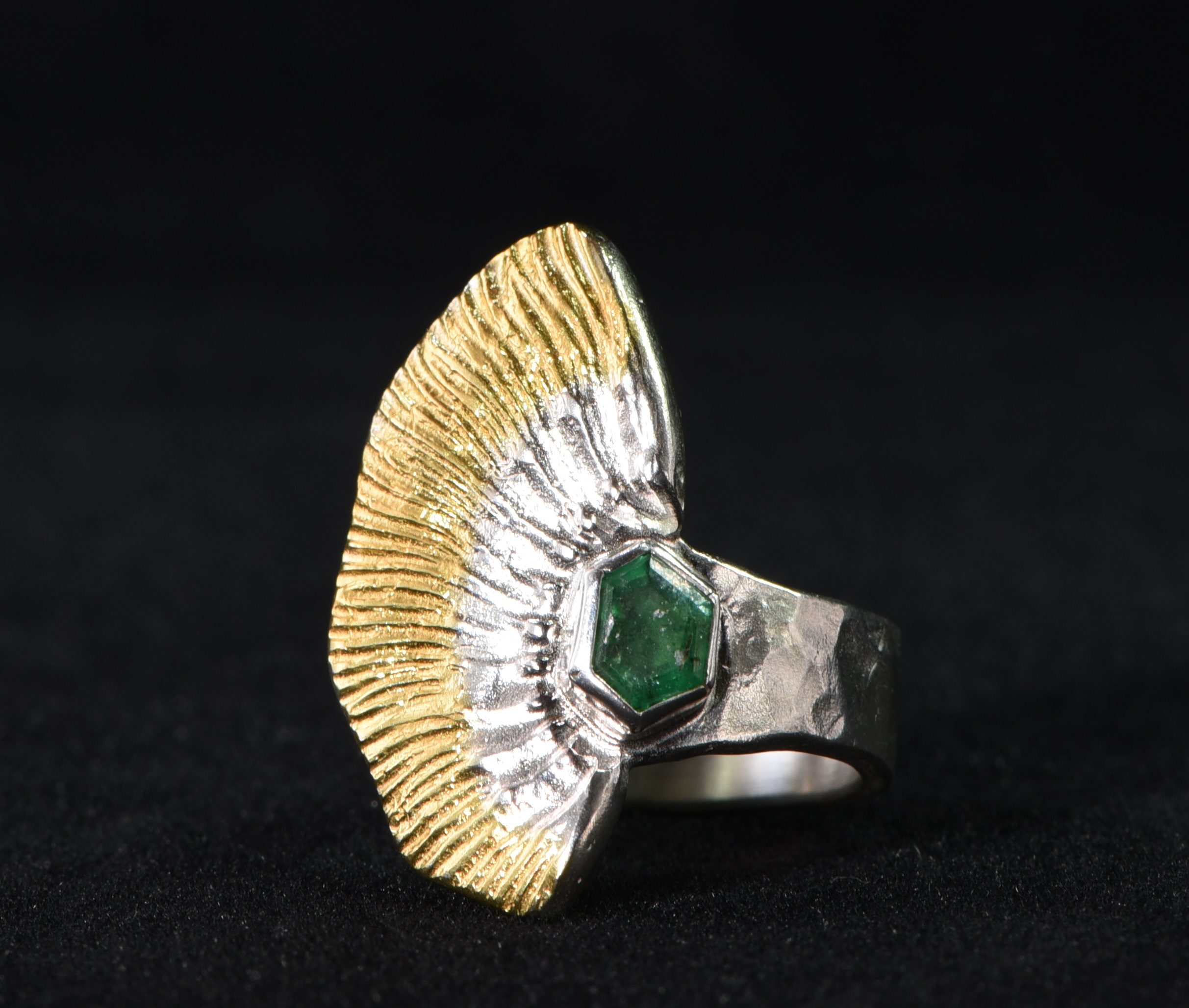 Ein facettierter Smaragd mit einer Größe von 5 mm x 7 mm wurde in einen Silberring eingefasst. Der Silberring ist teilweise vergoldet. Der Smaragd wurde im Smaragdbergbau im Habachtal (Bramberg, Salzburg, Österreich) gefunden.
