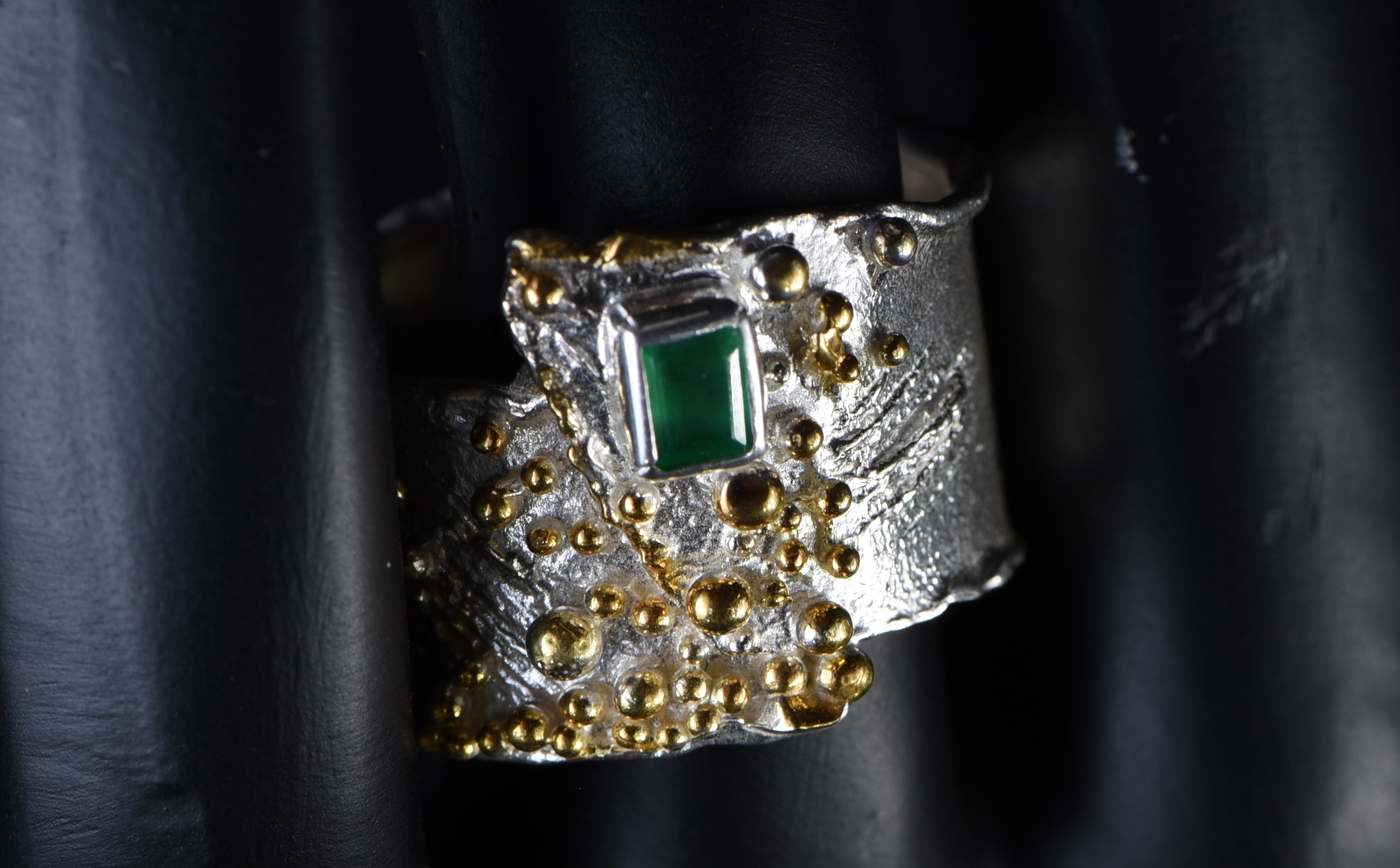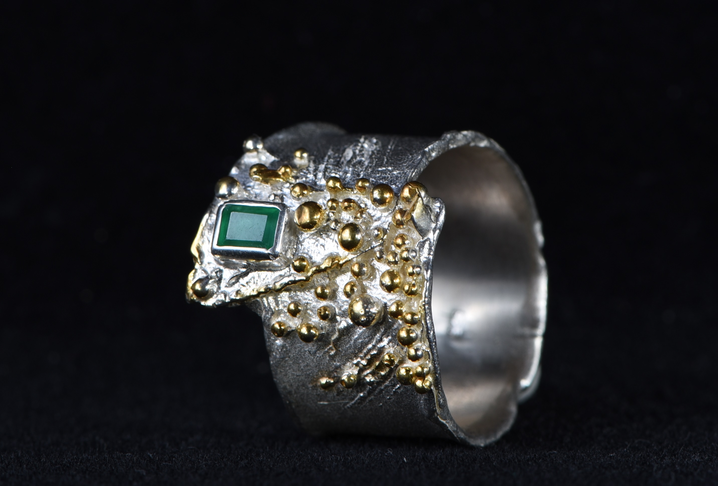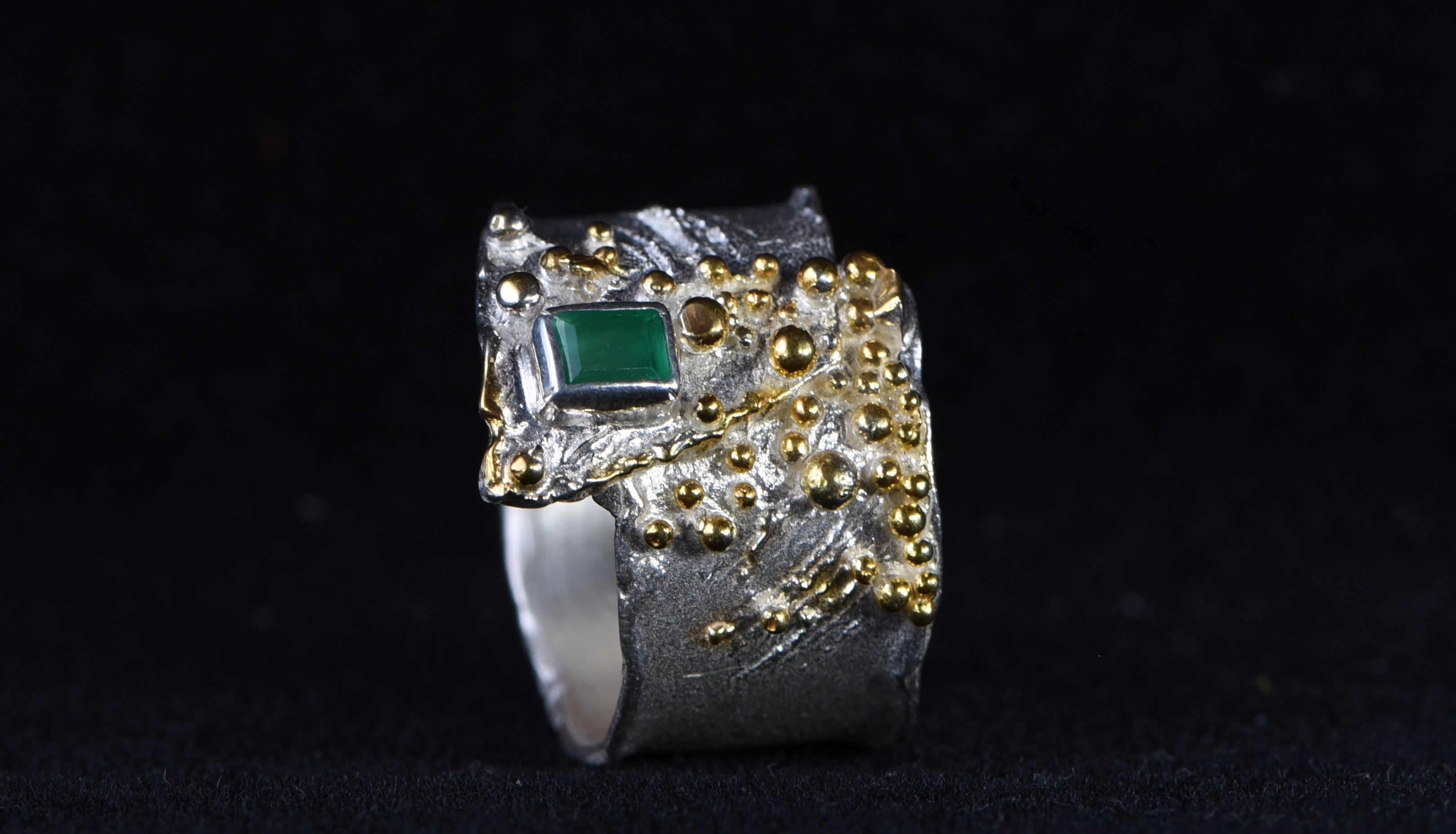 Ein facettierter Smaragd mit einer Größe von 3 mm x 4 mm wurde in einen Silberring eingefasst. Der Silberring ist teilweise geschwärzt und vergoldet. Der Smaragd wurde im Smaragdbergbau im Habachtal (Bramberg, Salzburg, Österreich) gefunden.