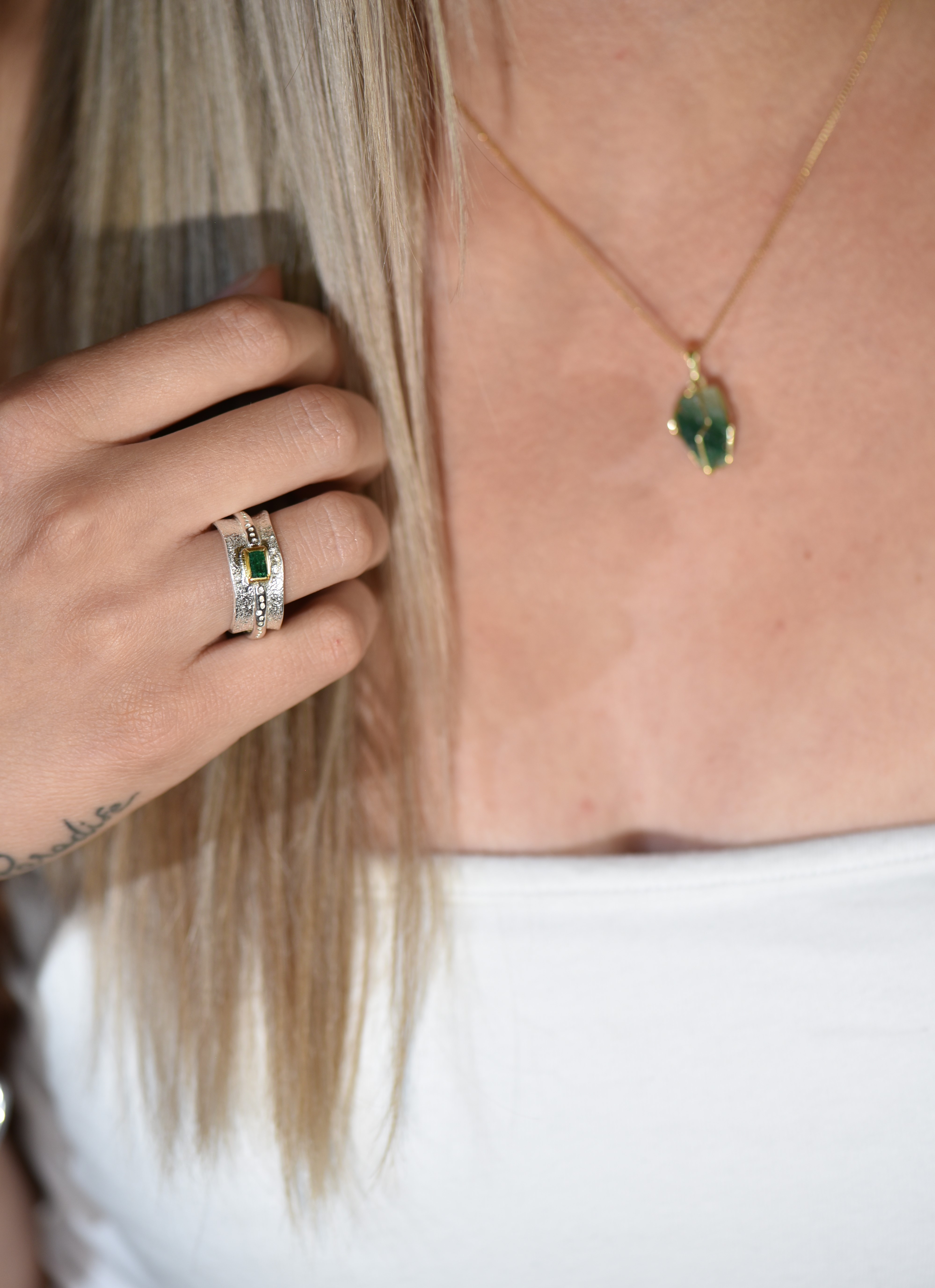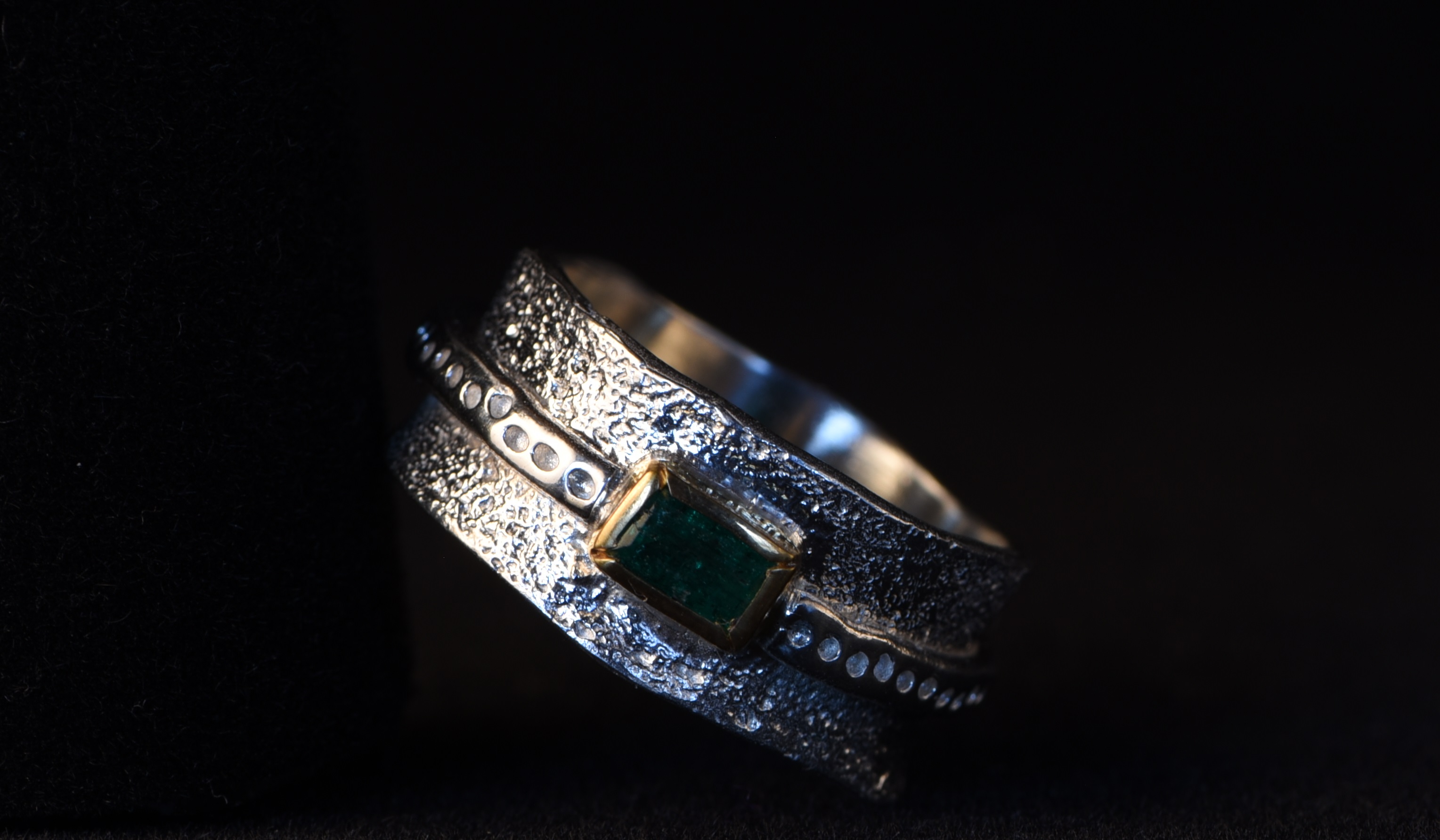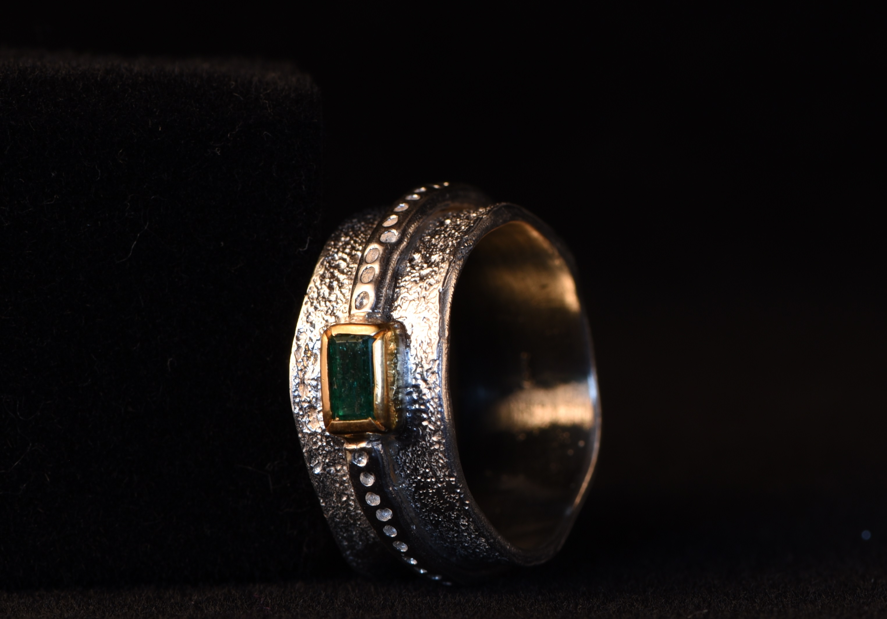 Ein facettierter Smaragd mit einer Größe von 5 mm x 3 mm wurde in einen Silberring eingefasst. Der Silberring ist teilweise vergoldet. Der Smaragd wurde im Smaragdbergbau im Habachtal (Bramberg, Salzburg, Österreich) gefunden.
