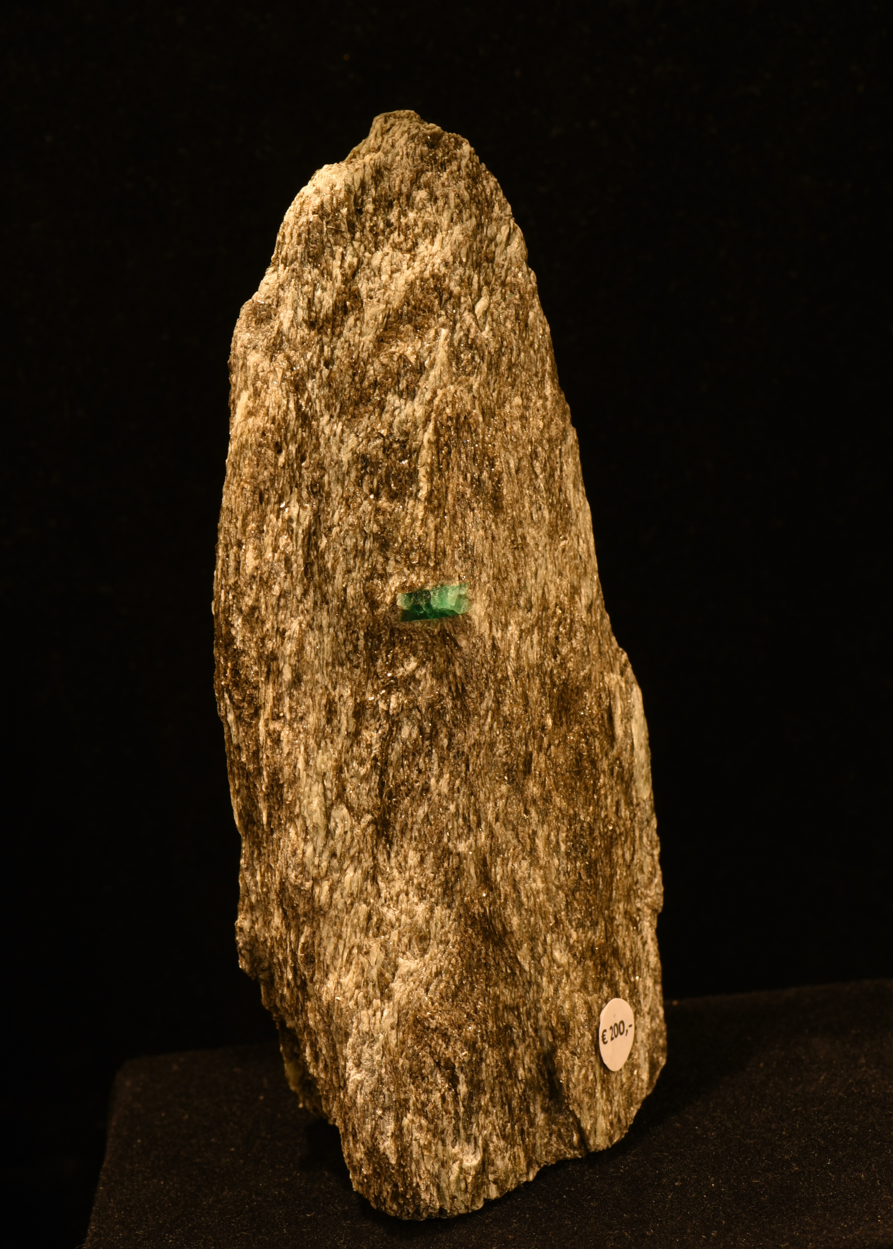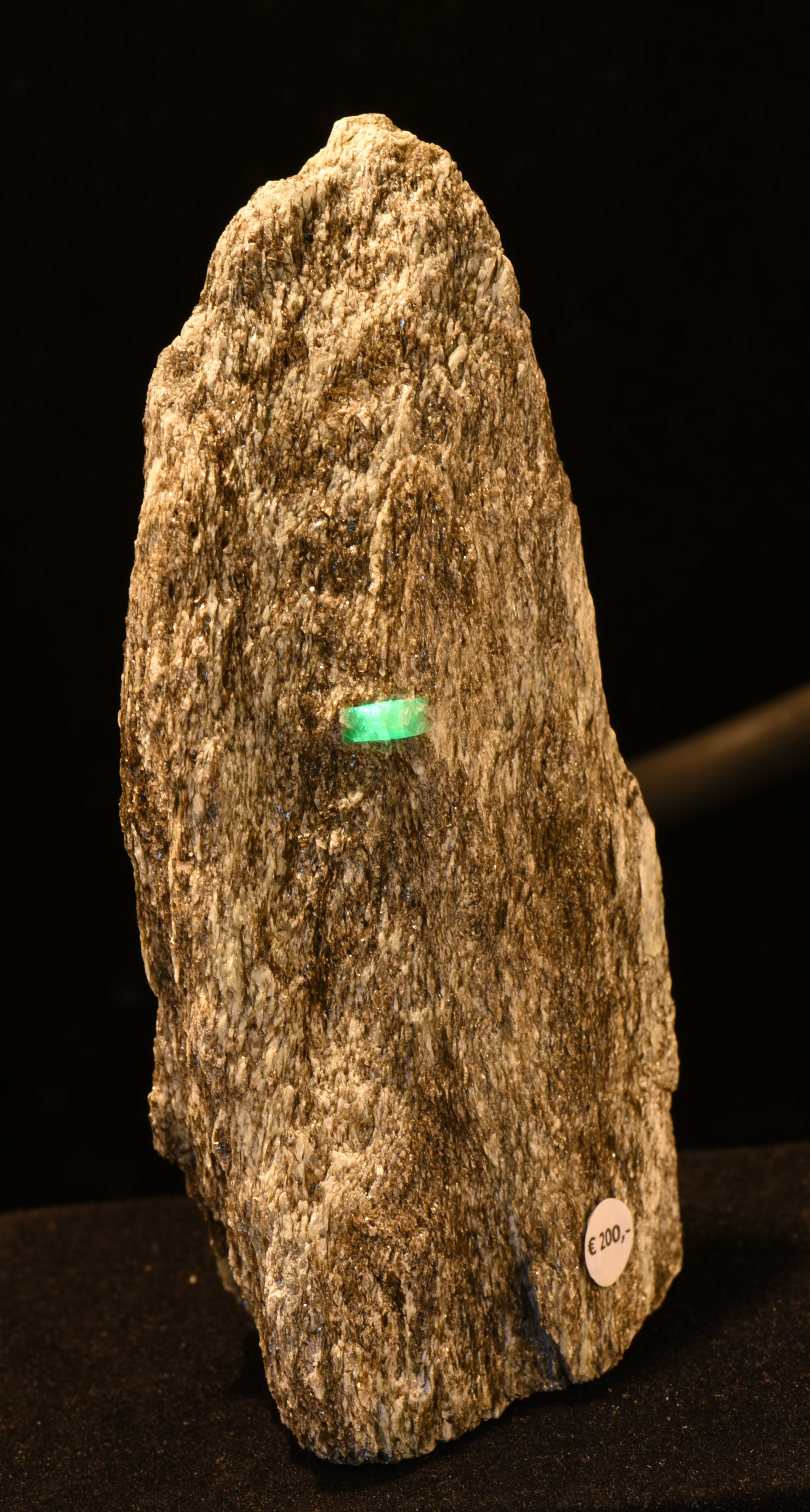 Auf dieser 14 cm hohen Stufe sitzt eine 1 cm langer Smaragd mit sehr guter Qualität und Farbe. Der Stein wurde von beiden Seiten freigelegt, wodurch die Farbe sehr gut zur Geltung kommt. Der Stein leuchtet, wenn man ihn auf ein Fensterbrett stellt oder eine Lampe dahinter stellt. Die Stufe ist unten flach, wodurch sie sich perfekt hinstellen lässt.