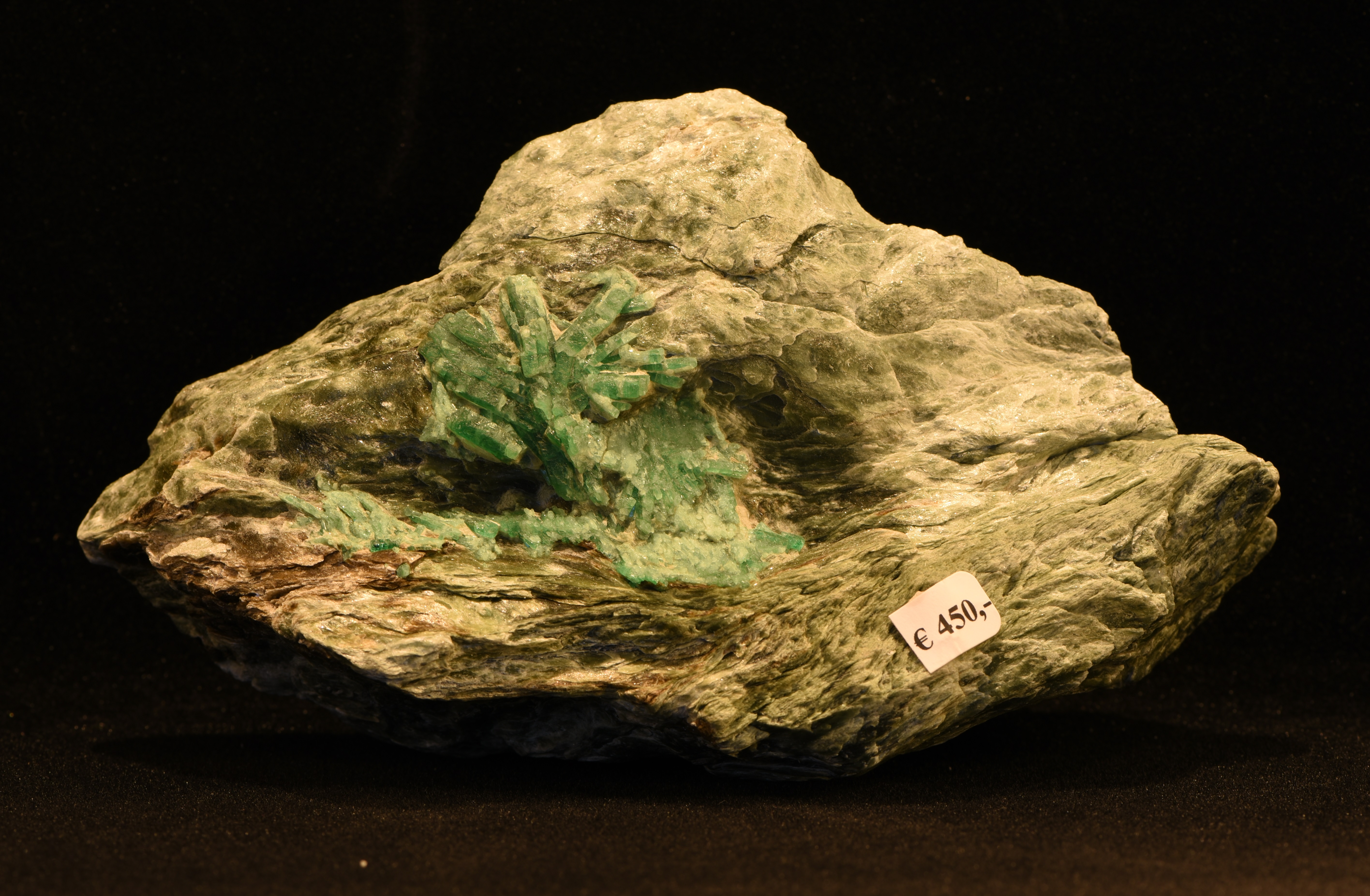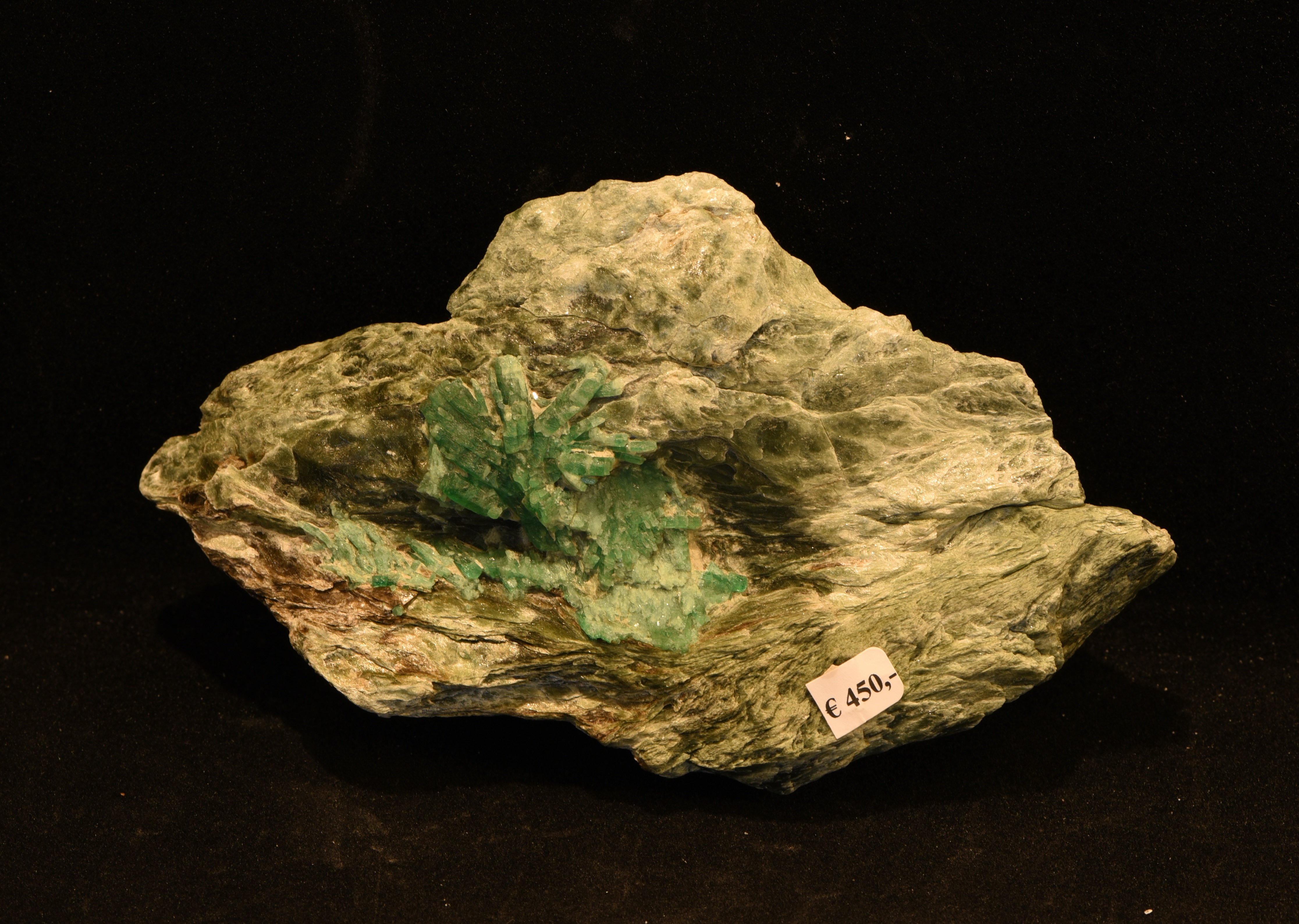 Auf dieser 15 cm x 8 cm großen Stufe sitzen mehrere, ineinander verwachsene Smaragde, die wie ein Stern aussehen. Die Verwachsung ist 6 cm breit und 3,5 cm hoch und einige Smaragde haben eine atemberaubende Klarheit.