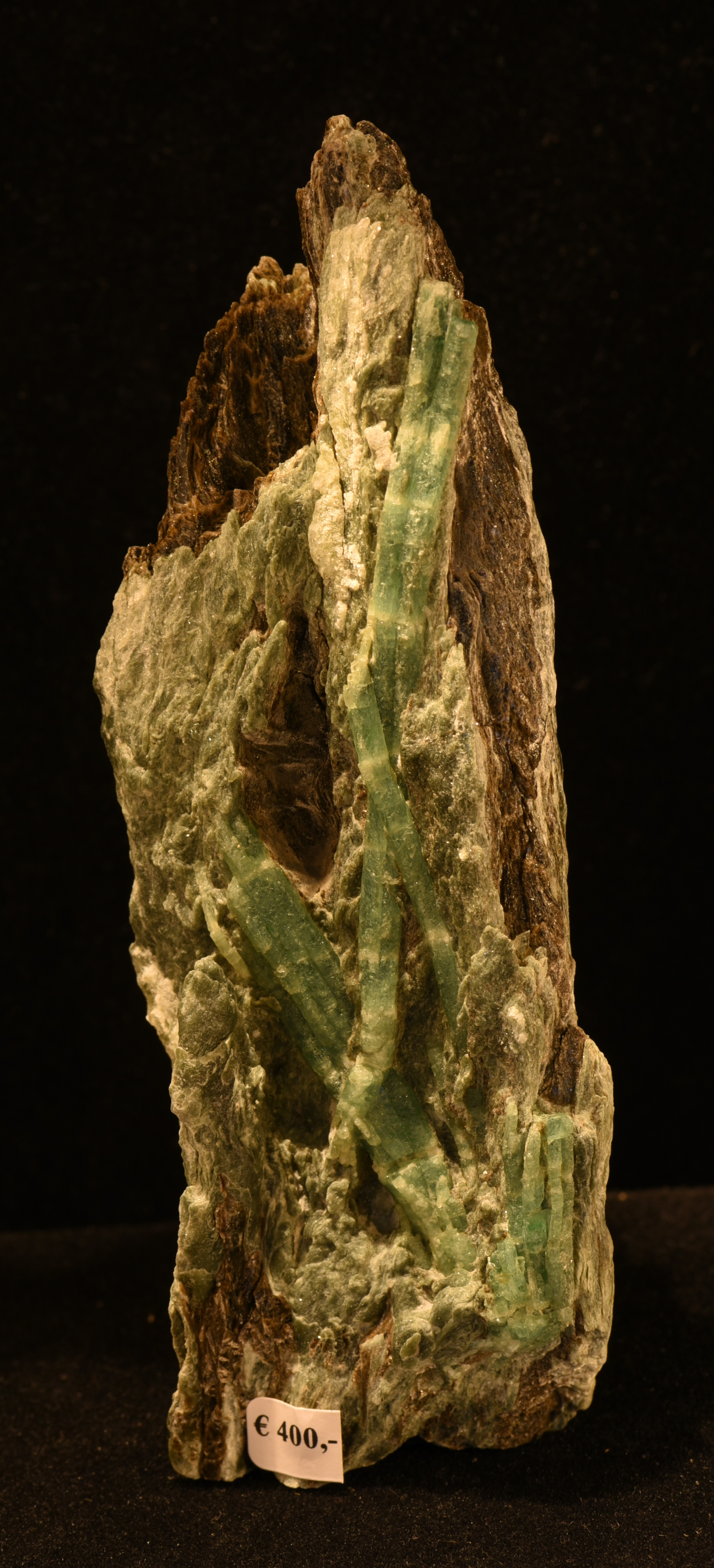 Auf dieser 14 cm hohen Stufe eine 11 cm lange Smaragd-Verwachsung. Die Verwachsung ist nicht nur lang - die dickste Stelle misst stolze 1,2 cm. Das Muttergestein (Biotit-Glimmerschiefer) hat einige dunklere Stellen, wodurch ein sehr schönes Gesamtbild entsteht. Die Stufe ist unten flach, wodurch sie sich perfekt hinstellen lässt.