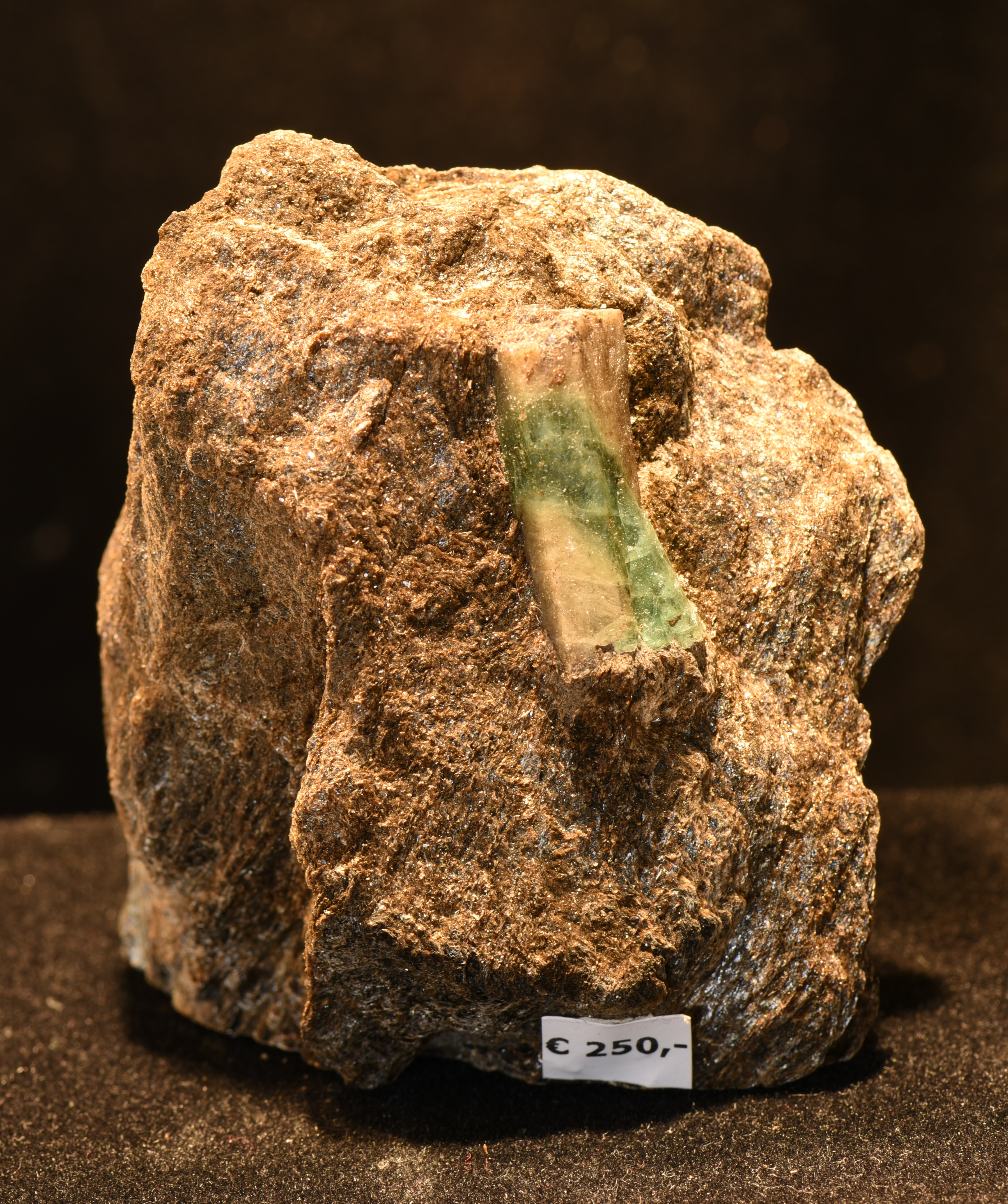 Auf dieser Stufe sitzt ein hochinteressanter Riese. Der 2,8 cm lange Mischkristall ist über einen Zentimeter. Ein Smaragd ist ein chromhaltiger Beryll - das Chrom ist das farbgebende Metall. Bei diesem Beryll sieht man, dass nur ein schmaler, ca. 5 mm breiter Strich, der sich durch den Smaragd zieht, chromhaltig und daher auch grün ist. Das interessante ist ebenfalls, dass die grüne Stelle eine hohe Transparenz im Vergleich zum farblosen, undurchsichtigem Beryll aufweist. Eine wirklich interessante Stufe!