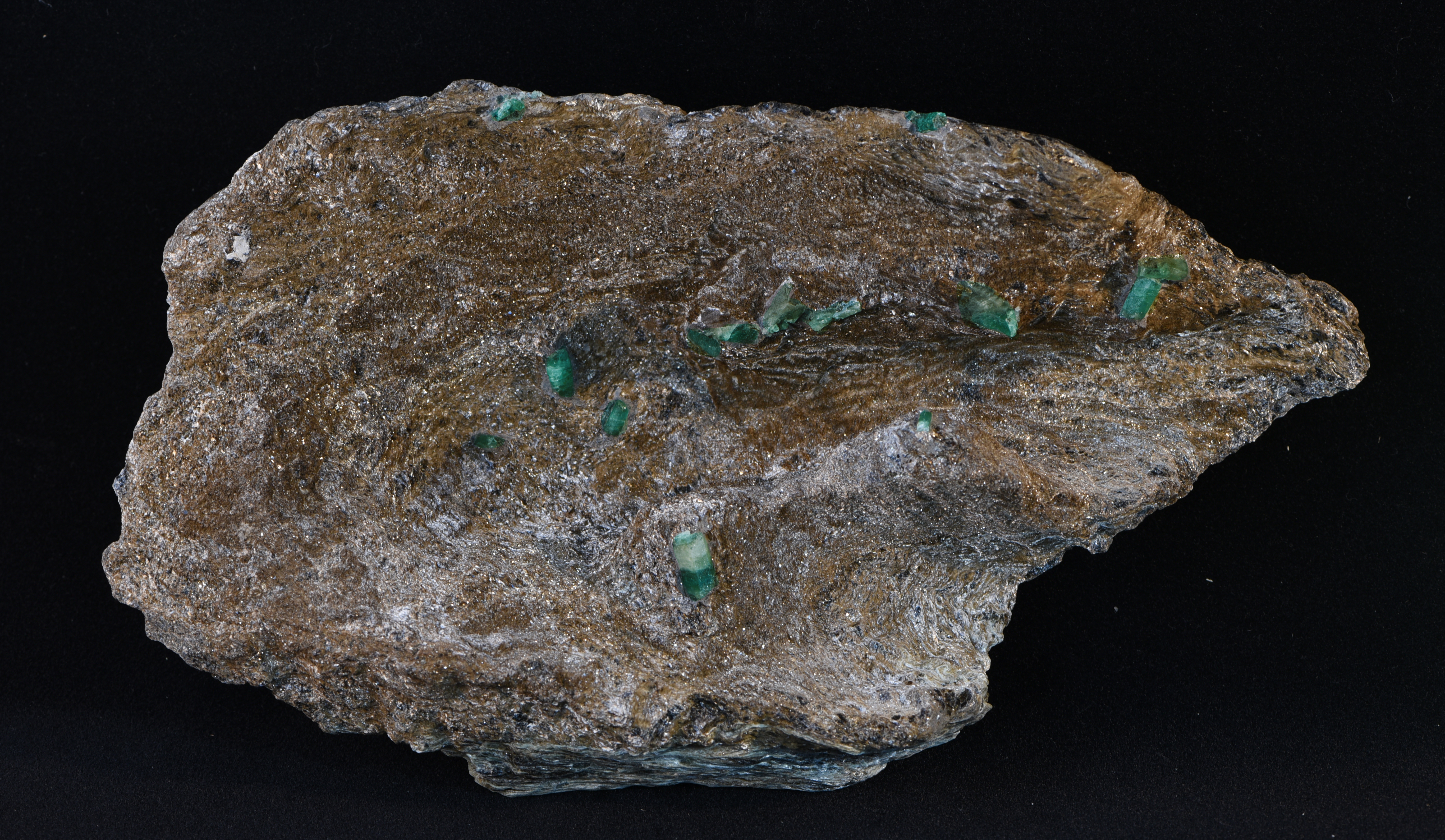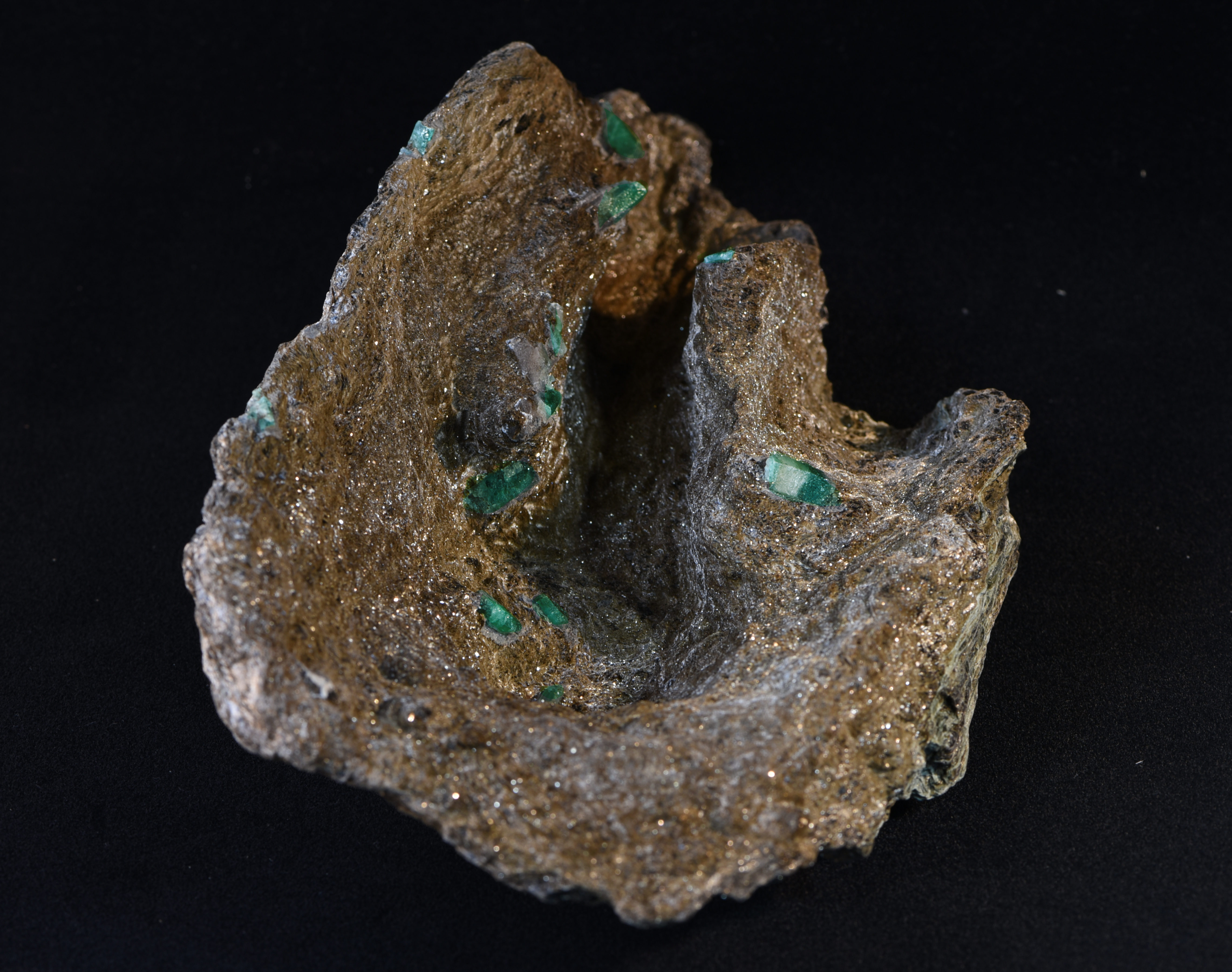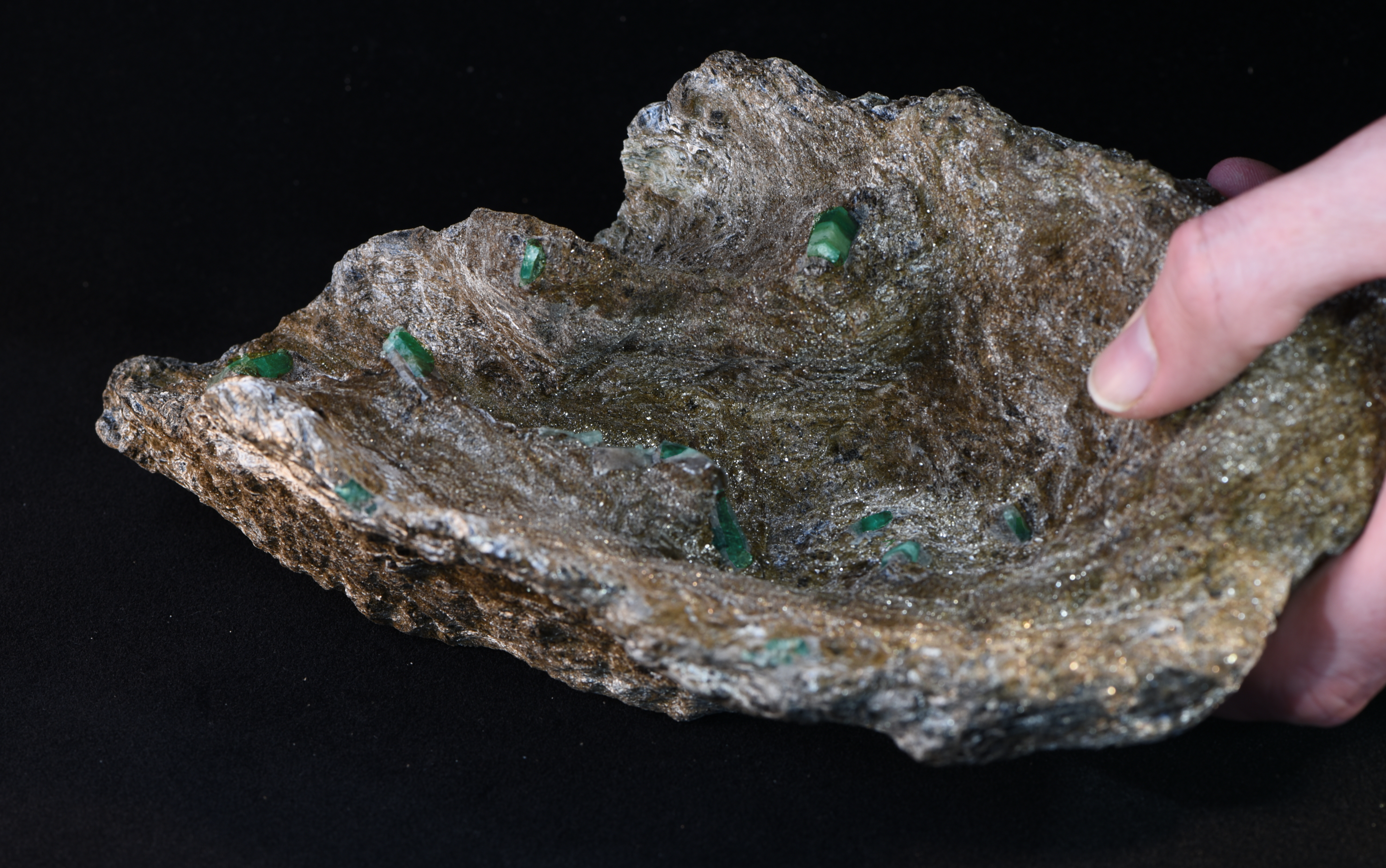 Auf dieser großen Smaragdschale sitzen 14 Smaragde. Der größte Kristall (1 cm x 6 mm) hat 2 Gesichter - die obere Hälfte des Kristalls ist beryllgrau und die untere Hälfte ist tiefgrün und wäre schleifbar.
