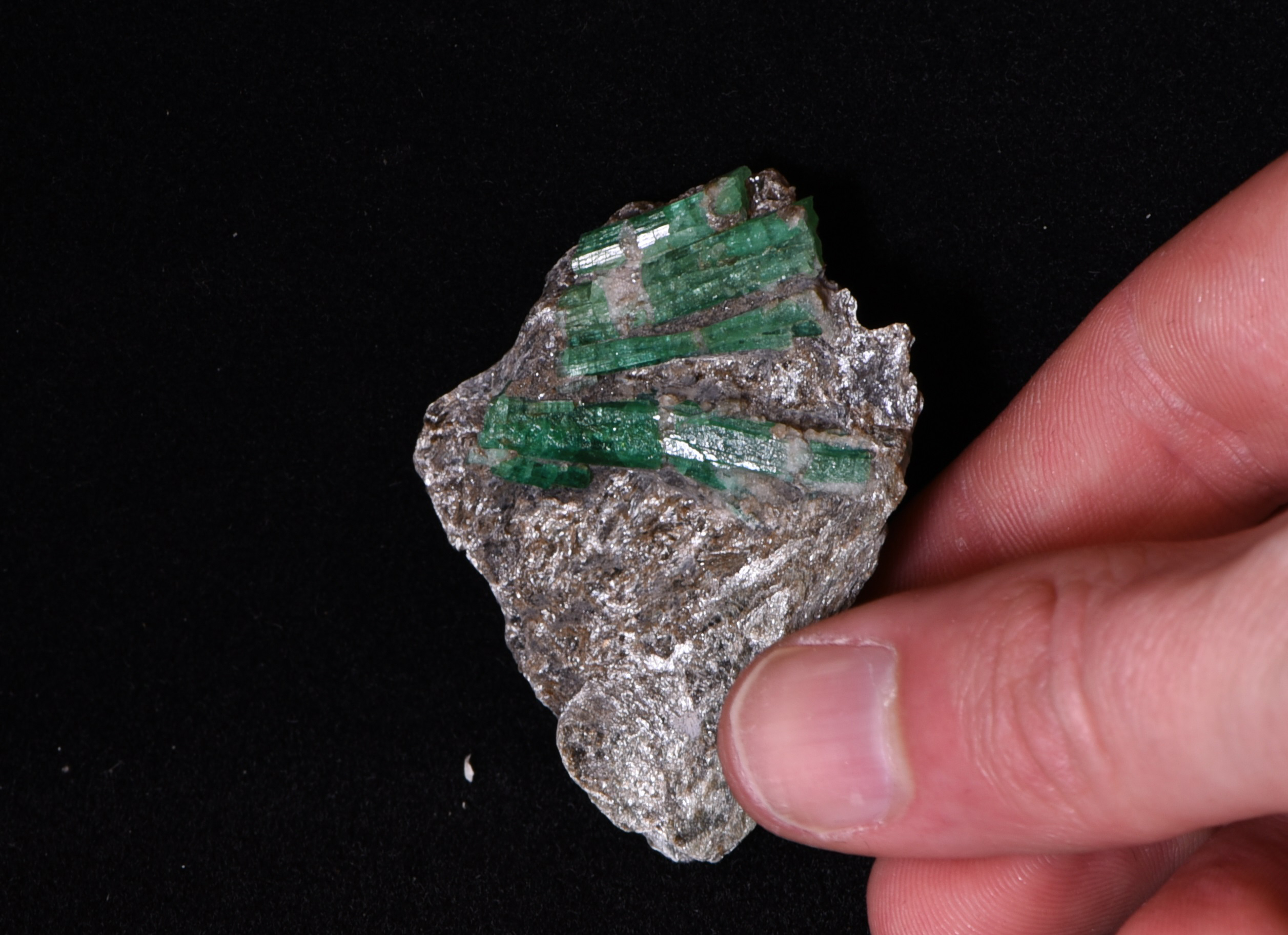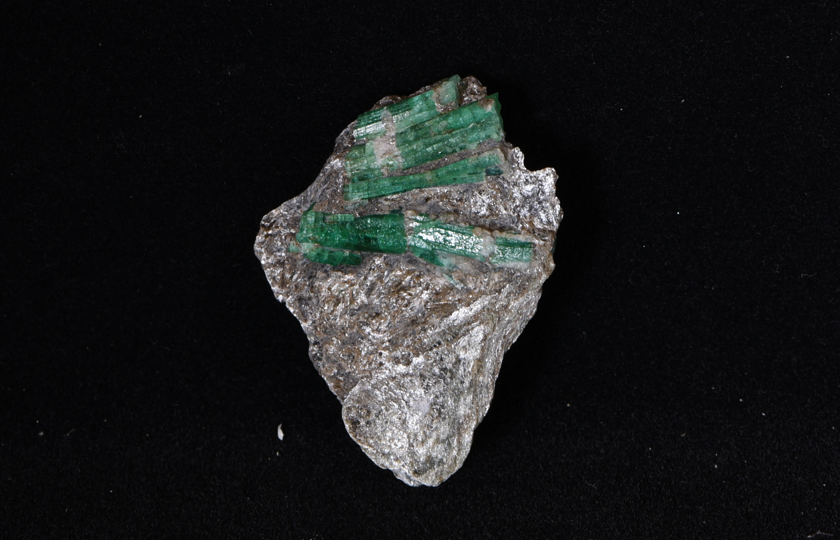 Auf dieser kleinen Stufe sitzen mehrere, ineinander verwachsene Smaragde. Die Verwachsung nimmt eine Gesamtfläche von 3 cm x 2,4 cm ein.