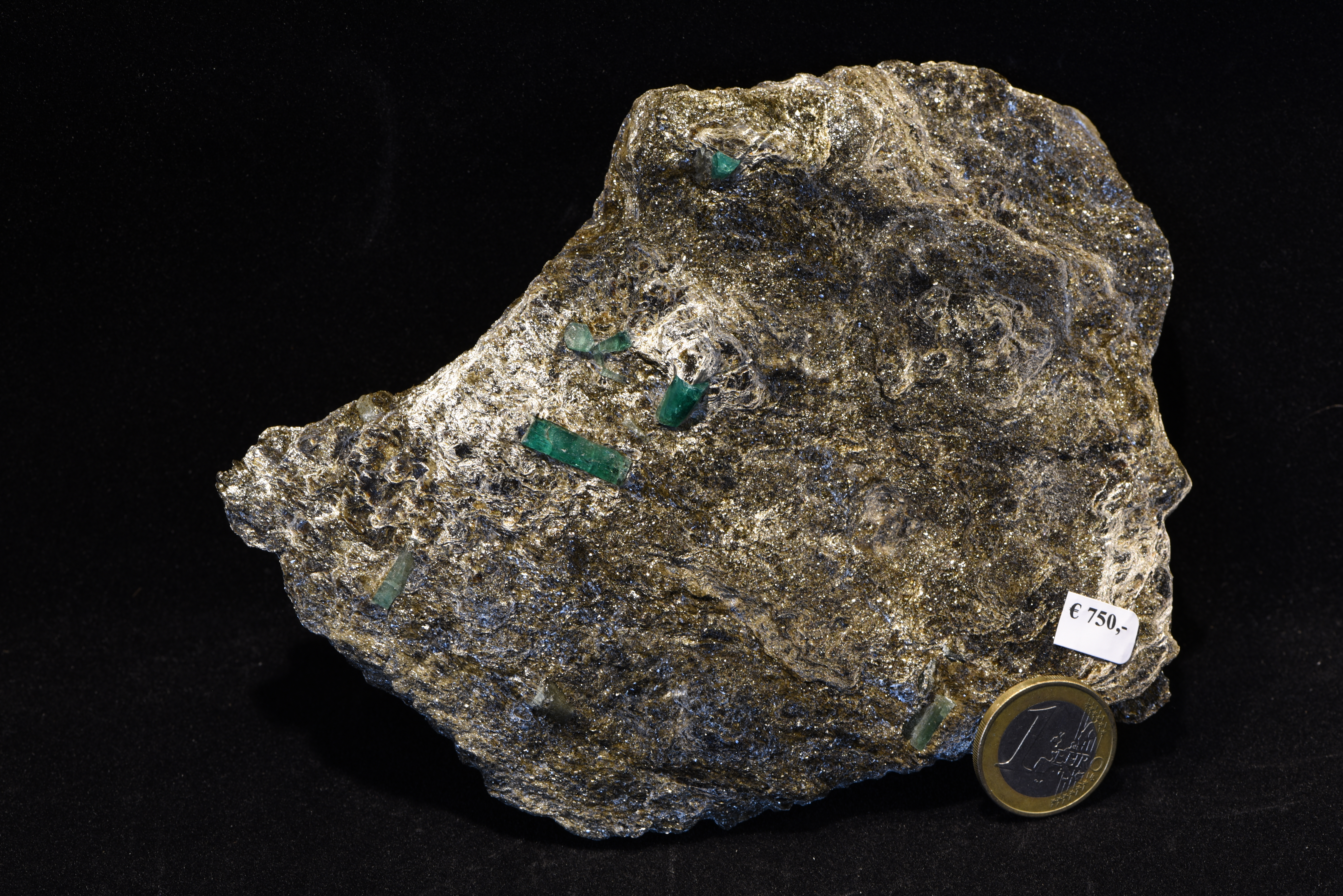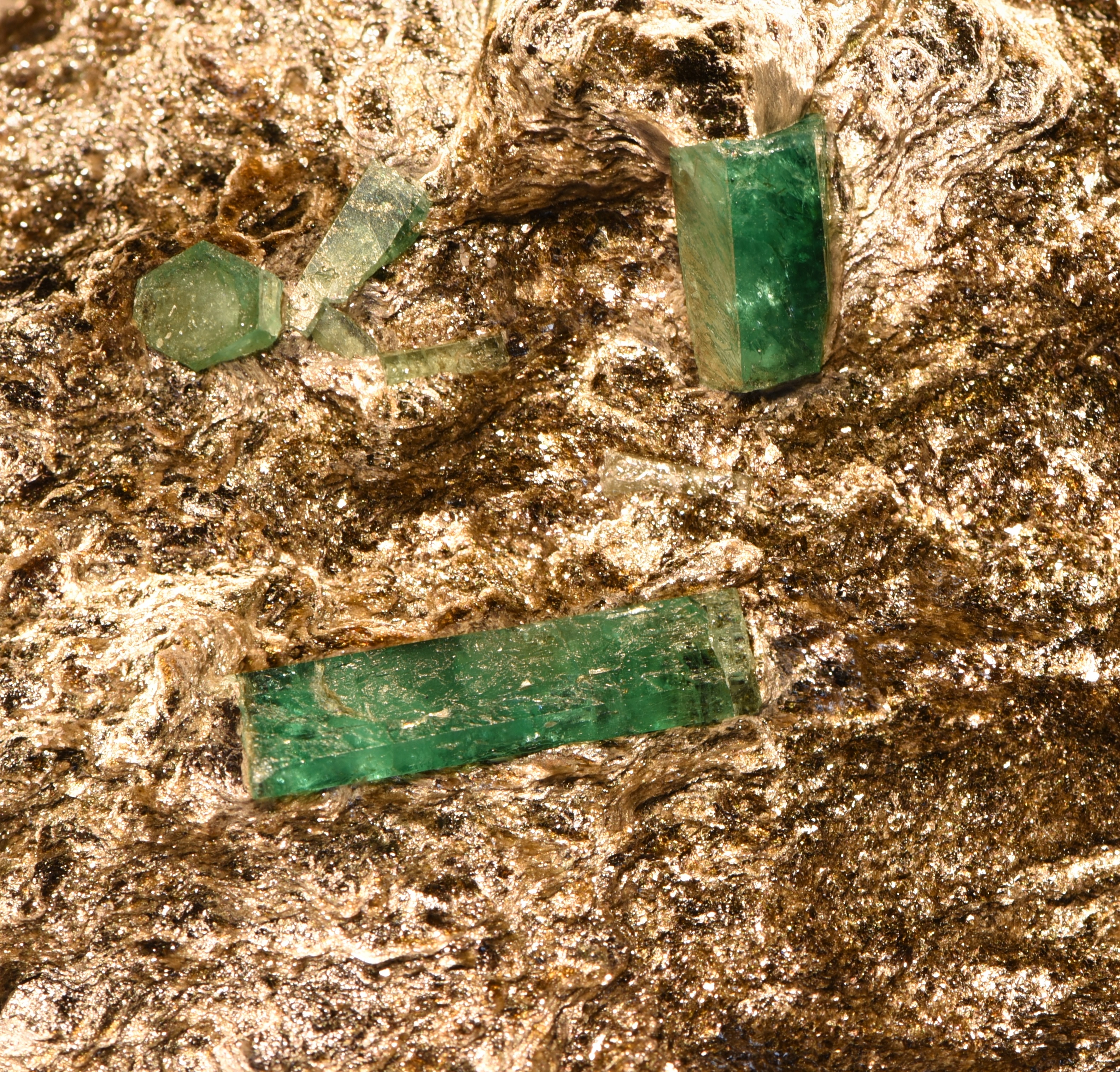 Auf dieser flachen Biotit-Glimmerschiefer-Platte sitzen einige Smaragde. Der längste Kristall misst ganze 1,6 cm und hat neben der tiefgrünen Farbe auch eine atemberaubende Klarheit. Über dem größten Kristall befindet sich links eine Smaragd-Verwachsung - bei einem Smaragd sieht man nur die glatte, glänzende Endfläche (was eine wahre Besonderheit ist, da die Endflächen der habachtaler Smaragde normalerweise ausgefranst sind!).