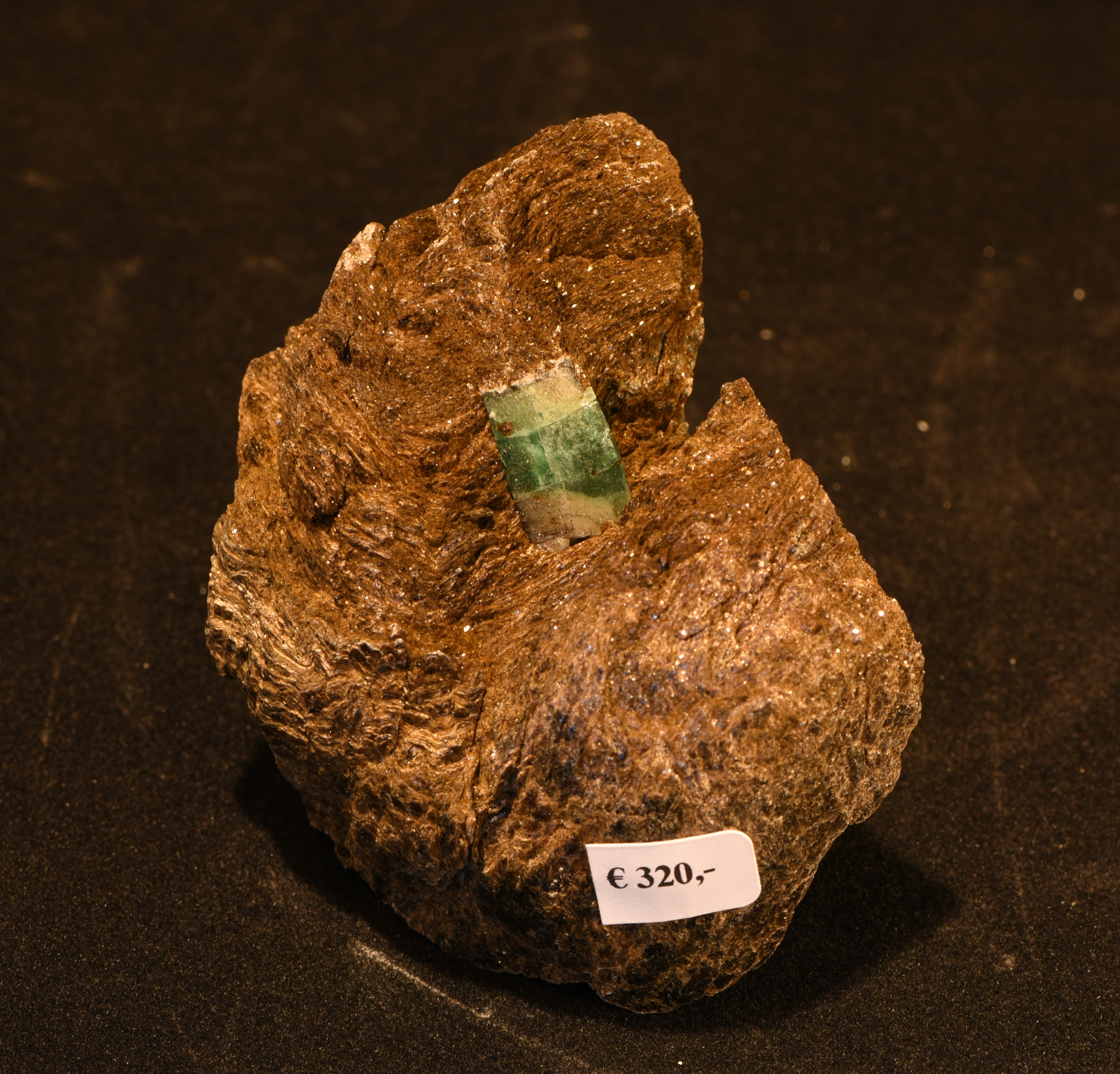 Auf dieser 5,5 cm hohen Stufe sitzt ein ca. 1,5 cm langer und 1 cm dicker, hochinteressanter Smaragd. Während die Mitte des Smaragdes eine unglaubliche, tiefgrüne Farbe aufweist, gehen die beiden Enden eher ins Weißliche (wäre der gesamte Kristall weiß, würde es sich um einen Beryll handeln) Die Stufe lässt sich perfekt hinstellen, sodass der Smaragd nach vorne schaut.