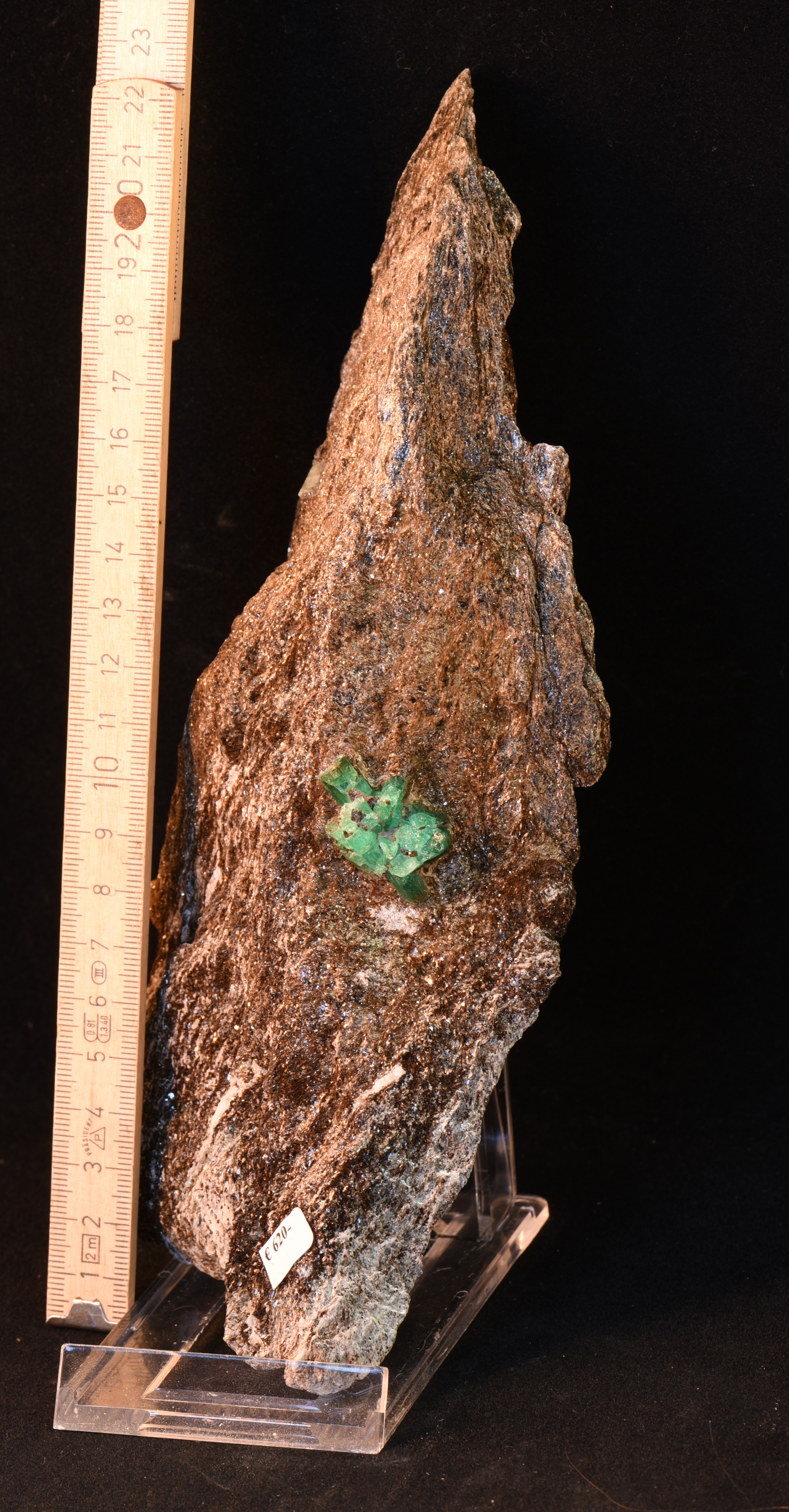 Die Stufe ist 25 cm hoch und die Verwachsung nimmt eine Fläche von ca. 3 cm x 2 cm ein -die Smaragde haben eine sehr schöne, leuchtend grüne Farbe.