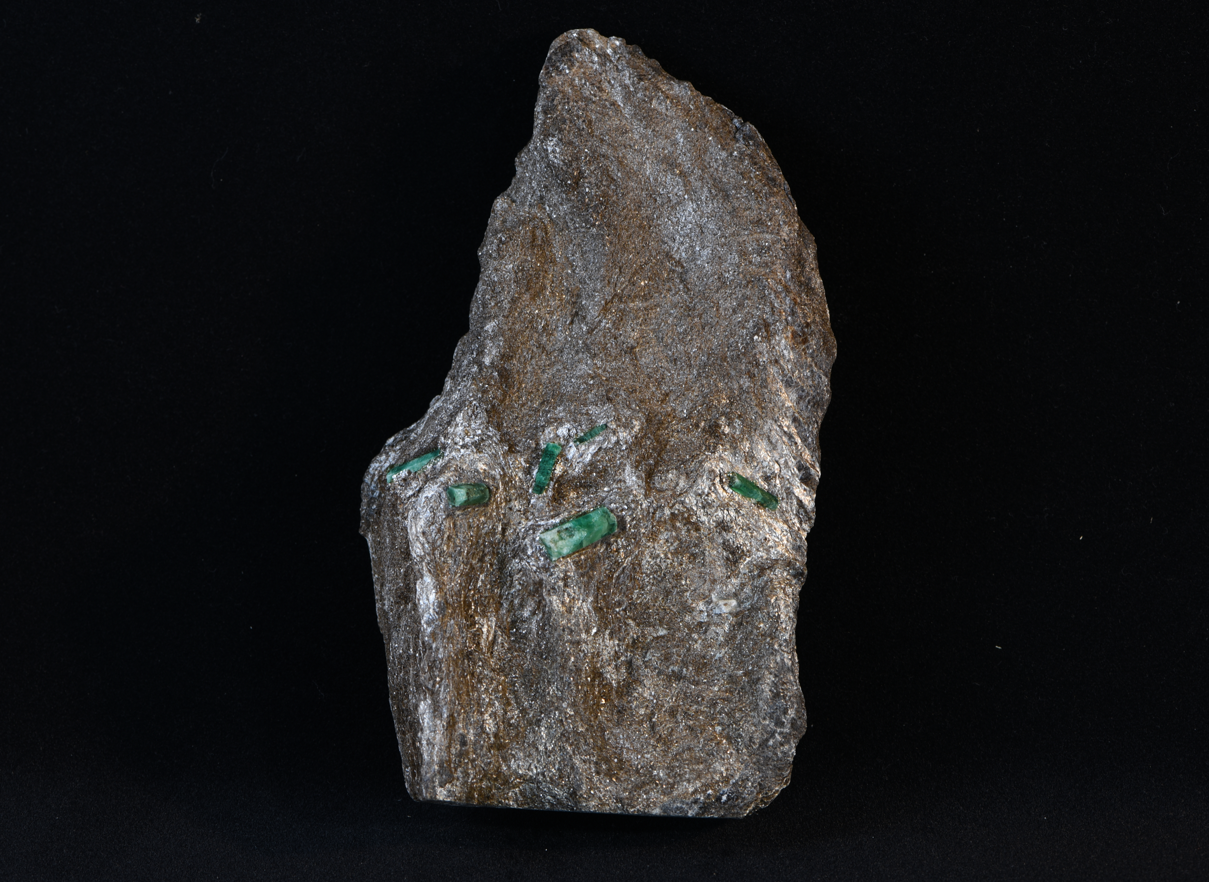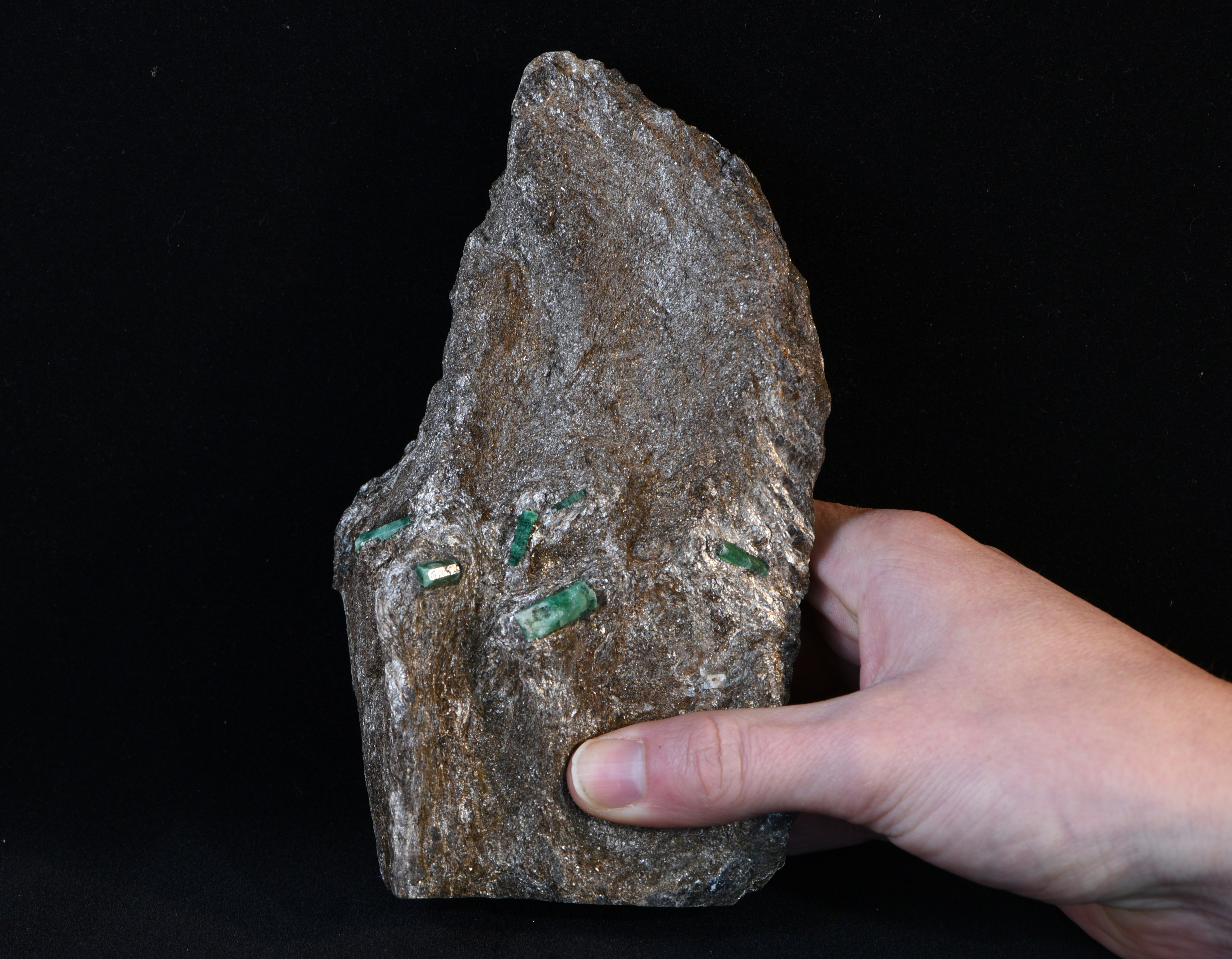 Nicht nur die Smaragde, sondern auch der Biotit-Glimmer glänzt auf dieser Stufe wunderschön.