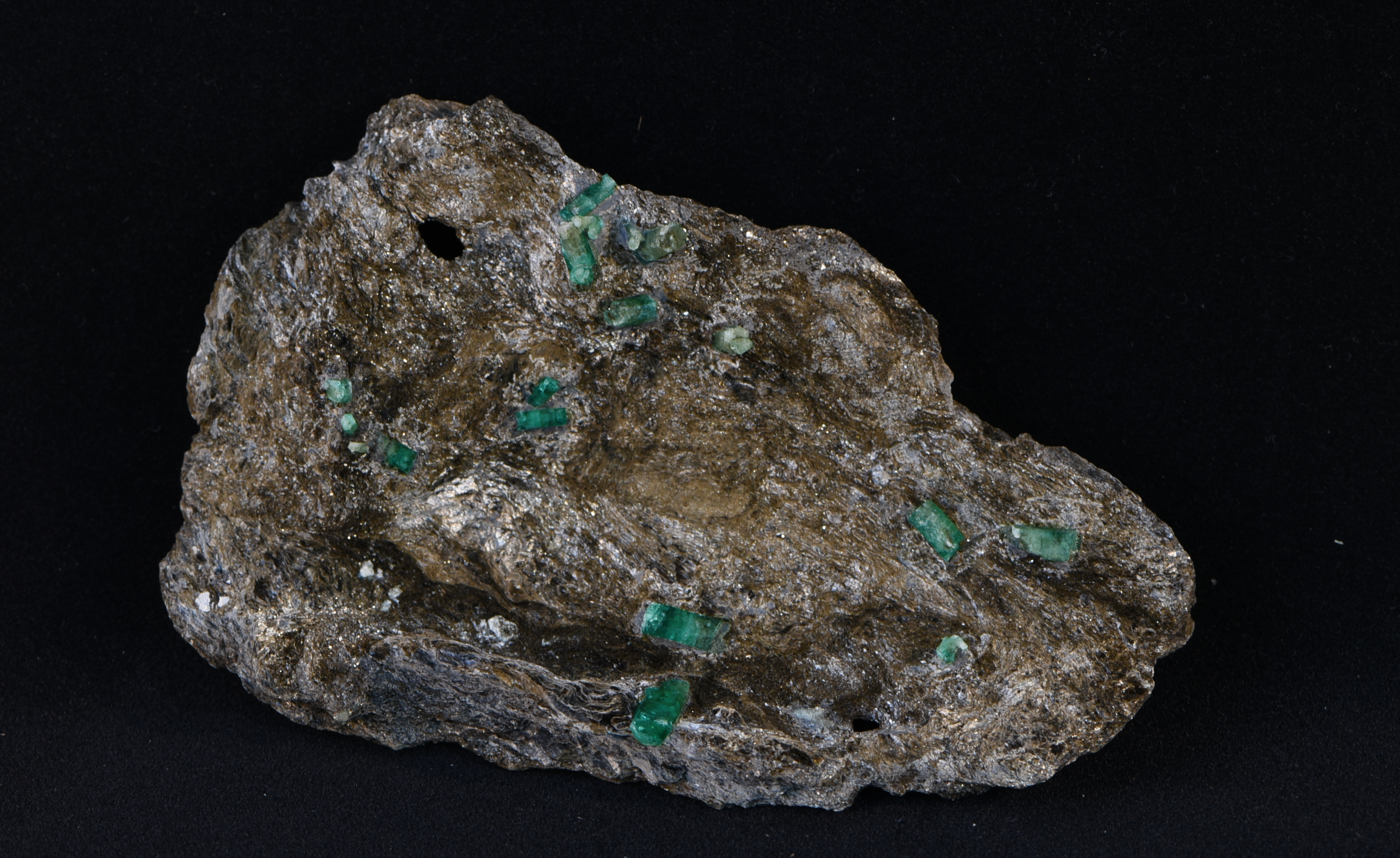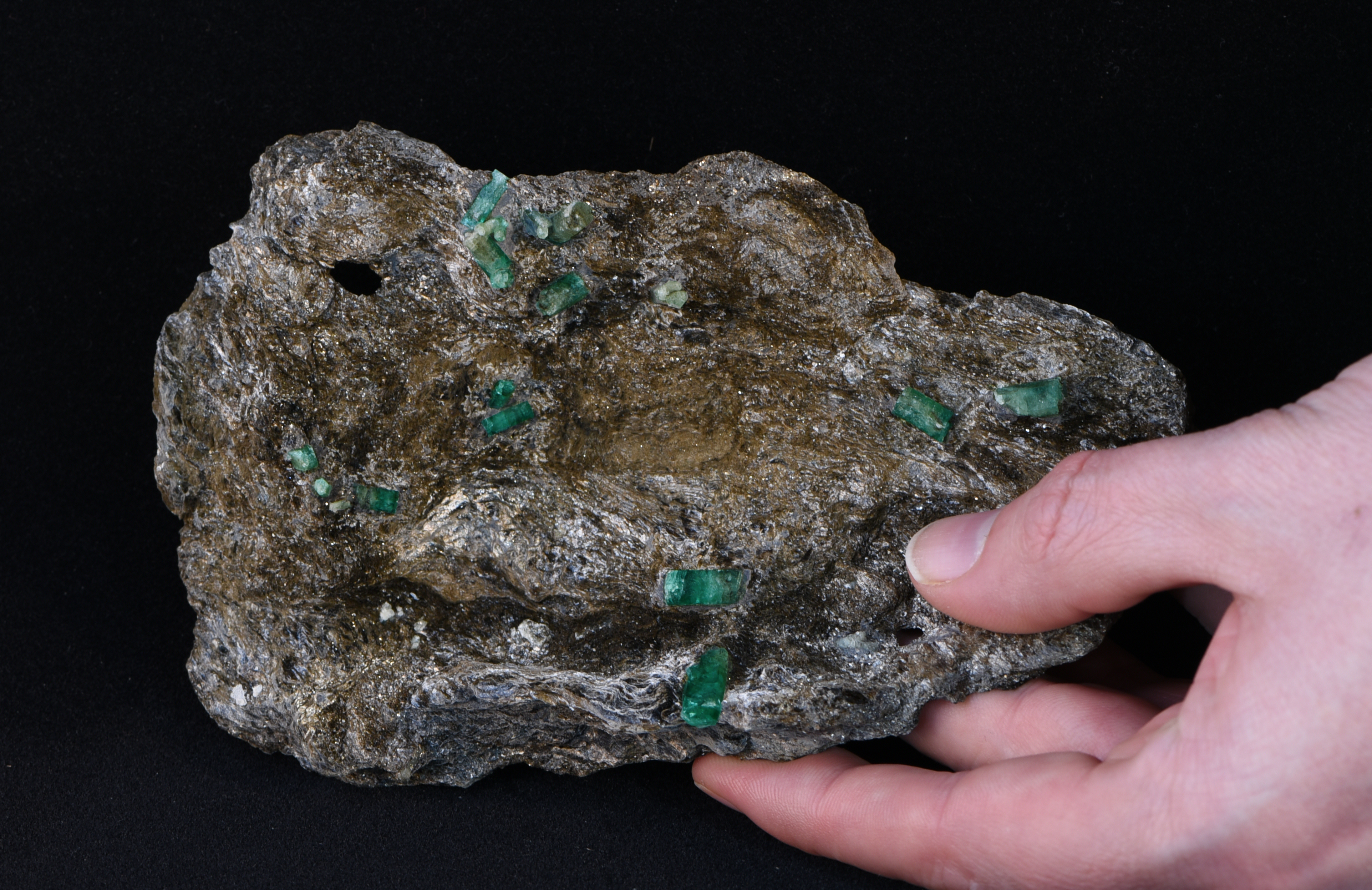 Der dunkle Biotit-Glimmer bringt einen guten Kontrast und lässt die Smaragde leuchten.