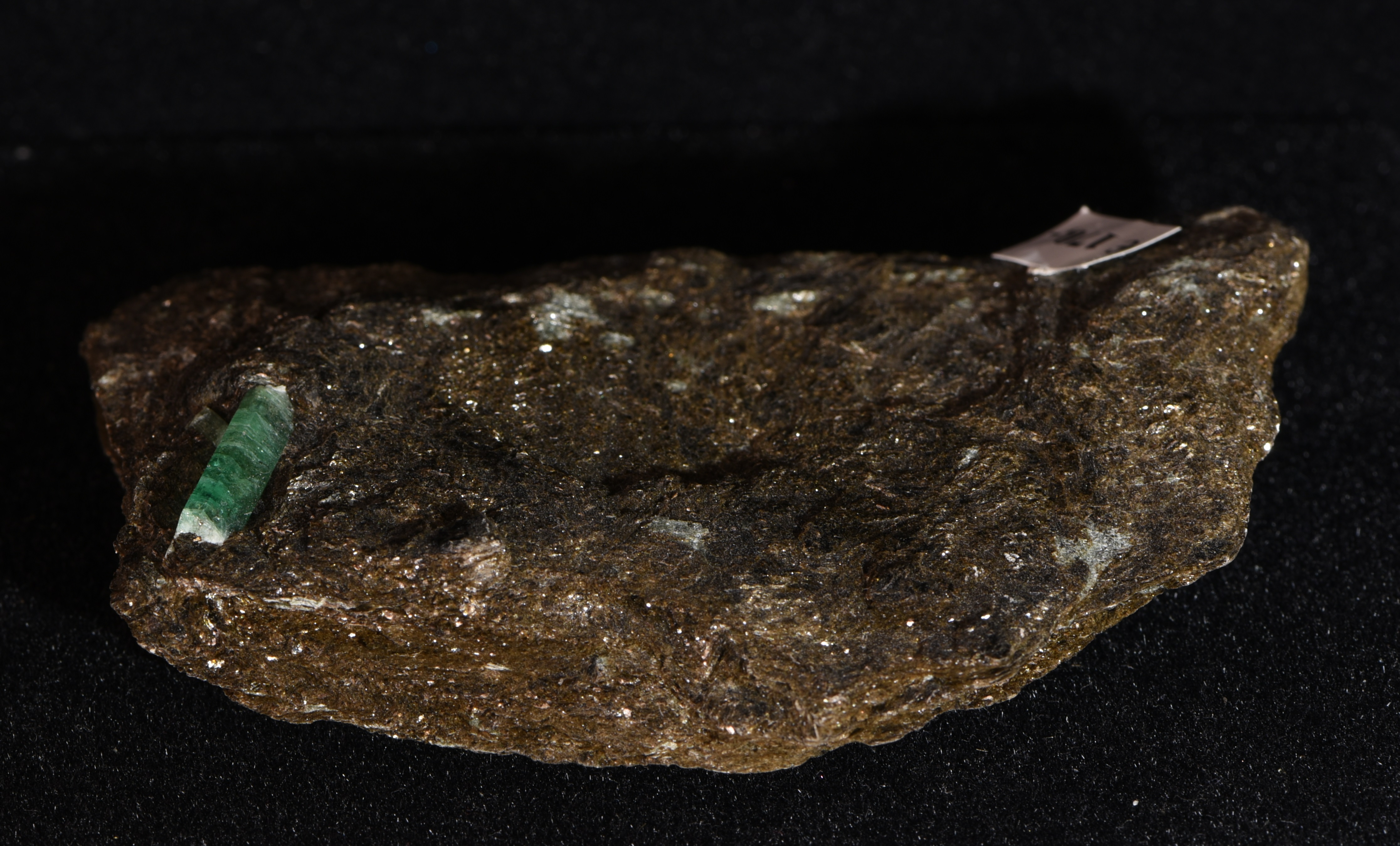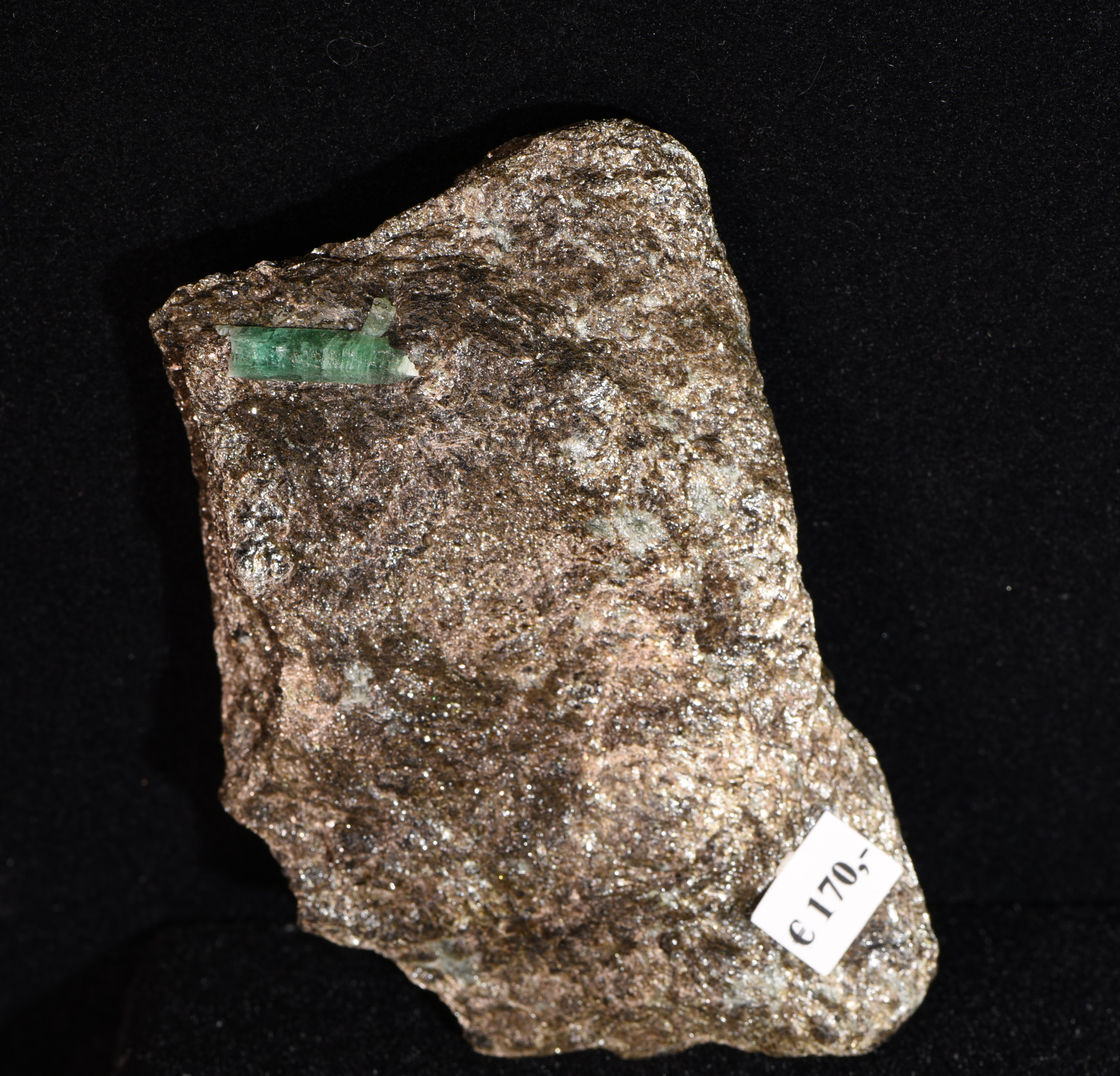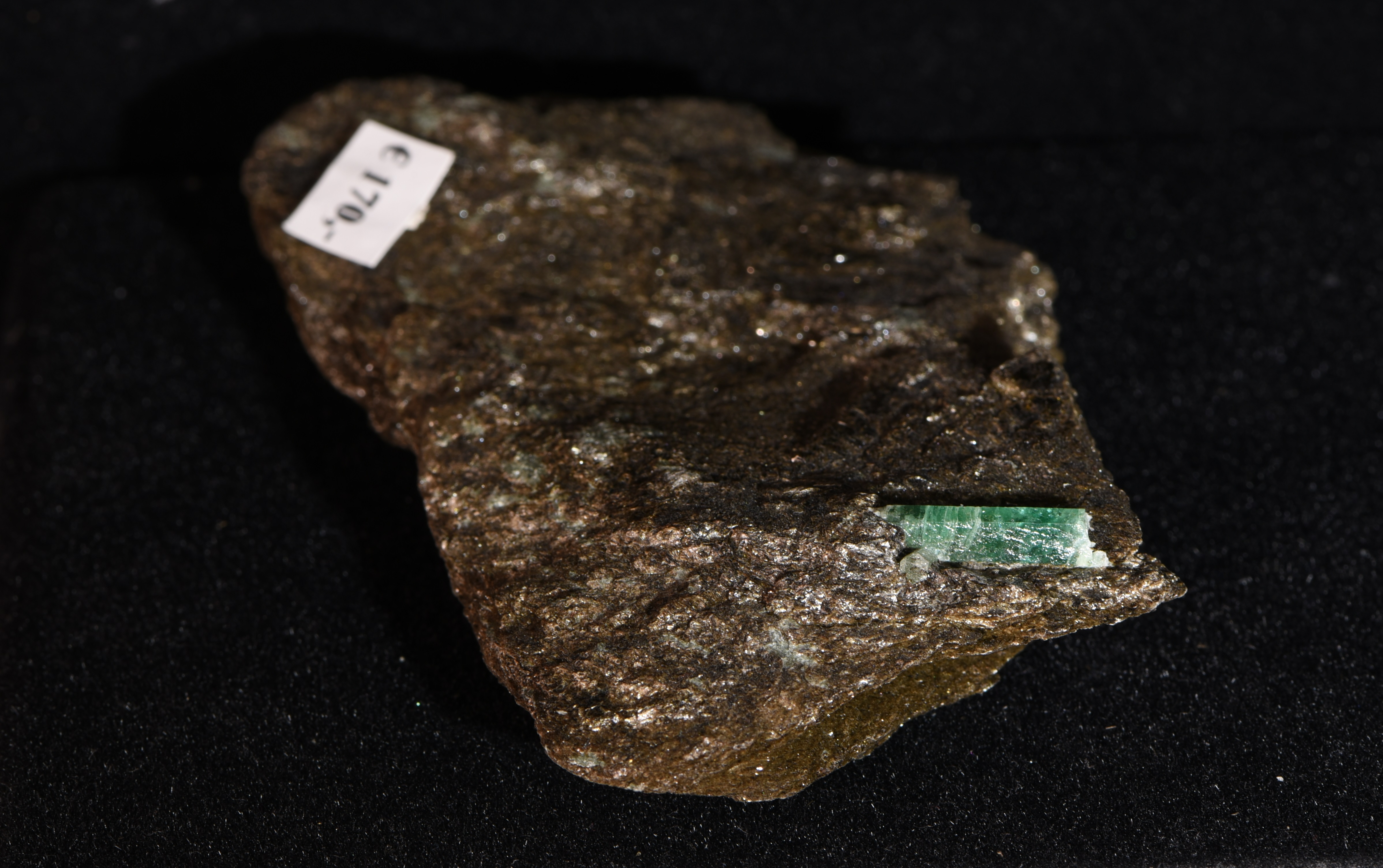 Auf dieser Stufe sitzt ein 1,4 cm langer Smaragd mit einer sehr guten, tiefgrünen Farbe. Das umliegende Muttergestein glänzt wie Silber.